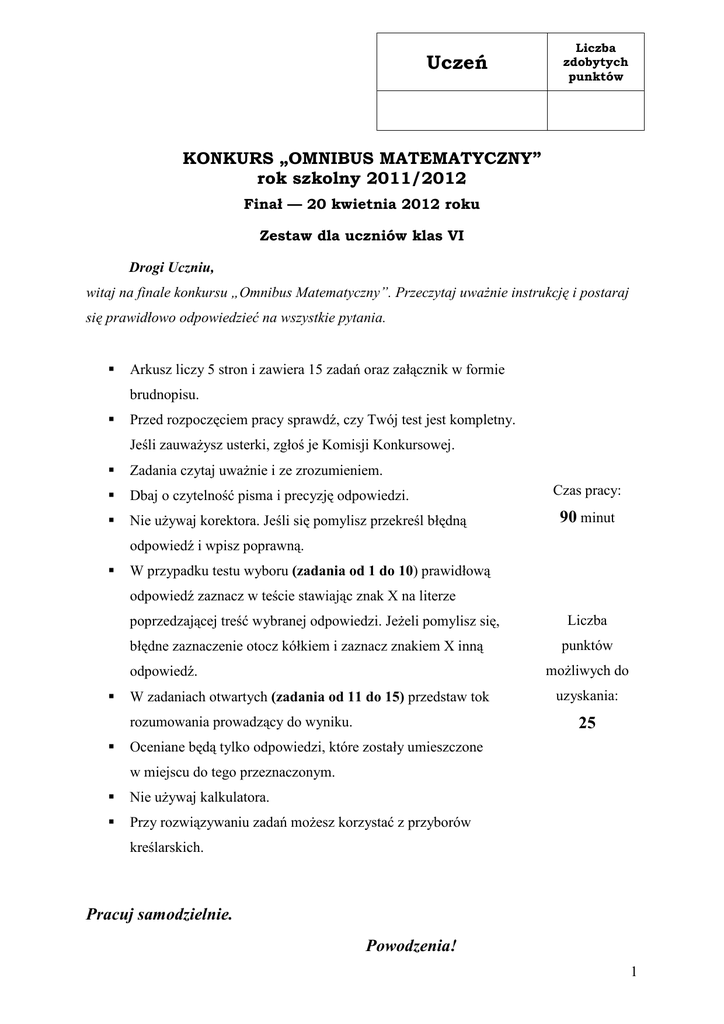 Uczeń Liczba zdobytych punktów KONKURS „OMNIBUS MATEMATYCZNY” rok szkolny 2011/2012 Finał — 20 kwietnia 2012 roku Zestaw dla uczniów klas VI Drogi Uczniu, witaj na finale konkursu „Omnibus Matematyczny”. Przeczytaj uważnie instrukcję i postaraj się prawidłowo odpowiedzieć na wszystkie pytania. Arkusz liczy 5 stron i zawiera 15 zadań oraz załącznik w formie brudnopisu. Przed rozpoczęciem pracy sprawdź, czy Twój test jest kompletny. Jeśli zauważysz usterki, zgłoś je Komisji Konkursowej. Zadania czytaj uważnie i ze zrozumieniem. Dbaj o czytelność pisma i precyzję odpowiedzi. Nie używaj korektora. Jeśli się pomylisz przekreśl błędną Czas pracy: 90 minut odpowiedź i wpisz poprawną. W przypadku testu wyboru (zadania od 1 do 10) prawidłową odpowiedź zaznacz w teście stawiając znak X na literze poprzedzającej treść wybranej odpowiedzi. Jeżeli pomylisz się, błędne zaznaczenie otocz kółkiem i zaznacz znakiem X inną Liczba punktów możliwych do odpowiedź. W zadaniach otwartych (zadania od 11 do 15) przedstaw tok rozumowania prowadzący do wyniku. uzyskania: 25 Oceniane będą tylko odpowiedzi, które zostały umieszczone w miejscu do tego przeznaczonym. Nie używaj kalkulatora. Przy rozwiązywaniu zadań możesz korzystać z przyborów kreślarskich. Pracuj samodzielnie. Powodzenia! 1 Zadanie 1. (1pkt.) Pewien prostopadłościan ma krawędzie o długościach całkowitych i ściany o polach 56, 63, 72. Najdłuższa jego krawędź ma długość: A. 7 B. 8 C. 9 D. 12 Zadanie 2. (1pkt.) Styczeń pewnego roku miał 4 poniedziałki i 4 piątki. 1 stycznia wypadł: A. w piątek B. w sobotę C. w poniedziałek D. we wtorek Zadanie 3. (1pkt.) Samochód jedzie ze stałą prędkością a km/h, zużywając b litrów paliwa na 100 km. Ile litrów paliwa zużyje ten samochód podczas c minut jazdy? A. abc 6000 B. bc 10a C. abc 100 D. bc 6000a Zadanie 4. (1pkt.) Wacek zobaczył Marka w odległości 100 m. Chłopcy pobiegli jeden do drugiego. Wacek z prędkością 4 m/s, a Marek z prędkością 5 m/s. Po jakim czasie chłopcy spotkają się? A. 9 s B. 10 s C. 11 s D. po mniej niż 12 s Zadanie 5. (1pkt.) W pudełku jest 70 kul: 20 czerwonych, 20 niebieskich, 20 zielonych, a pozostałe są żółte i białe. Ile kul trzeba wyjąć nie oglądając ich, aby mieć pewność, że będzie wśród nich 10 tego samego koloru? A. 21 B. 37 C. 60 D. 38 Zadanie 6. (1pkt.) W roku 1983 były 53 soboty. Jakim dniem tygodnia był 2 stycznia 1983? A. piątek B. sobota C. niedziela D. poniedziałek C. -3 D. Zadanie 7. (1pkt.) wartości bezwzględnej wyrażenia wynosi: A. 7 8 B. 3 1 3 2 Zadanie 8. (1pkt.) Każda para boków wielokąta jest prostopadła do siebie albo równoległa do siebie i wielokąt ten nie jest prostokątem. Wielokąt ten: A. musi być pięciokątem B. musi być kwadratem C. musi być sześciokątem D. musi mieć co najmniej jeden kąt wklęsły Zadanie 9. (1pkt.) Jeżeli a+b=70 i b+c=90 oraz a+c=80, to suma a+b+c jest równa: A. 120 B. 140 C. 150 D. 160 Zadanie 10. (1pkt.) 7 zeszytów kosztuje więcej niż 8 ołówków. Wynika stąd, że: A. 8 zeszytów kosztuje więcej niż 9 ołówków B. 8 zeszytów kosztuje mniej niż 9 ołówków C. 8 zeszytów D. 8 zeszytów kosztuje tyle samo co kosztuje więcej niż 9 ołówków 10 ołówków Zadanie 11. (0-2pkt.) Wyznacz wartość x zaznaczoną na rysunku poniżej. Odpowiedź 3 Zadanie 12. (0-3pkt.) Która jest godzina, zapytał ktoś Pitagorasa. Pozostało jeszcze z doby dwie trzecie tego dnia, co już upłynęło odpowiedział filozof. Która była godzina? Odpowiedź Zadanie 13. (0-3pkt.) Na prostokątnej działce o wymiarach jak na rysunku rośnie pszenica. Przez działkę prowadzi asfaltowa droga (zaznaczona na rys. kolorem szarym). Ile kg ziarna pszenicy rolnik zebrał z tej działki, jeśli z 1 ha zbiera 4,5 tony ziarna? Odpowiedź 4 Zadanie 14. (0-3pkt.) W pewnym trójkącie równoramiennym kąt pomiędzy dwusiecznymi jednakowych kątów jest trzy razy większy niż kąt między ramionami trójkąta. Wyznacz miary katów wewnętrznych tego trójkąta. Odpowiedź Zadanie 15. (0-4pkt.) Do basenu kąpielowego o wymiarach podanych na rysunku wlano 4500 m3 wody. Jaka była głębokość wody w najgłębszym miejscu basenu? Odpowiedź 5 Karta odpowiedzi zadań zamkniętych Zadanie A B C D 1. 2. 3. 4. 5. 6. 7. 8. 9. 10. Brudnopis 6