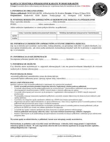KARTA UCZESTNIKA PÓŁKOLONII KARATE W DOJO KRAKÓW Uwaga:Uczestnik obozu zobowiązany jest dostarczyć wypełnioną kartę do instruktora do dnia 15.06.2016r. I. INFORMACJE ORGANIZATORA Miejsce półkolonii: DOJO KRAKÓW, ul.Racławicka 26, Kraków.Termin: 18 lipca-22 lipca 2016. Organizator: Krakowski Klub Karate Tradycyjnego Al. Grottgera 3/42 Kraków II. WNIOSEK RODZICÓW (OPIEKUNÓW) O SKIEROWANIE DZIECKA NA PÓŁKOLONIE Imię i nazwisko dziecka ............................................Data urodzenia .......................................................... PESEL: ………………………….Adres zamieszkania ................................................................................ Adres rodziców (opiekunów) w czasie pobytu dziecka na półkolonii …………………………………… ........................................................................................................................................................................ Imię i nazwisko opiekunów prawnych dziecka Telefony kontaktowe (stacjonarne i komórkowe) ojciec matka III. INFORMACJA RODZICÓW (OPIEKUNÓW) O STANIE ZDROWIA DZIECKA (np. na co dziecko jest uczulone- nazwa leku, rodzaj pokarmu, czy przyjmuje stale leki i w jakich dawkach, czy nosi aparat ortodontyczny, jak znosi jazdę autokarem, komunikacją miejską* jeśli źle to prosimy o zaopatrzenie np. w aviomarin). ............................................................................................................................................................................... IV. INFORMACJA O SZCZEPIENIACH Szczepienia ochronne (podać rok): tężec…………błonica……..……krztusiec……….inne…………... V. INFORMACJE OGÓLNE Czy dziecko może uczestniczyć w zajęciach rekreacyjnych i nie ma przeciwwskazań lekarskich do ćwiczeń ruchowych w formie rekreacyjnej.................................................................................................... Powrót dziecka do domu: -uczestnik półkolonii samodzielnie wraca do domu tak/nie, -uczestnik będzie odbierany przez: (proszę wpisać imię i nazwisko)………………………………………….. REGULAMIN PÓŁKOLONII (prosimy rodziców oraz uczestnika półkolonii o zapoznanie się z poniższymi zasadami) Każdy uczestnik powinien posiadać książeczkę zdrowia i legitymacje szkolną podczas półkolonii. Uczestnik zobowiązany jest do podporządkowania się wychowawcom i kierownikowi półkolonii oraz przestrzegania obowiązujących zasad korzystania z DOJO i innych miejsc w których odbywają się zajęcia. Uczestnik zobowiązany jest stosować się do przepisów i regulaminów obowiązujących w DOJO i innych miejscach przebywania. W przypadku rażącego naruszenia regulaminu półkolonii, uczestnik zostanie odprawiony do domu na koszt rodziców, pod opieką opiekuna. Uczestnicy nie mogą bez zgody opiekunów oddalać się z DOJO oraz miejsca prowadzenia zajęć. Organizator nie ponosi odpowiedzialności za sprzęt elektroniczny i inne rzeczy zagubione przez Uczestnika podczas trwania półkolonii lub pozostawione przez niego w środkach transportu. Organizator nie ponosi odpowiedzialności za pieniądze posiadane przez Uczestnika podczas trwania półkolonii, jeśli po przybyciu do DOJO nie zostały one oddane opiekunowi do depozytu. Uczestnik bez zgody i nadzoru opiekuna nie może korzystać ze sprzętu sportowo-rekreacyjnego. Podczas półkolonii obowiązuje całkowity zakaz używania telefonu komórkowego, tabletów i laptopów. Rodzice zobowiązani są do punktualnego przyprowadzenia uczestnika na miejsce półkolonii i odebrania go po zakończeniu programu dnia. Wyrażam zgodę na udział dziecka w półkolonii karate oraz akceptuję zasady uczestnictwa. Potwierdzam, że podałem (-am) wszystkie znane mi informacje o dziecku, które mogą pomóc w zapewnieniu właściwej opieki na obozie. W razie zagrożenia zdrowia lub życia dziecka zgadzam się na jego leczenie szpitalne, zabiegi diagnostyczne i operacje. ............................................ data i podpis opiekuna prawnego ............................................ podpis uczestnika półkolonii