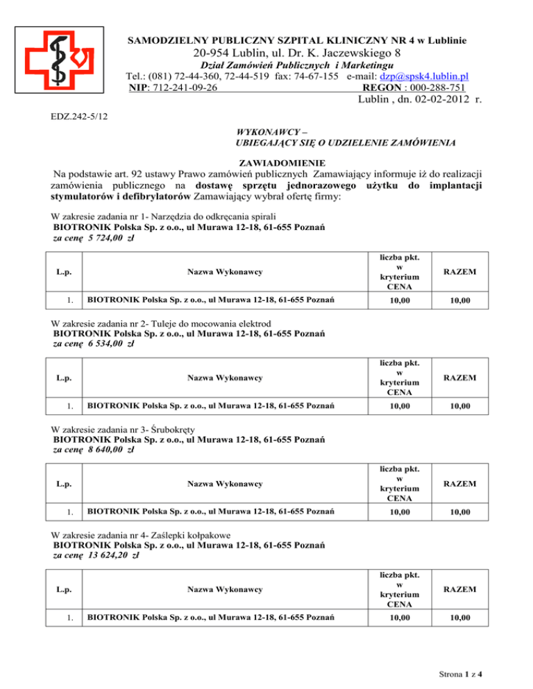 SAMODZIELNY PUBLICZNY SZPITAL KLINICZNY NR 4 w Lublinie 20-954 Lublin, ul. Dr. K. Jaczewskiego 8 Dział Zamówień Publicznych i Marketingu Tel.: (081) 72-44-360, 72-44-519 fax: 74-67-155 e-mail: [email protected] NIP: 712-241-09-26 REGON : 000-288-751 Lublin , dn. 02-02-2012 r. EDZ.242-5/12 WYKONAWCY – UBIEGAJĄCY SIĘ O UDZIELENIE ZAMÓWIENIA ZAWIADOMIENIE Na podstawie art. 92 ustawy Prawo zamówień publicznych Zamawiający informuje iŜ do realizacji zamówienia publicznego na dostawę sprzętu jednorazowego uŜytku do implantacji stymulatorów i defibrylatorów Zamawiający wybrał ofertę firmy: W zakresie zadania nr 1- Narzędzia do odkręcania spirali BIOTRONIK Polska Sp. z o.o., ul Murawa 12-18, 61-655 Poznań za cenę 5 724,00 zł L.p. 1. Nazwa Wykonawcy BIOTRONIK Polska Sp. z o.o., ul Murawa 12-18, 61-655 Poznań liczba pkt. w kryterium CENA RAZEM 10,00 10,00 liczba pkt. w kryterium CENA RAZEM 10,00 10,00 liczba pkt. w kryterium CENA RAZEM 10,00 10,00 liczba pkt. w kryterium CENA RAZEM 10,00 10,00 W zakresie zadania nr 2- Tuleje do mocowania elektrod BIOTRONIK Polska Sp. z o.o., ul Murawa 12-18, 61-655 Poznań za cenę 6 534,00 zł L.p. 1. Nazwa Wykonawcy BIOTRONIK Polska Sp. z o.o., ul Murawa 12-18, 61-655 Poznań W zakresie zadania nr 3- Śrubokręty BIOTRONIK Polska Sp. z o.o., ul Murawa 12-18, 61-655 Poznań za cenę 8 640,00 zł L.p. 1. Nazwa Wykonawcy BIOTRONIK Polska Sp. z o.o., ul Murawa 12-18, 61-655 Poznań W zakresie zadania nr 4- Zaślepki kołpakowe BIOTRONIK Polska Sp. z o.o., ul Murawa 12-18, 61-655 Poznań za cenę 13 624,20 zł L.p. 1. Nazwa Wykonawcy BIOTRONIK Polska Sp. z o.o., ul Murawa 12-18, 61-655 Poznań Strona 1 z 4 W zakresie zadania nr 5- Zaślepki wtykane BIOTRONIK Polska Sp. z o.o., ul Murawa 12-18, 61-655 Poznań za cenę 7 128,00 zł L.p. 1. Nazwa Wykonawcy BIOTRONIK Polska Sp. z o.o., ul Murawa 12-18, 61-655 Poznań liczba pkt. w kryterium CENA RAZEM 10,00 10,00 liczba pkt. w kryterium CENA RAZEM 10,00 10,00 liczba pkt. w kryterium CENA RAZEM 10,00 10,00 liczba pkt. w kryterium CENA RAZEM 10,00 10,00 W zakresie zadania nr 6-Medyczny klej silikonowy BIOTRONIK Polska Sp. z o.o., ul Murawa 12-18, 61-655 Poznań za cenę 21 600,00 zł L.p. 1. Nazwa Wykonawcy BIOTRONIK Polska Sp. z o.o., ul Murawa 12-18, 61-655 Poznań W zakresie zadania nr 7- Zestaw do cewnikowania zatoki wieńcowej Medtronic Poland Sp. z o.o., ul. Ostrobramska 101, 04-041 Warszawa za cenę 12 960,00 zł L.p. 1. Nazwa Wykonawcy Medtronic Poland Sp. z o.o., ul. Ostrobramska 101, 04-041 Warszawa W zakresie zadania nr 10-Adaptery BIOTRONIK Polska Sp. z o.o., ul Murawa 12-18, 61-655 Poznań za cenę 23 490,00 zł L.p. 1. Nazwa Wykonawcy BIOTRONIK Polska Sp. z o.o., ul Murawa 12-18, 61-655 Poznań W zakresie zadania nr 11-Elektrody diagnostyczne o zmiennej krzywiźnie do zatoki wieńcowej z dostępu dolnego BARD Poland Sp. z o.o., ul. Cybernetyki 7B, 02-677 Warszawa za cenę 53 249,40 zł L.p. Nazwa Wykonawcy liczba pkt. w kryterium CENA RAZEM 1. BARD Poland Sp. z o.o., ul. Cybernetyki 7B, 02-677 Warszawa 10,00 10,00 2. BIOTRONIK Polska Sp. z o.o., ul Murawa 12-18, 61-655 Poznań 9,84 9,84 3. Medtronic Poland Sp. z o.o., ul. Ostrobramska 101, 04-041 Warszawa 7,86 7,86 4. Johnson & Johnson Poland Sp. z o.o., ul. IłŜecka 24, 02-135 Warszawa 9,67 9,67 W zakresie zadania nr 12-Elektrody ablacyjne o głębokiej penetracji BIOTRONIK Polska Sp. z o.o., ul Murawa 12-18, 61-655 Poznań za cenę 86 184,00 zł Strona 2 z 4 L.p. 1. Nazwa Wykonawcy liczba pkt. w kryterium CENA liczba pkt. w kryterium JAKOŚĆ RAZEM BIOTRONIK Polska Sp. z o.o., ul Murawa 12-18, 61-655 Poznań 7,00 3,00 10,00 Nazwa Wykonawcy liczba pkt. w kryterium CENA liczba pkt. w kryterium JAKOŚĆ RAZEM BIOTRONIK Polska Sp. z o.o., ul Murawa 12-18, 61-655 Poznań 7,00 3,00 10,00 W zakresie zadania nr 13-Elektrody ablacyjne irygowane BIOTRONIK Polska Sp. z o.o., ul Murawa 12-18, 61-655 Poznań za cenę 89 424,00 zł L.p. 1. W zakresie zadania nr 14- Elektrody ablacyjne 10-polowe do izolacji okręŜnej Ŝył płucnych Medtronic Poland Sp. z o.o., ul. Ostrobramska 101, 04-041 Warszawa za cenę 89 856,00 zł L.p. 1. Nazwa Wykonawcy Medtronic Poland Sp. z o.o., ul. Ostrobramska 101, 04-041 Warszawa liczba pkt. w kryterium CENA RAZEM 10,00 10,00 W zakresie zadania nr 16- Igły do punkcji transseptalnych HAMMERMED Spółka z ograniczoną odpowiedzialnością Spółka komandytowa, ul. Kopcińskiego 73/75, 90-033 Łódź za cenę 5 184,00 zł L.p. Nazwa Wykonawcy liczba pkt. w kryterium CENA RAZEM 1. Medtronic Poland Sp. z o.o., ul. Ostrobramska 101, 04-041 Warszawa 4,36 4,36 2. HAMMERMED Spółka z ograniczoną odpowiedzialnością Spółka komandytowa, ul. Kopcińskiego 73/75, 90-033 Łódź 10,00 10,00 3. Johnson & Johnson Poland Sp. z o.o., ul. IłŜecka 24, 02-135 Warszawa 6,08 6,08 PowyŜsze oferty spełniały warunki określone w SIWZ i uzyskały najwyŜszą liczbę punktów za kryteria oceny ofert. OFERTY ODRZUCONE Na podstawie art. 89 ust. 1 pkt. 2 ustawy Pzp Zamawiający odrzucił ofertę firmy: Johnson & Johnson Poland Sp. z o.o. ul. IłŜecka 24 02-135 Warszawa • W zakresie Zadania nr 13. Elektrody ablacyjne irygowane Zamawiający w pkt. V.2 ppkt. 5) SIWZ wymagał, aby Wykonawca dołączył do oferty wypełnioną tabelę parametrów odcinających ( granicznych) i podlegających ocenie jakościowej. Strona 3 z 4 Wykonawca nie dołączył do swojej oferty takiej tabeli, zaś Zamawiający nie był uprawniony do uzupełnienie tych informacji na podstawie art. 26 ust. 3 ustawy Pzp, z uwagi na fakt, iŜ dokument taki nie jest uwzględniony w treści rozporządzenia Prezesa Rady Ministrów dotyczącego rodzaju dokumentów, jakich moŜe Ŝądać Zamawiający od Wykonawcy, oraz formy, w jakich dokumenty te mogą być składane. W związku z powyŜszym treść oferty dla zadania nr 13 nie odpowiada treści SIWZ. • W zakresie Zadania nr 17. Elektrody diagnostyczne o stałej krzywiźnie 4-polowe Zamawiający w specyfikacji przedmio