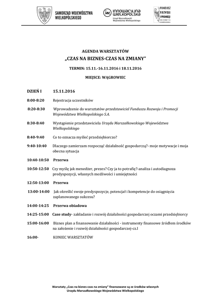 AGENDA WARSZTATÓW „CZAS NA BIZNES-CZAS NA ZMIANY” TERMIN: 15.11.-16.11.2016 i 18.11.2016 MIEJSCE: WĄGROWIEC DZIEŃ I 15.11.2016 8:00-8:20 Rejestracja uczestników 8:20-8:30 Wprowadzenie do warsztatów-przedstawiciel Funduszu Rozwoju i Promocji Województwa Wielkopolskiego S.A. 8:30-8:40 Wystąpienie przedstawiciela Urzędu Marszałkowskiego Województwa Wielkopolskiego 8:40-9:40 Co to oznacza myśleć przedsiębiorczo? 9:40-10:40 Dlaczego zamierzam rozpocząć działalność gospodarczą?- moje motywacje i moja obecna sytuacja 10:40-10:50 Przerwa 10:50-12:50 Czy myślę jak menedżer, prezes? Czy ja to potrafię?-analiza i autodiagnoza predyspozycji, własnych możliwości i umiejętności 12:50-13:00 Przerwa 13:00-14:00 Jak określić swoje predyspozycje, potencjał i kompetencje do osiągnięcia zaplanowanego sukcesu? 14:00-14:25 Przerwa obiadowa 14:25-15:00 Case study- zakładanie i rozwój działalności gospodarczej oczami przedsiębiorcy 15:00-16:00 Biznes plan a finansowanie działalności - instrumenty finansowe źródłem środków na założenie i rozwój działalności gospodarczej-cz.I 16:00- KONIEC WARSZTATÓW Warsztaty „Czas na biznes-czas na zmiany” finansowane są ze środków własnych Urzędu Marszałkowskiego Województwa Wielkopolskiego DZIEŃ II 16.11.2016 8:00-10:00 Mój pomysł na biznes a wybór modelu biznesowego cz. I 10:00-10:10 Przerwa 10:10-11:25 Mój pomysł na biznes a wybór modelu biznesowego cz. II 11:25-11:35 Przerwa 11:35-12:35 Droga od potencjalnego do rzeczywistego Klienta - poszukiwanie przyszłych odbiorców, budowanie i zarządzanie relacjami 12:35-13:00 Przerwa obiadowa 13:00-14:30 Biznes plan a finansowanie działalności - instrumenty finansowe źródłem środków na założenie i rozwój działalności gospodarczej cz. II 14:30-14:40 Przerwa 14:40-16:00 ABC zakładania działalności gospodarczej - formalne aspekty prowadzenia działalności gospodarczej 16:00 KONIEC WARSZTATÓW DZIEŃ III 18.11.2016 8:00-10:00 Podsumowanie dwóch pierwszych dni warsztatowych i ćwiczenia praktyczne 10:00-10:15 Przerwa 10:15-12:15 Ćwiczenia praktyczne 12:15-12:30 Przerwa 12:30-14:30 Ćwiczenia praktyczne 14:30-15:00 Przerwa Obiadowa 15:00-16:00 Wnioski z przeprowadzonych warsztatów 16:00 KONIEC WARSZTATÓW Warsztaty „Czas na biznes-czas na zmiany” finansowane są ze środków własnych Urzędu Marszałkowskiego Województwa Wielkopolskiego