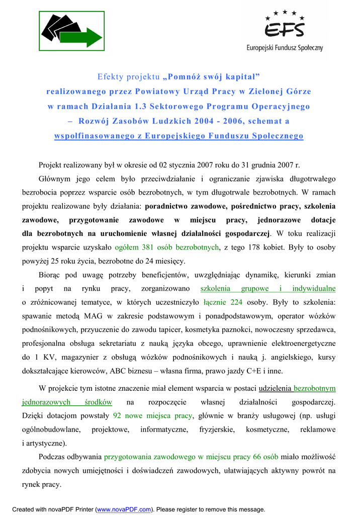 Efekty projektu „Pomnóż swój kapitał” realizowanego przez Powiatowy Urząd Pracy w Zielonej Górze w ramach Działania 1.3 Sektorowego Programu Operacyjnego – Rozwój Zasobów Ludzkich 2004 - 2006, schemat a wspołfinasowanego z Europejskiego Funduszu Społecznego Projekt realizowany był w okresie od 02 stycznia 2007 roku do 31 grudnia 2007 r. Głównym jego celem było przeciwdziałanie i ograniczanie zjawiska długotrwałego bezrobocia poprzez wsparcie osób bezrobotnych, w tym długotrwale bezrobotnych. W ramach projektu realizowane były działania: poradnictwo zawodowe, pośrednictwo pracy, szkolenia zawodowe, przygotowanie zawodowe w miejscu pracy, jednorazowe dotacje dla bezrobotnych na uruchomienie własnej działalności gospodarczej. W toku realizacji projektu wsparcie uzyskało ogółem 381 osób bezrobotnych, z tego 178 kobiet. Były to osoby powyżej 25 roku życia, bezrobotne do 24 miesięcy. Biorąc pod uwagę potrzeby beneficjentów, uwzględniając dynamikę, kierunki zmian i popyt na rynku pracy, zorganizowano szkolenia grupowe i indywidualne o zróżnicowanej tematyce, w których uczestniczyło łącznie 224 osoby. Były to szkolenia: spawanie metodą MAG w zakresie podstawowym i ponadpodstawowym, operator wózków podnośnikowych, przyuczenie do zawodu tapicer, kosmetyka paznokci, nowoczesny sprzedawca, profesjonalna obsługa sekretariatu z nauką języka obcego, uprawnienie elektroenergetyczne do 1 KV, magazynier z obsługą wózków podnośnikowych i nauką j. angielskiego, kursy dokształcające kierowców, ABC biznesu – własna firma, prawo jazdy C+E i inne. W projekcie tym istotne znaczenie miał element wsparcia w postaci udzielenia bezrobotnym jednorazowych środków na rozpoczęcie własnej działalności gospodarczej. Dzięki dotacjom powstały 92 nowe miejsca pracy, głównie w branży usługowej (np. usługi ogólnobudowlane, projektowe, informatyczne, fryzjerskie, kosmetyczne, reklamowe i artystyczne). Podczas odbywania przygotowania zawodowego w miejscu pracy 66 osób miało możliwość zdobycia nowych umiejętności i doświadczeń zawodowych, ułatwiających aktywny powrót na rynek pracy. Created with novaPDF Printer (www.novaPDF.com). Please register to remove this message. Dodatkowo - wsparcie towarzyszące przewidziane w projekcie uzyskało: stypendia – 66 osób, dodatki szkoleniowe – 224 osoby, zwrot kosztów dojazdu z miejsca zamieszkania do miejsca odbywania szkolenia lub przygotowania zawodowego – 162 osoby, zwrot kosztów badań lekarskich – 125 osób. Spośród ogółu osób uczestniczących w projekcie 73 % dzięki zaoferowanym formom wsparcia podniosło (bądź uzupełniło, zaktualizowało) swoje kwalifikacje, uzyskując na tę okoliczność dyplomy, świadectwa, zaświadczenia, czy też certyfikaty. Przeprowadzono badania ankietowe przed rozpoczęciem i po zakończeniu udziału w projekcie, które dały obraz problemów z którymi beneficjenci borykają się na rynku pracy i oczekiwań w stosunku do projektu oraz obraz rezultatów zaoferowanych form pomocy. Rozpoczynając udział w projekcie beneficjenci (378 osób ankietowanych) określili trudności, które napotykają podczas poszukiwania zatrudnienia: na pierwszym miejscu wskazali brak odpowiednich kwalifikacji (49 %), brak odpowiedniego doświadczenia (41 %), trudności spowodowane wiekiem (30 %). Blisko 16 % osób uznało, że opieka nad dziećmi lub osobami zależnymi jest czynnikiem utrudniającym podjęcie pracy. Stąd też zdecydowana większość ankietowanych oczekiwała pomocy w przełamaniu tego typu barier i dzięki temu ponownego wejścia na rynek pracy. Kończąc zaplanowaną ścieżkę aktywizacji przeważająca większość ankietowanych (87 %) opowiedziała się za tym, że projekt zwiększył ich szanse na znalezienie zatrudnienia. Usługi świadczone w projekcie spełniły oczekiwania 85 % ankietowanych. Projekt umożliwił beneficjentom zdobyć nowe doświadczenie w zawodzie, nową specjalistyczną wiedzę, nowe umiejętności. Ponadto, w katalogu korzyści, które przyniósł udział w projekcie znalazły się także: poprawa umiejętności interpersonalnych, zdobycie wiedzy w zakresie poszukiwania pracy, zwiększenie aktywności na rynku pracy, zwiększenie poczucia własnej wartości, wiara we własne możliwości, lepsze radzenie sobie w rozwiązywaniu pojawiających się problemów, poprawa wyglądu i prezencji. Analiza badań ankietowych i osiągniętych wskaźników pozwala wysnuć wniosek, iż projekt spełnił oczekiwania bezrobotnych. W imiennych opiniach uczestnicy projektu wskazali nawet, że projekt umożliwił im realizację osobistych marzeń. Jeden z uczestników szkoleń napisał: „Uważam, że był to dobry pomysł, ponieważ pozwolił mi spełnić jedno z moich marzeń i również rozszerzył moje zainteresowania. Uzyskując te uprawnienia, może szybciej znajdę pracę”. Created with novaPDF Printer (www.novaPDF.com). Please register to remove this message. Kilka opinii uczestników projektu: „Mój pomysł na samozatrudnienie okazał się trafiony i doceniony. Otrzymałem dotację na rozpoczęcie działalności, która w znaczący sposób ułatwi mi start.”; „Dzięki temu programowi zdobyłam nowe (mężczyzna, dotacja) doświadczenie, wyspecjalizowałam się w nieznanym mi do tej pory zakresie. Jestem zadowolona. Szukając przyszłego pracodawcy zdecydowanie reklamowałam taką formę zatrudnienia (przygotowanie). Odwiedziłam wiele firm, ale udało się.” (kobieta, przygotowanie zawodowe) „Otrzymałem możliwość kształcenia się w bardzo poszukiwanym na rynku pracy zawodzie spawacza, a tym samym dobrze płatnej pracy. Natychmiastowe zatrudnienie w pełnym etacie i perspektywę na przyszłość” (mężczyzna, szkolenie) „Kurs jak najbardziej przyniósł mi korzyści, ponieważ ten rodzaj kosmetyki bardzo mnie interesuje, jak również rozwinął moje zainteresowania do wgłębiania się w inne etapy kosm