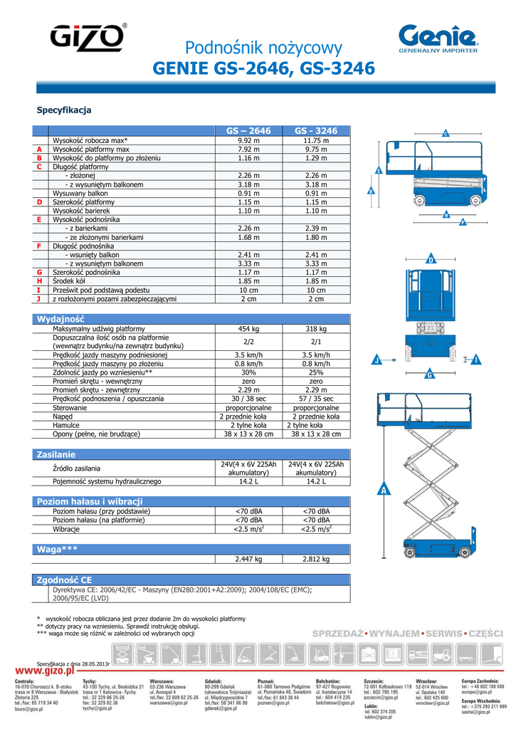 Podnośnik nożycowy GENIE GS-2646, GS-3246 Specyfikacja A B C D E F G H I J Wysokość robocza max* Wysokość platformy max Wysokość do platformy po złożeniu Długość platformy - złożonej - z wysuniętym balkonem Wysuwany balkon Szerokość platformy Wysokość barierek Wysokość podnośnika - z barierkami - ze złożonymi barierkami Długość podnośnika - wsunięty balkon - z wysuniętym balkonem Szerokość podnośnika Środek kół Prześwit pod podstawą podestu z rozłożonymi pozami zabezpieczającymi GS – 2646 GS - 3246 9.92 m 7.92 m 1.16 m 11.75 m 9.75 m 1.29 m 2.26 3.18 0.91 1.15 1.10 2.26 3.18 0.91 1.15 1.10 m m m m m m m m m m 2.26 m 1.68 m 2.39 m 1.80 m 2.41 m 3.33 m 1.17 m 1.85 m 10 cm 2 cm 2.41 m 3.33 m 1.17 m 1.85 m 10 cm 2 cm 454 kg 318 kg 2/2 2/1 Wydajność Maksymalny udźwig platformy Dopuszczalna ilość osób na platformie (wewnątrz budynku/na zewnątrz budynku) Prędkość jazdy maszyny podniesionej Prędkość jazdy maszyny po złożeniu Zdolność jazdy po wzniesieniu** Promień skrętu - wewnętrzny Promień skrętu - zewnętrzny Prędkość podnoszenia / opuszczania Sterowanie Napęd Hamulce Opony (pełne, nie brudzące) 3.5 km/h 0.8 km/h 30% zero 2.29 m 30 / 38 sec proporcjonalne 2 przednie koła 2 tylne koła 38 x 13 x 28 cm 3.5 km/h 0.8 km/h 25% zero 2.29 m 57 / 35 sec proporcjonalne 2 przednie koła 2 tylne koła 38 x 13 x 28 cm 24V(4 x 6V 225Ah akumulatory) 14.2 L 24V(4 x 6V 225Ah akumulatory) 14.2 L <70 dBA <70 dBA <2.5 m/s2 <70 dBA <70 dBA <2.5 m/s2 2.447 kg 2.812 kg Zasilanie Źródło zasilania Pojemność systemu hydraulicznego Poziom hałasu i wibracji Poziom hałasu (przy podstawie) Poziom hałasu (na platformie) Wibracje Waga*** Zgodność CE Dyrektywa CE: 2006/42/EC - Maszyny (EN280:2001+A2:2009); 2004/108/EC (EMC); 2006/95/EC (LVD) * wysokość robocza obliczana jest przez dodanie 2m do wysokości platformy ** dotyczy pracy na wzniesieniu. Sprawdź instrukcję obsługi. *** waga może się różnić w zależności od wybranych opcji Specyfikacja z dnia 28.05.2013r Podnośnik nożycowy GENIE GS-2646, GS-3246 CHARAKTERYSTYKA Standardowe wyposażenie GS-2646 9.92 m – wysokość robocza do 454 kg udźwigu platformy GS-3246 11.75 m – wysokość robocza do 318 kg udźwigu platformy Opcje dodatkowe - Bezobsługowe baterie żelowe, standardowy prostownik przystosowany jest do obsługi obu typu baterii - Zabezpieczenie linii 230 V doprowadzonej do platformy (wtyczka, gniazdo, wyłącznik różnicowoprądowy, pomiary elektryczne) Linia pneumatyczna doprowadzona do platformy Platforma - 2.26 x 1.15 m stalowa platforma 0.91 m wysuwany balkon Wyposażenie - - manewrowość dzięki dużemu skrętowi kół hamulce tarczowe ułatwiają łagodne zmniejszenie prędkości proporcjonalne sterowanie prędkością jazdy system sterowania Smart Link™ joystick ze wskaźnikiem stopnia naładowania baterii wbudowany system diagnostyczny informuje operatora o awariach czujnik przechylenia z alarmem dźwiękowym czujnik wagi z alarmem dźwiękowym płozy zabezpieczające przed wywróceniem podnośnika przycisk awaryjnego zatrzymania na platformie i panelu dolnym ręczny zawór awaryjnego opuszczania platformy wytrzymałe stalowe barierki ochronne z otwieraną bramką wejścia na platformę oraz antypoślizgowa powierzchnia platformy wysuwane zasobniki na komponenty hydrauliczne i elektroniczne ułatwiają dostęp dla serwisu uchwyty do unoszenia dźwigiem licznik roboczogodzin linia 230 V doprowadzona do platformy(niezabezpieczona) automatyczna ładowarka akumulatorów – standardowa wtyczka na 230 V Zasilanie - 24 V DC - zestaw 4 akumulatorów uniwersalna ładowarka 20 Amp możliwość obsługi baterii kwasowych i żelowych Koła - pełne, lane, niebrudzące Napęd - napęd na 2 koła przednie - Alarm jazdy podnośnika Biodegradowalny olej hydrauliczny - Podwójne światła ostrzegawcze