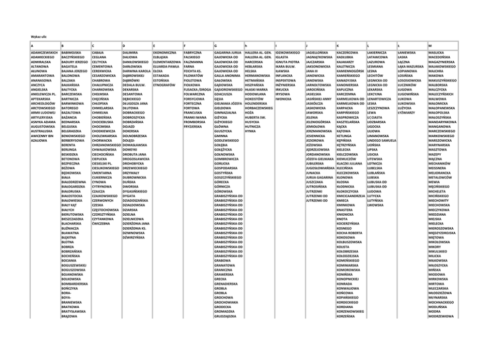 Wykaz ulic A B C D E F G h I J K L Ł M ADAMCZEWSKICH ADAMIECKIEGO ADMIRALSKA ALTANOWA AŁUNOWA AMARANTOWA ANANASOWA ANCZYCA ANGIELSKA ANIELEWICZA PL. APTEKARSKA ARCHEOLOGÓW ARCTOWSKIEGO ARMII LUDOWEJ ARTYLERYJSKA ASNYKA ADAMA AUGUSTOWSKA AUSTRALIJSKA AWICENNY IBN AZALIOWA BABIMOJSKA BACZYŃSKIEGO BADURY JERZEGO BAGATELA BAJANA JERZEGO BALONOWA BALZAKA BAŁKAŃSKA BAŁTYCKA BARCZEWSKA BARTNICZA BARWINKOWA BATOREGO BAZALTOWA BAŻANCIA BEDNARSKA BELGIJSKA BELGRADZKA BENIOWSKIEGO BERBERYSOWA BERENTA BERLINGA BESKIDZKA BETONOWA BEZPIECZNA BEŻOWA BĘDKOWSKA BIAŁA BIAŁODRZEWNA BIAŁOGARDZKA BIAŁORUSKA BIAŁOSTOCKA BIAŁOWIESKA BIAŁY KĄT BIAŁYCH BIERUTOWSKA BIESZCZADZKA BLACHARSKA BLIŹNIACZA BŁAWATNA BŁĘKITNA BŁOTNA BOBRZA BOBRZAŃSKA BOCHEŃSKA BOCIANIA BOGUSZEWSKIEJ BOGUSZOWSKA BOJANOWSKA BOLKOWSKA BOMBARDIERSKA BOŃCZYKA BORABOYABRANIEWSKA BRATKOWA BRATYSŁAWSKA BRĄZOWA CABAJA CEGLANA CELTYCKA CEMENTOWA CEREKWICKA CESARZOWICKA CHABROWA CHAŁUPNICZA CHARKOWSKA CHEŁMSKA CHĘCIŃSKA CHŁOPSKA CHMIELARSKA CHMIELNA CHOBIEŃSKA CHOCIEBUSKA CHOCIMSKA CHODKIEWICZA CHOLEWKARSKA CHORWACKA CHRZANOWSKIEGO CHWAŁKOWSKA CIECHOCIŃSKA CIEPLICKA CIESIELSKI PL. CIESLIKOWSKIEGO CMENTARNA CUKIERNICZA CYNOWA CYTRYNOWA CZAJCZA CZAJKOWSKIEGO CZERWONYCH CZESKA CZĘSTOCHOWSKA CZORSZTYŃSKA CZYTANKOWA ĆWICZEBNA DALIMIRA DALIOWA DANIŁOWSKIEGO DARŁOWSKA DARWINA KAROLA DĄBROWSKIEJ DĄBRÓWKI DEDALA BULW. DEKARSKA DESANTOWA DĘBICKIEGO DŁUGOSZA JANA DŁUTOWA DOBRACKIEGO DOBROSZYCKA DOBRZAŃSKA DOJAZD DOKERSKA DOLNOBRZESKA DOŁĘGIDOMASŁAWSKA DOMEYKI DROBUTA JANA DROGOSŁAWICKA DROHOBYCKA DRZEWIECKIEGO DRZYMAŁY DUBROWNICKA DUŃSKA DWORSKA DYGASIŃSKIEGO DYGATA DZIADOSZAŃSKA DZIAŁDOWSKA DZIARSKA DZIELNA DZIELNICOWA DZIERŻONIA JANA DZIERŻONIA KS. DZIWNOWSKA DŹWIRZYŃSKA EKONOMICZNA ELBLĄSKA ELEMENTARZOWA ELUARDA PAWŁA EŁCKA ESTAKADA ESTOŃSKA ETNOGRAFÓW FABRYCZNA FALSKIEGO FALZMANNA FARNA FEICHTA KS. FILOMATÓW FIOLETOWA FIOŁKOWA FLISACKA /DROGA FOLWARCZNA FORSYCJOWA FORTECZNA FORTOWA FRANCUSKA FRANKI IWANA FROMBORSKA FRYZJERSKA GAGARINA JURIJA GAJOWICKA OD GAJOWICKA OD GAJOWICKA OD GAJOWICKA OD GALLA ANONIMA GAŁOWSKA GĄDOWSKA GĄSIOROWSKIEGO GDACJUSZA GĘSIA GIELNIAKA JÓZEFA GIEŁDOWA GIMNAZJALNA GIŻYCKA GIŻYCKIEGO GŁÓWNA GŁUSZYCKA GMINNA GODLEWSKIEGO GOŁĘBIA GOŁĘŻYCKA GOŁNOWSKA GOMBROWICZA GORLICKA GOSPODARSKA GOSTYŃSKA GOSZCZYŃSKIEGO GÓRECKA GÓRNICZA GÓROWSKA GRABISZYŃSKA OD GRABISZYŃSKA OD GRABISZYŃSKA OD GRABISZYŃSKA OD GRABISZYŃSKA OD GRABISZYŃSKA OD GRABISZYŃSKA OD GRABISZYŃSKA OD GRABISZYŃSKA OD GRABISZYŃSKA OD GRABISZYŃSKA OD GRABISZYŃSKA OD GRABISZYŃSKA OD GRABISZYŃSKA OD GRABOWA GRANATOWA GRANICZNA GRAWERSKA GRECKA GRENADIERSKA GROBLA GROBLA GROCHOWA GROCHOWIAKA GRODECKA GROMADZKA GRUDZIĄDZKA HALLERA AL. GEN. HALLERA AL. GEN. HARCERSKA HEBLARSKA HELSKA HERMANOWSKA HETMAŃSKA HISZPAŃSKA HŁASKI MARKA HODOWLANA HOKEISTÓW HOLENDERSKA HORBACZEWSKIEG HOŻA HUBERTA SW. HUSYCKA HUTNICZA HYNKA IDZIKOWSKIEGO IGLASTA IGNUTA PIOTRA IKARA BULW. IŁAWSKA INFLANCKA INSPEKTOWA INŻYNIERSKA IRKUCKA IRYSOWA IWONICKA JAGIELLOŃSKA JAGNIĄTKOWSKA JAJCZARSKA JAKSONOWICKA JANA III JANOWICKA JANOWSKA JARNOŁTOWSKA JAROCIŃSKA JASIELSKA JASIŃSKIEJ ANNY JASKÓŁCZA JASKOWICKA JAWORSKA JELENIA JELENIOGÓRSKA JEMIOŁOWA JERZMANOWSKA JESIENNICKA JEZIOROWA JEŻOWSKA JĘDRZEJOWSKA JORDANOWSKA JÓZEFA GIELNIAKA JUBILERSKA JUGOSŁOWIAŃSKA JUNACKA JURIJA GAGARINA JUSZCZAKA JUTROSIŃSKA JUTRZENKI JUTRZENKI OD JUTRZENKI OD KACZEŃCOWA KADŁUBKA KAJAKARZY KALETNICZA KAMIENNOGÓRSK KAMIEŃSKIEGO KANADYJSKA KANONIERSKA KAPLICZNA KARCZEMNA KARMELKOWA OD KARMELKOWA OD KARPACKA KARPIŃSKIEGO KASPROWICZA KASZTELAŃSKA KĄCKA KĄTOWA KETLINGA KĘPIŃSKA KĘTRZYŃSKA KIELECKA KIEŁCZOWSKA KIEMLICZÓW KLACZKI JULIANA KLECIŃSKA KLECZKOWSKA KLONOWA KŁOSNA KŁODNICKA KŁOKOCZYCKA KMICICAANDRZEJA KMIECA KMINKOWA KNASTERA KNIGNICKA KNOTA KOCIERZYŃSKA KOSNEGO KOCHA ROBERTA KOKOSOWA KOLBUSZOWSKA KOLISTA KOŁOBRZESKA KOŁODZIEJSKA KOMEŃSKIEGO KOMINIARSKA KOMOROWSKA KONIŃSKA KONOPNICKIEJ KONRADA KONWALIOWA KOŃCOWA KOPAŃSKIEGO KORDECKIEGO KORDIANA KORZENIOWSKIEG KORZEŃSKA LAKIERNICZA LATAWCOWA LAZUROWA LESMIANA LESNA LECHITÓW LEGNICKA OD LEGNICKA OD LEKARSKA LEKCYJNA LENARTOWICZA LESKA LESZCZYNOWA LEWA LI¦CIASTA LIDZBARSKA LIGOCKA LILIOWA LIMANOWSKA LINDEGO SAMUELA LIOŃSKA LIPSKA LISICKA LITEWSKA LOTNICZA LUBELSKA LUBLAŃSKA LUBSKA LUBUSKA OD LUBUSKA OD LUDOWA LUTYCKA LUTYŃSKA LWOWSKA ŁANIEWSKA ŁASKA ŁĄCZNA ŁĄKA MAZURSKA ŁOPIANOWA ŁOSIŃSKA ŁOSOSIOWICKA ŁUCZNIKÓW ŁUGOWA ŁUGOWIŃSKA ŁUKOWA ŁUKOWSKA ŁUŻYCKA ŁYŻWIARZY MASLICKA MACEDOŃSKA MAGAZYNIERSKA MAJAKOWSKIEGO MAJCHRA MAKOWA MAKUSZYŃSKIEGO MALBORSKA MALCZYCKA MALECZYŃSKICH MALWOWA MAŁOMICKA MAŁOPANEWSKA MAŁOPOLSKA MAŁOSZYŃSKA MANDARYNKOWA MANGANOWA MARCZEWSKIEGO MARKOWSKIEGO MARSZOWICKA MARYNARSKA MASZTOWA MAZEPY MĄCZNA MECHANIKÓW MEISSNERA MELIORANCKA METALOWCÓW MEWIA MĘCIŃSKIEGO MICHELETA MICIŃSKIEGO MIECHOWITY MIECHOWSKA MIECZYKOWA MIEDZIANA MIEJSKA MIELECKA MIEROSZOWSKA MIĘDZYZDROJSKA MIĘTOWA MIKOŁOWSKA MIKORY MIKULSKIEO MILICKA MIŁKOWSKA MIŁOSZYCKA MIŃSKA MIODOWA MIRKOWSKA MIRTOWA MLECZARSKA MŁODZIEŻOWA MŁYNARSKA MOCHNACKIEGO MODLIŃSKA MODRA MODRZEWIOWA BRODNICKA BRODZIŃSKIEGO BRODZKA BRONIEWSKIEGO BROWARNA BRÜCKNERA BRYNICKA BRZECHWY JANA BRZEZIŃSKA BUCZACKA BUDOWLANA BUDZISZYŃSKA BUJNA BUKOWA BUKOWICKA BUKOWSKIEGO BUŁGARSKA BUSKA BYCZYŃSKA BYDGOSKA BYSTRA BYSTRZYCKA BYTOWSKA BZOWA BZOWY PL. GRUSZOWA GRYBOWSKA GRYCZANA GRZYBOWA GUBIŃSKA GWARECKA GWIZDANOWSKA KOSIDOWSKIEGO KOSMONAUTÓW KOSSAKKOSZALIŃSKA KOSZAROWA KOSZYKARSKA KOSZYKARZY KOSCIAŃSKA KOTWICZNA KOWALSKA KOWALSKIEGO KOWIEŃSKA KOZANOWSKA KOZIA KRASICKIEGO KRASZEWSKIEGO KRESOWA KRESLARSKA KRĘPICKA KROSNIEŃSKA KROKUSOWA KROMERA KROTOSZYŃSKA KRÓLEWIECKA KRÓLEWSKA KRÓLOWEJ KRUCZA OD KRUCZA OD KRUCZKOWSKIEGO KRUSZCOWA KRZELOWSKA KRZEMIENIECKA KRZESZOWSKA KRZYWOUSTEGO KRZYŻANOWICKA KRZYŻOWSKA KSIĘGARSKA KSIĘGOWA