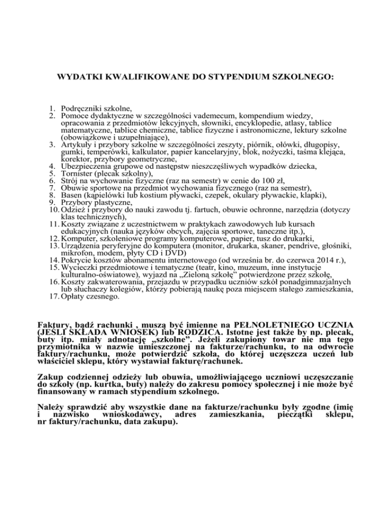 WYDATKI KWALIFIKOWANE DO STYPENDIUM SZKOLNEGO: 1. Podręczniki szkolne, 2. Pomoce dydaktyczne w szczególności vademecum, kompendium wiedzy, opracowania z przedmiotów lekcyjnych, słowniki, encyklopedie, atlasy, tablice matematyczne, tablice chemiczne, tablice fizyczne i astronomiczne, lektury szkolne (obowiązkowe i uzupełniające), 3. Artykuły i przybory szkolne w szczególności zeszyty, piórnik, ołówki, długopisy, gumki, temperówki, kalkulator, papier kancelaryjny, blok, nożyczki, taśma klejąca, korektor, przybory geometryczne, 4. Ubezpieczenia grupowe od następstw nieszczęśliwych wypadków dziecka, 5. Tornister (plecak szkolny), 6. Strój na wychowanie fizyczne (raz na semestr) w cenie do 100 zł, 7. Obuwie sportowe na przedmiot wychowania fizycznego (raz na semestr), 8. Basen (kąpielówki lub kostium pływacki, czepek, okulary pływackie, klapki), 9. Przybory plastyczne, 10. Odzież i przybory do nauki zawodu tj. fartuch, obuwie ochronne, narzędzia (dotyczy klas technicznych), 11. Koszty związane z uczestnictwem w praktykach zawodowych lub kursach edukacyjnych (nauka języków obcych, zajęcia sportowe, taneczne itp.), 12. Komputer, szkoleniowe programy komputerowe, papier, tusz do drukarki, 13. Urządzenia peryferyjne do komputera (monitor, drukarka, skaner, pendrive, głośniki, mikrofon, modem, płyty CD i DVD) 14. Pokrycie kosztów abonamentu internetowego (od września br. do czerwca 2014 r.), 15. Wycieczki przedmiotowe i tematyczne (teatr, kino, muzeum, inne instytucje kulturalno-oświatowe), wyjazd na „Zieloną szkołę” potwierdzone przez szkołę, 16. Koszty zakwaterowania, przejazdu w przypadku uczniów szkół ponadgimnazjalnych lub słuchaczy kolegiów, którzy pobierają naukę poza miejscem stałego zamieszkania, 17. Opłaty czesnego. Faktury, bądź rachunki , muszą być imienne na PEŁNOLETNIEGO UCZNIA (JEŚLI SKŁADA WNIOSEK) lub RODZICA. Istotne jest także by np. plecak, buty itp. miały adnotację „szkolne”. Jeżeli zakupiony towar nie ma tego przymiotnika w nazwie umieszczonej na fakturze/rachunku, to na odwrocie faktury/rachunku, może potwierdzić szkoła, do której uczęszcza uczeń lub właściciel sklepu, który wystawiał fakturę/rachunek. Zakup codziennej odzieży lub obuwia, umożliwiającego uczniowi uczęszczanie do szkoły (np. kurtka, buty) należy do zakresu pomocy społecznej i nie może być finansowany w ramach stypendium szkolnego. Należy sprawdzić aby wszystkie dane na fakturze/rachunku były zgodne (imię i nazwisko wnioskodawcy, adres zamieszkania, pieczątki sklepu, nr faktury/rachunku, data zakupu).