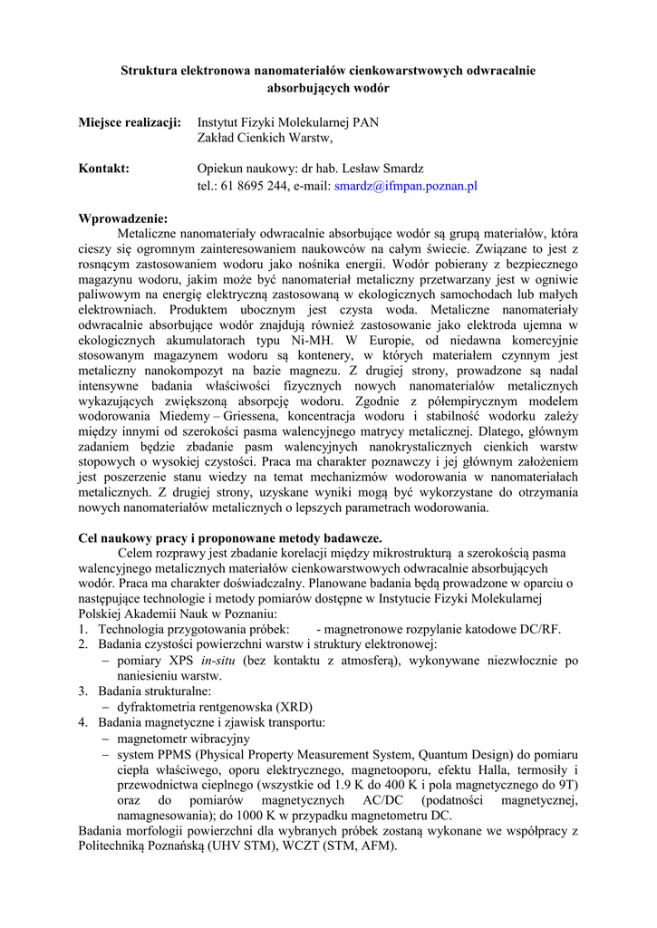 Struktura elektronowa nanomateriałów cienkowarstwowych odwracalnie absorbujących wodór Miejsce realizacji: Instytut Fizyki Molekularnej PAN Zakład Cienkich Warstw, Kontakt: Opiekun naukowy: dr hab. Lesław Smardz tel.: 61 8695 244, e-mail: [email protected] Wprowadzenie: Metaliczne nanomateriały odwracalnie absorbujące wodór są grupą materiałów, która cieszy się ogromnym zainteresowaniem naukowców na całym świecie. Związane to jest z rosnącym zastosowaniem wodoru jako nośnika energii. Wodór pobierany z bezpiecznego magazynu wodoru, jakim może być nanomateriał metaliczny przetwarzany jest w ogniwie paliwowym na energię elektryczną zastosowaną w ekologicznych samochodach lub małych elektrowniach. Produktem ubocznym jest czysta woda. Metaliczne nanomateriały odwracalnie absorbujące wodór znajdują również zastosowanie jako elektroda ujemna w ekologicznych akumulatorach typu Ni-MH. W Europie, od niedawna komercyjnie stosowanym magazynem wodoru są kontenery, w których materiałem czynnym jest metaliczny nanokompozyt na bazie magnezu. Z drugiej strony, prowadzone są nadal intensywne badania właściwości fizycznych nowych nanomaterialów metalicznych wykazujących zwiększoną absorpcję wodoru. Zgodnie z półempirycznym modelem wodorowania Miedemy – Griessena, koncentracja wodoru i stabilność wodorku zależy między innymi od szerokości pasma walencyjnego matrycy metalicznej. Dlatego, głównym zadaniem będzie zbadanie pasm walencyjnych nanokrystalicznych cienkich warstw stopowych o wysokiej czystości. Praca ma charakter poznawczy i jej głównym założeniem jest poszerzenie stanu wiedzy na temat mechanizmów wodorowania w nanomateriałach metalicznych. Z drugiej strony, uzyskane wyniki mogą być wykorzystane do otrzymania nowych nanomateriałów metalicznych o lepszych parametrach wodorowania. Cel naukowy pracy i proponowane metody badawcze. Celem rozprawy jest zbadanie korelacji między mikrostrukturą a szerokością pasma walencyjnego metalicznych materiałów cienkowarstwowych odwracalnie absorbujących wodór. Praca ma charakter doświadczalny. Planowane badania będą prowadzone w oparciu o następujące technologie i metody pomiarów dostępne w Instytucie Fizyki Molekularnej Polskiej Akademii Nauk w Poznaniu: 1. Technologia przygotowania próbek: - magnetronowe rozpylanie katodowe DC/RF. 2. Badania czystości powierzchni warstw i struktury elektronowej: pomiary XPS in-situ (bez kontaktu z atmosferą), wykonywane niezwłocznie po naniesieniu warstw. 3. Badania strukturalne: dyfraktometria rentgenowska (XRD) 4. Badania magnetyczne i zjawisk transportu: magnetometr wibracyjny system PPMS (Physical Property Measurement System, Quantum Design) do pomiaru ciepła właściwego, oporu elektrycznego, magnetooporu, efektu Halla, termosiły i przewodnictwa cieplnego (wszystkie od 1.9 K do 400 K i pola magnetycznego do 9T) oraz do pomiarów magnetycznych AC/DC (podatności magnetycznej, namagnesowania); do 1000 K w przypadku magnetometru DC. Badania morfologii powierzchni dla wybranych próbek zostaną wykonane we współpracy z Politechniką Poznańską (UHV STM), WCZT (STM, AFM).