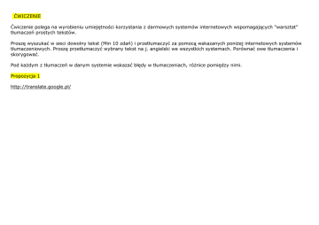 ĆWICZENIE Ćwiczenie polega na wyrobieniu umiejętności korzystania z darmowych systemów internetowych wspomagających "warsztat" tłumaczeń prostych tekstów. Proszę wyszukać w sieci dowolny tekst (Min 10 zdań) i przetłumaczyć za pomocą wskazanych poniżej internetowych systemów tłumaczeniowych. Proszę przetłumaczyć wybrany tekst na j. angielski we wszystkich systemach. Porównać owe tłumaczenia i skorygować. Pod każdym z tłumaczeń w danym systemie wskazać błędy w tłumaczeniach, różnice pomiędzy nimi. Propozycja 1 http://translate.google.pl/ Propozycja 2 CZ 2 PROSZĘ O ZAREJESTROWANIE SIĘ NA PONIŻSZY LINK https://accounts.google.com/ServiceLogin?service=gtrans&passive=1209600&continue=http://translate.google.com/toolkit? MAJĄ TU PAŃSTWO NARZĘDZIA DLA TŁUMACZY DO WYKORZYSTANIA W SWOJEJ PRACY ZAWODOWEJ Propozycja 3 http://www.translatica.pl/ Propozycja 4 http://www.mtranslator.pl/ Propozycja 5 http://www.angielskie.republika.pl/bing.html