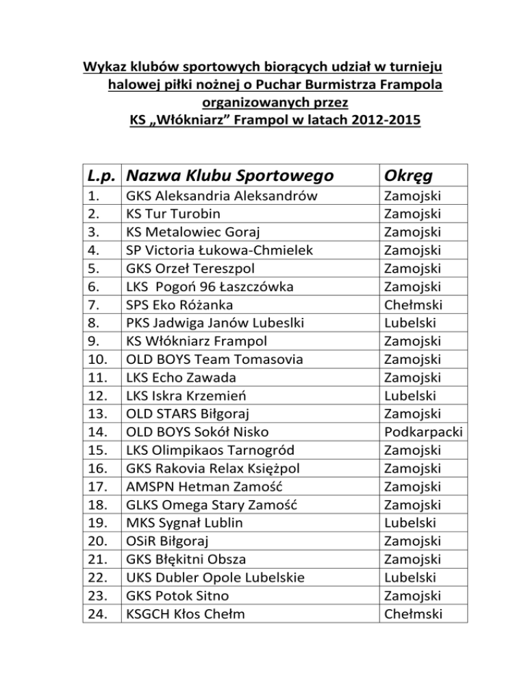 Wykaz klubów sportowych biorących udział w turnieju halowej piłki nożnej o Puchar Burmistrza Frampola organizowanych przez KS „Włókniarz” Frampol w latach 2012-2015 L.p. Nazwa Klubu Sportowego Okręg 1. 2. 3. 4. 5. 6. 7. 8. 9. 10. 11. 12. 13. 14. 15. 16. 17. 18. 19. 20. 21. 22. 23. 24. Zamojski Zamojski Zamojski Zamojski Zamojski Zamojski Chełmski Lubelski Zamojski Zamojski Zamojski Lubelski Zamojski Podkarpacki Zamojski Zamojski Zamojski Zamojski Lubelski Zamojski Zamojski Lubelski Zamojski Chełmski GKS Aleksandria Aleksandrów KS Tur Turobin KS Metalowiec Goraj SP Victoria Łukowa-Chmielek GKS Orzeł Tereszpol LKS Pogoń 96 Łaszczówka SPS Eko Różanka PKS Jadwiga Janów Lubeslki KS Włókniarz Frampol OLD BOYS Team Tomasovia LKS Echo Zawada LKS Iskra Krzemień OLD STARS Biłgoraj OLD BOYS Sokół Nisko LKS Olimpikaos Tarnogród GKS Rakovia Relax Księżpol AMSPN Hetman Zamość GLKS Omega Stary Zamość MKS Sygnał Lublin OSiR Biłgoraj GKS Błękitni Obsza UKS Dubler Opole Lubelskie GKS Potok Sitno KSGCH Kłos Chełm 25. 26. 27. 28. 29. 30. 31. 32. 33. 34. 35. 36. 37. 38. 39. 40. 41. 42. 43. 44. 45. 46. 47. 48. 49. 50. 51. 52. 53. ŁKS Korona Łaszczów GTS Zawisza Garbów LZS Dąbrowica GTPS Avia Świdnik GKS Relax Księżpol TKS Tomasovia Tomaszów Lubelski KS Janowianka Janów Lubelski RWKS Sparta Biłgoraj DKS Gaudium Zamość KP LZS Albatros Biszcza LKS Grom Różaniec LKS Orion Dereźnia LZS Tanew Majdan Stary LZS Cosmos Józefów KS Olender Sól SP Piast Babice BKS Łada 1945 Biłgoraj KS Rakovia Rakówka LZS Tarpan Korchów KS Huk Lipiny KS Ro-Ma Relax Księżpol LKS Orkan Bełżec GKS Huragan Hrubieszów MLKS Kryształ Werbkowice GLKS Granica Lubycza Królewska GKS Orzeł Cześniki UKS Jedynka Krasnystaw KS Lublinianka Lublin KS Orlik Lubartów Zamojski Lubelski Zamojski Lubelski Zamojski Zamojski Lubelski Zamojski Zamojski Zamojski Zamojski Zamojski Zamojski Zamojski Zamojski Zamojski Zamojski Zamojski Zamojski Zamojski Zamojski Zamojski Zamojski Zamojski Zamojski Zamojski Chełmski Lubelski Lubelski Udział klubów sportowych w poszczególnych turniejach halowej piłki nożnej o Puchar Burmistrza Frampola organizowanych przez KS „Włókniarz” Frampol w roku 2015r. 7. OSiR Biłgoraj 8. 11. GKS Orzeł Tereszpol PKS Jadwiga Janów Lubelski KS Metalowiec Goraj LKS Iskra Krzemień 12. MKS Sygnał Lublin 13. GLKS Omega Stary Zamość LKS Pogoń 96 Łaszczówka 2. 3. 4. 5. 9. 10. 14. ++ + + + + + + + ++ + + + + + Dzieci 2006 i 2007 + + ++ ++ + + + + + + + + + + + + + + + ++ + + + + + + ++ + + Młodzik młodszy 2003 i młodsi Junior młodszy 1998 i młodsi Dziewczęta 1996 i młodsi Młodzik starszy 2002 i młodsi ++ + ++ ++ ++ + Orlik młodszy 2005 i młodsi 6. KS Włókniarz Frampol DKS Gaudium Zamość SP Victoria Łukowa-Chmielek GKA Aleksandria Aleksandrów AMSP Hetman Zamość KS Tur Turobin Orlik starszy 2004 i młodsi 1. Oldboje powyżej 35 lat Nazwa Klubu Junior starszy 1996 i młodsi wiekowa Senior finał powiatowy Kategoria Senior eliminacje powiatowe L.p. + + + 15. SPS Eko Różanka 16. GKS Rakovia Relax Księżpol LKS Orion Dereźnia Solska LZS Tanew Majdan Stary UKS Dubler Opole Lub. GTPS Avia Świdnik 17. 18. 19. 20. 21. 22. 23. 24. GKS Relax Radecznica OLD Stars Biłgoraj OLD BOYS Sokół Nisko OLD BOYS TEAM Tomasovia ++ ++ + + + + ++ ++ ++ + + + 25. LKS Echo Zawada 26. LKS Olimpiakos Tarnogród + 27. + 29. KPLZS Albatros Biszcza LKS Grom Różaniec GKS Błękitni Obsza 30. LZS Dąbrowica 31. TKS Tomasovia 32. GKS Potok Sitno 33. Kłos Chełm 34. ŁKS Korona Łaszczów GTS Zawisz Garbów UKS Jedynka Krasnystaw KS Lublinianka Lublin KS Orlik Lubartów 28. 35. 36. 37. 38. + + + + + + + + + + + + + +