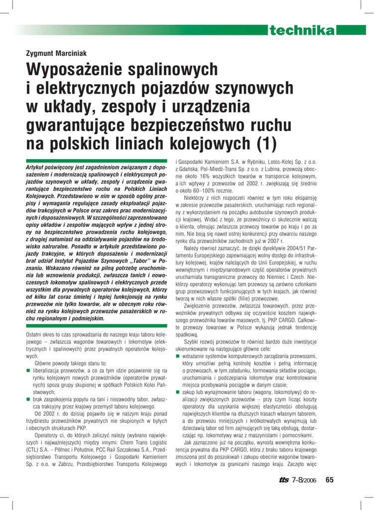 Zygmunt Marciniak Wyposażenie spalinowych i elektrycznych pojazdów szynowych w układy, zespoły i urządzenia gwarantujące bezpieczeństwo ruchu na polskich liniach kolejowych (1) Artykuł poświęcony jest zagadnieniom związanym z doposażeniem i modernizacją spalinowych i elektrycznych pojazdów szynowych w układy, zespoły i urządzenia gwarantujące bezpieczeństwo ruchu na Polskich Liniach Kolejowych. Przedstawiono w nim w sposób ogólny przepisy i wymagania regulujące zasady eksploatacji pojazdów trakcyjnych w Polsce oraz zakres prac modernizacyjnych i doposażeniowych. W szczególności zaprezentowano opisy układów i zespołów mających wpływ z jednej strony na bezpieczeństwo prowadzenia ruchu kolejowego, z drugiej natomiast na oddziaływanie pojazdów na środowisko natruralne. Ponadto w artykule przedstawiono pojazdy trakcyjne, w których doposażeniu i modernizacji brał udział Instytut Pojazdów Szynowych „Tabor” w Poznaniu. Wskazano również na pilną potrzebę uruchomienia lub wznowienia produkcji, zwłaszcza tanich i nowoczesnych lokomotyw spalinowych i elektrycznych przede wszystkim dla prywatnych operatorów kolejowych, którzy od kilku lat coraz śmielej i lepiej funkcjonują na rynku przewozów nie tylko towarów, ale w obecnym roku również na rynku kolejowych przewozów pasażerskich w ruchu regionalnym i podmiejskim. Ostatni okres to czas sprowadzania do naszego kraju taboru kolejowego – zwłaszcza wagonów towarowych i lokomotyw (elektrycznych i spalinowych) przez prywatnych operatorów kolejowych. Główne powody takiego stanu to: liberalizacja przewozów, a co za tym idzie pojawienie się na rynku kolejowym nowych przewoźników (operatorów prywatnych) spoza grupy skupionej w spółkach Polskich Kolei Państwowych; brak zaspokojenia popytu na tani i niezawodny tabor, zwłaszcza trakcyjny przez krajowy przemysł taboru kolejowego. Od 2002 r. do dzisiaj pojawiło się w naszym kraju ponad trzydziestu przewoźników prywatnych nie skupionych w byłych i obecnych strukturach PKP. Operatorzy ci, do których zaliczyć należy (wybrano największych i najważniejszych) między innymi: Chem Trans Logistic (CTL) S.A. – Północ i Południe, PCC Rail Szczakowa S.A., Przedsiębiorstwo Transportu Kolejowego i Gospodarki Kamieniem Sp. z o.o. w Zabrzu, Przedsiębiorstwo Transportu Kolejowego i Gospodarki Kamieniem S.A. w Rybniku, Lotos-Kolej Sp. z o.o. z Gdańska, Pol-Miedź-Trans Sp. z o.o. z Lubina, przewożą obecnie około 16% wszystkich towarów w transporcie kolejowym, a ich wpływy z przewozów od 2002 r. zwiększają się średnio o około 60–100% rocznie. Niektórzy z nich rozpoczeli również w tym roku ekspansję w zakresie przewozów pasażerskich, uruchamiając ruch regionalny z wykorzystaniem na początku autobusów szynowych produkcji krajowej. Widać z tego, że przewoźnicy ci skutecznie walczą o klienta, oferując zwłaszcza przewozy towarów po kraju i po za nim. Nie boją się nawet ostrej konkurencji przy otwarciu naszego rynku dla przewoźników zachodnich już w 2007 r. Należy również zaznaczyć, że dzięki dyrektywie 2004/51 Parlamentu Europejskiego zapewniającej wolny dostęp do infrastruktury kolejowej, krajów należących do Unii Europejskiej, w ruchu wewnętrznym i międzynarodowym część operatorów prywatnych uruchamiała transgraniczne przewozy do Niemiec i Czech. Niektórzy operatorzy wykonując tam przewozy są zarówno członkami grup przewozowych funkcjonujących w tych krajach, jak również tworzą w nich własne spółki (filie) przewozowe. Zwiększenie przewozów, zwłaszcza towarowych, przez przewoźników prywatnych odbywa się oczywiście kosztem największego przewoźnika towarów masowych, tj. PKP CARGO. Całkowite przewozy towarowe w Polsce wykazują jednak tendencję spadkową. Szybki rozwój przewozów to również bardzo duże inwestycje ukierunkowane na następujące główne cele: wdrażanie systemów komputerowych zarządzania przewozami, który umożliwi pełną kontrolę kosztów i pełną informację o przewozach, w tym załadunku, formowania składów pociągu, uruchamiania i podczepiania lokomotyw oraz kontrolowanie miejsca przebywania pociągów w danym czasie; zakup lub wynajmowanie taboru (wagony, lokomotywy) do realizacji zwiększonych przewozów – przy czym licząc koszty operatorzy dla uzyskania większej elastyczności obsługują największych klientów na dłuższych trasach własnym taborem, a do przewozu mniejszych i krótkotrwałych wynajmują lub dzierżawią tabor od firm zajmujących się taką obsługą, dostarczając np. lokomotywy wraz z maszynistami i pomocnikami. Jak zaznaczono już na początku, wyrosła wewnętrzna konkurencja prywatna dla PKP CARGO, która z braku taboru krajowego zmuszona jest do poszukiwań i zakupu obecnie wagonów towarowych i lokomotyw za granicami naszego kraju. Zaczęto więc 7-8/2006 65 sprowadzać do Polski zużyty już tabor, w tym lokomotywy spalinowe i elektryczne z wielu krajów europejskich – najwięcej z Niemiec, Czech, Słowacji oraz krajów nadbałtyckich, a ostatnio czyni się starania dla jego pozyskiwania (np. do obsługi linii szerokotorowych) również z Rosji, Ukrainy i Białorusi. Nadmienić należy również to, że sprowadzono także lokomotywy elektryczne, które w latach 70. były wyprodukowane w Pafawag Wrocław i eksportowane do Maroka, jak również czyni się próby uruchomienia (wznowienia) produkcji ciężkich, dwusekcyjnych, o dużej mocy lokomotyw elektrycznych, których kilkadziesiąt sztuk z powodzeniem eksploatowanych jest w naszym kraju. Oczywistym jest, że produkcja tych lokomotyw uwzględniać będzie również najnowsze zdobycze techniki na takim poziome, by uzyskać tabor tani, niezawodny i prosty w obsłudze, a zwłaszcza by był on na obecną „kieszeń” prywatnych operatorów. Sprowadzane (zakupywane) lokomotywy spalinowe i elektryczne są w różnym stanie technicznym, nie są zarówno młod