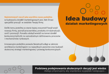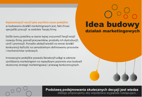 Najistotniejszą rzeczą jaka wyróżnia nasze podejście w budowaniu działań marketingowych jest, fakt iż nasi specjaliści pracują w siedzibie Twojej firmy. Idea budowy działań marketingowych Dzięki temu jesteśmy w stanie lepiej zrozumieć Twoją wizję rozwoju firmy, poznać pracowników, produkty ich dystrybucję, cenę i promocję. Ponadto zdobyć wiedzę na temat działań konkurencji kończąc na samodzielnym definiowaniu procesów i mechanizmów rynkowych. Innowacyjne podejście pozwala świadczyć usługi w zakresie zarządzania marketingiem na najwyższym poziomie oraz budowę skutecznej strategii marketingowej i przewag konkurencyjnych. Podstawą podejmowania skutecznych decyzji jest wiedza dlatego proponujemy aby współpraca wyglądała następująco... Uzgodnienie zasad współpracy Podpisanie umowy następuje po uzgodnieniu ogólnych warunków współpracy na okres 6 lub 12 mc z możliwością przedłużenia o kolejny okres czasu. Pracownicy Twojej Firmy właściciel / prezes / dyrektor zarządzający spec. ds. marketingu delegowany pracownik nowo zatrudniony pracownik Zespół marketingbox.pl strateg marketingowy spec. ds. trade marketingu spec. ds. public relations spec. ds. merchandising specjalista. ds. internetu spec. ds. analiz marketingowych inni... U w mo od spół wa z m 6 do pracy prz ożliw 12m e o c o k dłuża ścią o n okr lejny ia es Chcesz wykorzystać wiedzę specjalistów? 721 557 864 [email protected] skype: marketingbox.pl Konsultacje to podstawowa analiza Klienta oraz jego potrzeb marketingowych poprzedzająca rozpoczęcie procesu budowy strategii. Konsultacje Diagram wskazuje przykładowy dzień tygodnia w którym pracownik marketingbox będzie świadczyć pracę w siedzibie Klienta. Oraz wydelegowanego przez Klienta pracownika do pomocy i utrzymania ciągłości pracy w pozostałe dni tygodnia. Pracownik Klienta Spec marketingbox.pl Pi ą te k Po n ie dz k C zwa rtek iałe Wt dzień tygodnia w którym strateg marketingowy świadczy pracę w siedzibie Klienta or e k Środ a Chcesz wykorzystać wiedzę specjalistów? 721 557 864 [email protected] skype: marketingbox.pl Budowa strategii to pogłębiona analiza oraz zdefiniowanie celów i sposobów ich realizacji poprzez rozpisanie zadań na poziomie operacyjnym oraz dobór odpowiednich specjalistów. Budowa strategii dzień S tyc z eń L Pa ździ e Kw i e c k C zwa rtek Wr i rp e iałe Si dz Lipie ie c Wt dzień tygodnia w którym strateg marketingowy świadczy pracę w siedzibie Klienta rwiec n Cze Po aj te k M Pi ą eń Zarząd Klienta Strateg marketingowy ień ze s ie rzec ń Ma rnik Li y st ut o Gru d pa or e k Środ a Chcesz wykorzystać wiedzę specjalistów? 721 557 864 [email protected] skype: marketingbox.pl Realizacja zadań etap I Realizacja zadań etap I to rozpoczęcie pracy wybranego specjalisty w obrębie zaplanowanych zadań operacyjnych z udziałem pracownika Klienta. dzień S tyc z Postęp realizacji oraz nadzór merytoryczny prawowany jest przez stratega marketingowego na każdym etapie prac. eń L Pa ździ e Kw i e c k Wr i rp c C zwa rtek e iałe Si dz Lipie ie Wt dzień tygodnia w którym specjalista marketingbox świadczy pracę w siedzibie Klienta rwiec n Cze Po aj te k M Pi ą eń Pracownik Klienta Sp. ds. trade marketingu ień ze s ie rzec ń Ma rnik Li y st ut o Gru d pa or e k Środ a Chcesz wykorzystać wiedzę specjalistów? 721 557 864 [email protected] skype: marketingbox.pl Realizacja zadań etap II Realizacja zadań etap II to rozpoczęcie pracy kolejnego specjalisty w obrębie zaplanowanych zadań operacyjnych z udziałem pracownika Klienta. dzień Styc z Postęp realizacji oraz nadzór merytoryczny prawowany jest przez stratega marketingowego na każdym etapie prac. eń L Pa ździ e Kw i e c Wr i rp c Czwa rtek e k Si iałe Lipie dz rwiec ie Wt dzień tygodnia w którym specjalista marketingbox świadczy pracę w siedzibie Klienta Cze n M Po aj te k eń Pracownik Klienta Sp. ds. Internetu Pi ą ień ze s ie rzec ń Ma rnik Li y st ut o Gru d pa or e k Środ a Chcesz wykorzystać wiedzę specjalistów? 721 557 864 [email protected] skype: marketingbox.pl Realizacja zadań etap III Realizacja zadań etap III to rozpoczęcie pracy kolejnego specjalisty w obrębie zaplanowanych zadań operacyjnych z udziałem pracownika Klienta. dzień S tyc z Postęp realizacji oraz nadzór merytoryczny sprawowany jest przez stratega marketingowego na każdym etapie prac. eń L Paździe Kw i e c k Wr i rp c Czwa rtek e iałe Si dz Lipie ie Wt dzień tygodnia w którym specjalista marketingbox świadczy pracę w siedzibie Klienta rwiec n Cze Po aj te k M Pią eń Pracownik Klienta Sp. ds. merchandisingu ień zes ie rzec ń Ma rnik Li y st ut o Gru d pa or e k Środ a Chcesz wykorzystać wiedzę specjalistów? 721 557 864 [email protected] skype: marketingbox.pl Co zyskałeś dla siebie - pewność iż cały potencjał firmy szanse i mocne strony zostały wykorzystane a zagrożenia i słabe strony zniwelowane - pewność że zainwestowane pieniądze nie zostały zmarnowane w wyniku merytorycznych błędów - zespół niezależnych specjalistów z którymi omówiłeś bez ogródek najśmielsze projekty - wiedzę o tym co jest skuteczne - zrealizowane zadania Jeśli tą krótką prezentacją zdołałem wzbudzić - trochę świeżej krwi choć cień Twojej ciekawości spotkajmy się zobaczymy co da się zrobić Marcin Glebow Strateg marketingowy 721 557 864 A wszystkie wymienione i nie wymienione korzyści zyskałeś bez potrzeby ponoszenia bardzo wysokich kosztów związanych z utrzymaniem specjalistów na etatach. Co zyskała Twoja firma - profesjonalną strategię oraz wytyczne - wsparcie interdyscyplinarnego zespołu - audyt wykorzystywanych przez firmę narzędzi - dedyk. rozwiązania dla sprzedaży, produkcji, reklamacji Co zyskali Twoi pracownicy - nowe specjalistyczne umiejętności - nowe narzędzia poprawiające skuteczność pracy - praktyczną wiedzę na temat marketingu 
