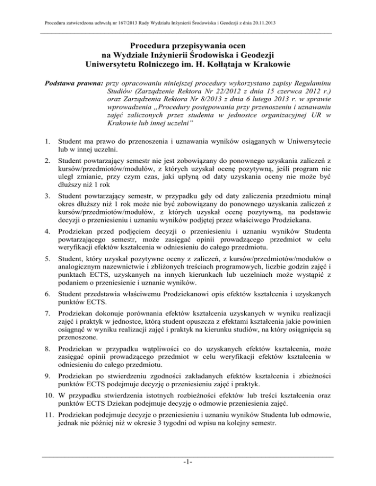 Procedura zatwierdzona uchwałą nr 167/2013 Rady Wydziału Inżynierii Środowiska i Geodezji z dnia 20.11.2013 _____________________________________________________________________________ Procedura przepisywania ocen na Wydziale Inżynierii Środowiska i Geodezji Uniwersytetu Rolniczego im. H. Kołłątaja w Krakowie Podstawa prawna: przy opracowaniu niniejszej procedury wykorzystano zapisy Regulaminu Studiów (Zarządzenie Rektora Nr 22/2012 z dnia 15 czerwca 2012 r.) oraz Zarządzenia Rektora Nr 8/2013 z dnia 6 lutego 2013 r. w sprawie wprowadzenia „Procedury postępowania przy przenoszeniu i uznawaniu zajęć zaliczonych przez studenta w jednostce organizacyjnej UR w Krakowie lub innej uczelni” 1. Student ma prawo do przenoszenia i uznawania wyników osiąganych w Uniwersytecie lub w innej uczelni. 2. Student powtarzający semestr nie jest zobowiązany do ponownego uzyskania zaliczeń z kursów/przedmiotów/modułów, z których uzyskał ocenę pozytywną, jeśli program nie uległ zmianie, przy czym czas, jaki upłyną od daty uzyskania oceny nie może być dłuższy niż 1 rok 3. Student powtarzający semestr, w przypadku gdy od daty zaliczenia przedmiotu minął okres dłuższy niż 1 rok może nie być zobowiązany do ponownego uzyskania zaliczeń z kursów/przedmiotów/modułów, z których uzyskał ocenę pozytywną, na podstawie decyzji o przeniesieniu i uznaniu wyników podjętej przez właściwego Prodziekana. 4. Prodziekan przed podjęciem decyzji o przeniesieniu i uznaniu wyników Studenta powtarzającego semestr, może zasięgać opinii prowadzącego przedmiot w celu weryfikacji efektów kształcenia w odniesieniu do całego przedmiotu. 5. Student, który uzyskał pozytywne oceny z zaliczeń, z kursów/przedmiotów/modułów o analogicznym nazewnictwie i zbliżonych treściach programowych, liczbie godzin zajęć i punktach ECTS, uzyskanych na innych kierunkach lub uczelniach może wystąpić z podaniem o przeniesienie i uznanie wyników. 6. Student przedstawia właściwemu Prodziekanowi opis efektów kształcenia i uzyskanych punktów ECTS. 7. Prodziekan dokonuje porównania efektów kształcenia uzyskanych w wyniku realizacji zajęć i praktyk w jednostce, którą student opuszcza z efektami kształcenia jakie powinien osiągnąć w wyniku realizacji zajęć i praktyk na kierunku studiów, na który osiągnięcia są przenoszone. 8. Prodziekan w przypadku wątpliwości co do uzyskanych efektów kształcenia, może zasięgać opinii prowadzącego przedmiot w celu weryfikacji efektów kształcenia w odniesieniu do całego przedmiotu. 9. Prodziekan po stwierdzeniu zgodności zakładanych efektów kształcenia i zbieżności punktów ECTS podejmuje decyzję o przeniesieniu zajęć i praktyk. 10. W przypadku stwierdzenia istotnych rozbieżności efektów lub treści kształcenia oraz punktów ECTS Dziekan podejmuje decyzję o odmowie przeniesienia zajęć. 11. Prodziekan podejmuje decyzje o przeniesieniu i uznaniu wyników Studenta lub odmowie, jednak nie później niż w okresie 3 tygodni od wpisu na kolejny semestr. _____________________________________________________________________________ -1- Procedura zatwierdzona uchwałą nr 167/2013 Rady Wydziału Inżynierii Środowiska i Geodezji z dnia 20.11.2013 _____________________________________________________________________________ 12. Podanie, z decyzją właściwego Prodziekana pracownicy dziekanatu umieszczają w aktach osobowych studenta. 13. W indeksie elektronicznym systemu USOS i/lub papierowym, student uzyskuje odpowiedni wpis o uznaniu efektów kształcenia. _____________________________________________________________________________ -2-