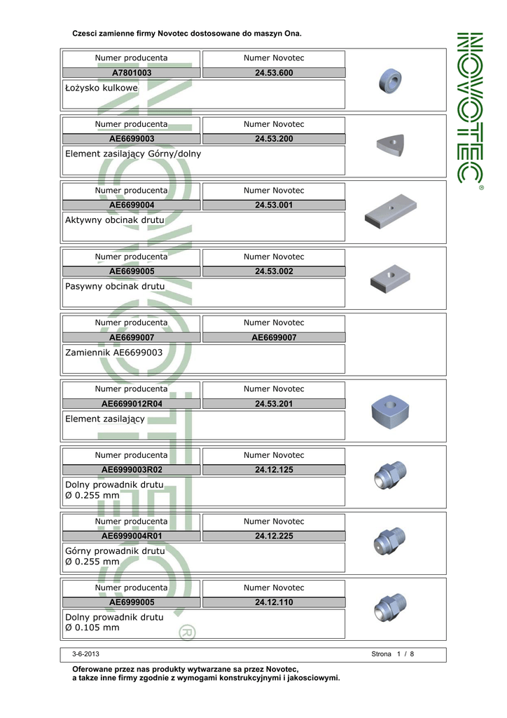 Czesci zamienne firmy Novotec dostosowane do maszyn Ona. Numer producenta Numer Novotec A7801003 24.53.600 Łożysko kulkowe Numer producenta Numer Novotec AE6699003 24.53.200 Element zasilający Górny/dolny Numer producenta Numer Novotec AE6699004 24.53.001 Aktywny obcinak drutu Numer producenta Numer Novotec AE6699005 24.53.002 Pasywny obcinak drutu Numer producenta Numer Novotec AE6699007 AE6699007 Zamiennik AE6699003 Numer producenta Numer Novotec AE6699012R04 24.53.201 Element zasilający Numer producenta Numer Novotec AE6999003R02 24.12.125 Dolny prowadnik drutu Ø 0.255 mm Numer producenta Numer Novotec AE6999004R01 24.12.225 Górny prowadnik drutu Ø 0.255 mm Numer producenta Numer Novotec AE6999005 24.12.110 Dolny prowadnik drutu Ø 0.105 mm 3-6-2013 Oferowane przez nas produkty wytwarzane sa przez Novotec, a takze inne firmy zgodnie z wymogami konstrukcyjnymi i jakosciowymi. Strona 1 / 8 Czesci zamienne firmy Novotec dostosowane do maszyn Ona. Numer producenta Numer Novotec AE6999006 24.12.210 Górny prowadnik drutu Ø 0.105 mm Numer producenta Numer Novotec AE6999007R02 24.12.130 Dolny prowadnik drutu Ø 0.305 mm Numer producenta Numer Novotec AE6999008R01 24.12.230 Górny prowadnik drutu Ø 0.305 mm Numer producenta Numer Novotec AE6999009 24.12.215 Górny prowadnik drutu Ø 0.155 mm Numer producenta Numer Novotec AE6999010 24.12.115 Dolny prowadnik drutu Ø 0.155 mm Numer producenta Numer Novotec AE6999011 24.12.220 Górny prowadnik drutu Ø 0.205 mm Numer producenta Numer Novotec AE6999012 24.12.120 Dolny prowadnik drutu Ø 0.205 mm Numer producenta Numer Novotec AE6999013 24.12.425 Górny prowadnik drutu Ø 0.25 mm Numer producenta Numer Novotec AE6999014 24.12.325 Dolny prowadnik drutu Ø 0.25 mm 3-6-2013 Oferowane przez nas produkty wytwarzane sa przez Novotec, a takze inne firmy zgodnie z wymogami konstrukcyjnymi i jakosciowymi. Strona 2 / 8 Czesci zamienne firmy Novotec dostosowane do maszyn Ona. Numer producenta Numer Novotec AE6999015 24.12.430 Górny prowadnik drutu Ø 0.30 mm Numer producenta Numer Novotec AE6999016 24.12.330 Dolny prowadnik drutu Ø 0.30 mm Numer producenta Numer Novotec AE6999017 24.12.420 Górny prowadnik drutu Ø 0.20 mm Numer producenta Numer Novotec AE6999018 24.12.320 Dolny prowadnik drutu Ø 0.20 mm Numer producenta Numer Novotec E4611486 24.62.100 Uchwyt dyszy Numer producenta Numer Novotec E4611506 24.62.101 Uchwyt dyszy Numer producenta Numer Novotec E69200003R00 24.12.625 Dolny prowadnik drutu Ø 0.25 mm Numer producenta Numer Novotec E69200004R00 24.12.525 Zamiennik E69200039R00 Numer producenta Numer Novotec E69200005R00 24.12.630 Dolny prowadnik drutu Ø 0.30 mm 3-6-2013 Oferowane przez nas produkty wytwarzane sa przez Novotec, a takze inne firmy zgodnie z wymogami konstrukcyjnymi i jakosciowymi. Strona 3 / 8 Czesci zamienne firmy Novotec dostosowane do maszyn Ona. Numer producenta Numer Novotec E69200006R00 24.12.530 Zamiennik E69200041R00 Numer producenta Numer Novotec E69200007R00 24.12.610 Dolny prowadnik drutu Ø 0.10 mm Numer producenta Numer Novotec E69200008R00 24.12.510 Górny prowadnik drutu Ø 0.10 mm Numer producenta Numer Novotec E69200011R00 24.12.720 Dolny prowadnik drutu 30° Ø 0.20 mm Numer producenta Numer Novotec E69200012R00 24.12.725 Dolny prowadnik drutu 30° Ø 0.25 mm Numer producenta Numer Novotec E69200013R00 24.12.730 Dolny prowadnik drutu 30° Ø 0.30 mm Numer producenta Numer Novotec E69200016R00 24.12.820 Górny prowadnik drutu 30° Ø 0.20 mm Numer producenta Numer Novotec E69200017R00 24.12.825 Górny prowadnik drutu 30° Ø 0.25 mm Numer producenta Numer Novotec E69200018R00 24.12.830 Górny prowadnik drutu 30° Ø 0.30 mm 3-6-2013 Oferowane przez nas produkty wytwarzane sa przez Novotec, a takze inne firmy zgodnie z wymogami konstrukcyjnymi i jakosciowymi. Strona 4 / 8 Czesci zamienne firmy Novotec dostosowane do maszyn Ona. Numer producenta Numer Novotec E69200025R00 24.12.615 Dolny prowadnik drutu Ø 0.15 mm Numer producenta Numer Novotec E69200026R00 24.12.515 Górny prowadnik drutu Ø 0.15 mm Numer producenta Numer Novotec E69200027R00 24.12.620 Dolny prowadnik drutu Ø 0.20 mm Numer producenta Numer Novotec E69200028R00 24.12.520 Górny prowadnik drutu Ø 0.20 mm Numer producenta Numer Novotec E69200033R00 24.12.540 Górny prowadnik drutu Ø 0.10 mm Numer producenta Numer Novotec E69200034R00 24.12.640 Dolny prowadnik drutu Ø 0.10 mm Numer producenta Numer Novotec E69200035R00 24.12.545 Górny prowadnik drutu Ø 0.15 mm Numer producenta Numer Novotec E69200036R00 24.12.645 Dolny prowadnik drutu Ø 0.15 mm Numer producenta Numer Novotec E69200037R00 24.12.550 Górny prowadnik drutu Ø 0.20 mm 3-6-2013 Oferowane przez nas produkty wytwarzane sa przez Novotec, a takze inne firmy zgodnie z wymogami konstrukcyjnymi i jakosciowymi. Strona 5 / 8 Czesci zamienne firmy Novotec dostosowane do maszyn Ona. Numer producenta Numer Novotec E69200038R00 24.12.650 Dolny prowadnik drutu Ø 0.20 mm Numer producenta Numer Novotec E69200039R00 24.12.555 Górny prowadnik drutu Ø 0.25 mm Numer producenta Numer Novotec E69200040R00 24.12.655 Dolny prowadnik drutu Ø 0.25 mm Numer producenta Numer Novotec E69200041R00 24.12.560 Górny prowadnik drutu Ø 0.30 mm Numer producenta Numer Novotec E69200042R00 24.12.660 Dolny prowadnik drutu Ø 0.30 mm Numer producenta Numer Novotec E69200043R00 24.12.565 Górny prowadnik drutu Ø 0.33 mm Numer producenta Numer Novotec E69200044R00 24.12.665 Dolny prowadnik drutu Ø 0.33 mm Numer producenta Numer Novotec E69200047R00 24.12.561 Górny prowadnik drutu Ø 0.315 mm Numer producenta Numer Novotec E69200048R00 24.12.661 Dolny prowadnik drutu Ø 0.315 mm 3-6-2013 Oferowane przez nas produkty wytwarzane sa przez Novotec, a takze inne firmy zgodnie z wymogami konstrukcyjnymi i jakosciowymi. Strona 6 / 8 Czesci zamienne firmy Novotec dostosowane do maszyn Ona. Numer producenta Numer Novotec E83000108R02 24.62.015 Dolna dysza płucząca Numer producenta Numer Novotec E8311194 E83111