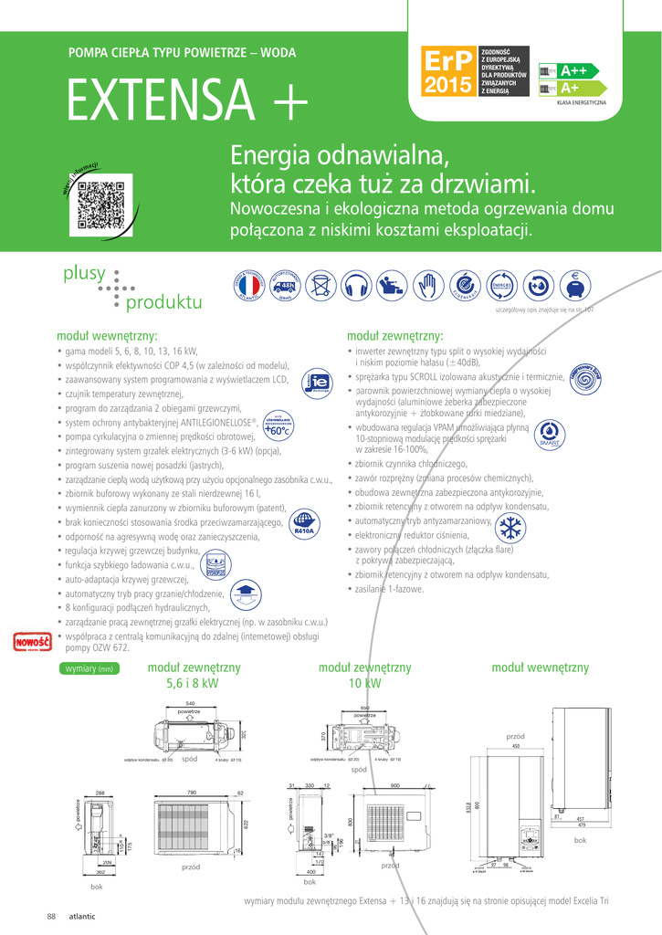 ErP R ZGODNOŚĆ Z EUROPEJSKĄ DYREKTYWĄ DLA PRODUKTÓW ZWIĄZANYCH Z ENERGIĄ 2015 orm 55 C A++ A+ Energia odnawialna która czeka tu za drzwiami. a c ji więc ej i n 35 C Nowoczesna i ekologiczna metoda ogrzewania domu poł czona z niskimi kosztami eksploatacji. szczegółowy opis znajduje się na str. 107 modu wewnętrzny modu zewnętrzny gama modeli 5, 6, , 10, 13, 16 kW, współczynnik efektywności COP 4,5 (w zależności od modelu), zaawansowany system programowania z wyświetlaczem LCD, czujnik temperatury zewnętrznej, program do zarządzania 2 obiegami grzewczymi, system ochrony antybakteryjnej ANTILEGIONELLOSE®, pompa cyrkulacyjna o zmiennej prędkości obrotowej, zintegrowany system grzałek elektrycznych (3-6 kW) (opcja), program suszenia nowej posadzki (jastrych), zarządzanie ciepłą wodą użytkową przy użyciu opcjonalnego zasobnika c.w.u., zbiornik buforowy wykonany ze stali nierdzewnej 16 l, wymiennik ciepła zanurzony w zbiorniku buforowym (patent), brak konieczności stosowania środka przeciwzamarzającego, odporność na agresywną wodę oraz zanieczyszczenia, regulacja krzywej grzewczej budynku, funkcja szybkiego ładowania c.w.u., auto-adaptacja krzywej grzewczej, automatyczny tryb pracy grzanie/chłodzenie, konfiguracji podłączeń hydraulicznych, zarządzanie pracą zewnętrznej grzałki elektrycznej (np. w zasobniku c.w.u.) współpraca z centralą komunikacyjną do zdalnej (internetowej) obsługi pompy OZW 672. modu zewnętrzny i kW wymiary (mm) inwerter zewnętrzny typu split o wysokiej wydajności i niskim poziomie hałasu ( 40dB), sprężarka typu SCROLL izolowana akustycznie i termicznie, parownik powierzchniowej wymiany ciepła o wysokiej wydajności (aluminiowe żeberka zabezpieczone antykorozyjnie żłobkowane rurki miedziane), • wbudowana regulacja VPAM umożliwiająca płynną 10-stopniową modulację prędkości sprężarki w zakresie 16-100%, zbiornik czynnika chłodniczego, zawór rozprężny (zmiana procesów chemicznych), obudowa zewnętrzna zabezpieczona antykorozyjnie, zbiornik retencyjny z otworem na odpływ kondensatu, automatyczny tryb antyzamarzaniowy, elektroniczny reduktor ciśnienia, zawory połączeń chłodniczych (złączka flare) z pokrywą zabezpieczającą, zbiornik retencyjny z otworem na odpływ kondensatu, zasilanie 1-fazowe. modu zewn zewnętrzny kW 450 540 650 powietrze powietrze przód 370 320 Unité extérieure, modèles 6 et 7 kW modu wewnętrzny odpływ kondensatu (Ø 20) 4 śruby (Ø 10) 4 śruby (Ø 10) 800 spód 832,8 450 odpływ kondensatu (Ø 20) spód 31 12 16 przód atlantic 170 832,8 800 457 479 bok 9 147 400 81 98 przód powrót 97 98 wyjście 81 bok bok 88 99 196 175 110 209 97 830 3/8” 5/8” A 362 77 21 2 1 5 et 6 kW 8 kW 1/4” 1/4” 1/2” 5/8” B 900 622 powietrze A B 330 62 powietrze 790 288 650 wymiary modułu zewnętrznego E tensa 13 i 16 znajdują się na stronie s opisującej model E celia Tri sprężarka ENERGIE ODNAWIALNE elementy elektryczne dedykowany system sterowania SIEMENS model cena netto (zł) cena brutto (zł) referencja E TENSA 5 17 50 21 956 522 220 E TENSA 6 1 900 23 247 522 221 19 950 24 539 522 222 E TENSA E TENSA 10 23 625 29 059 522 225 E TENSA 13 24 675 30 350 522 226 E TENSA 16 25 725 31 642 522 227 EXTENSA pompa ciepła model kW łatwa i intuicyjna obsługa, możliwość zdalnego sterowania funkcjami pompy (programator T7 zdjęcie obok) wbudowany programator tygodniowy, obsługa 2 obiegów grzewczych, regulator pogodowy, automatyczny system ochrony antybakteryjnej ANTILEGIONELLOSE® wybór krzywych grzewczych. lista dostępnych akcesoriów znajduje się na str. 96 atlantic 89 charakterystyka techniczna E TENSA 5 kW E TENSA 6 kW E TENSA kW E TENSA 10 kW E TENSA 13 kW E TENSA 16 kW R 410A R 410A R 410A R 410A R 410A R 410A W 4 500 6 000 7 500 10 000 14 010 16 060 W 996 1 410 1 40 2 490 3 500 4 376 4,52 4,26 4,0 4,02 4,00 3,6 W 4 100 4 600 5 700 7 400 9 450 12 930 W 1 470 1 740 2 230 2 970 3 920 5 321 2,74 2,64 2,56 2,49 2,41 2,43 W 4 500 5 100 6 200 270 10 430 13 600 W 1 315 1 500 1 00 2 530 3 190 43 7 3,44 3,40 3,32 3,27 3,27 3,11 W 4 100 4 450 5 050 7 400 9 250 11 200 W 1 60 2 040 2 470 3 700 43 0 5 220 2,20 2,1 2,04 2,00 2,1 2,15 regulowana 3 000 / 6 000 regulowana 3 000 / 6 000 regulowana 3 000 / 6 000 regulowana 3 000 / 6 000 regulowana 3 000 / 6 000 regulowana 3 000 / 6 000 39 j. m. czynnik chłodniczy C ARAKTERYSTYKA G ÓWNA wydajność cieplna moc pobierana COP 7°C / 7°C / 7°C / 35°C - PCR wydajność cieplna -7°C / moc pobierana -7°C / COP -7°C / moc pobierana COP 35°C - ogrzewanie podłogowe 35°C - ogrzewanie podłogowe 35°C - ogrzewanie podłogowe wydajność cieplna 7°C / 7°C / 45°C - grzejniki 45°C - grzejnik 7°C / 45°C - grzejniki wydajność cieplna -7°C / moc pobierana -7°C / COP 35°C - ogrzewanie podłogowe 35°C - ogrzewanie podłogowe -7°C / 45°C - grzejniki 45°C - grzejniki 45°C - grzejniki moc grzałki elektrycznej (opcja) W JEDNOSTKA WEWN TRZNA poziom hałasu dB(A) 39 39 39 39 39 moc akustyczna zgodna z normą EN 12102 dB(A) 46 46 46 46 46 46 wymiary (wys./szer./gł.) mm 00 450 4 0 00 450 4 0 00 450 4 0 00 450 4 0 00 450 4 0 00 450 4 0 masa własna (z wodą) kg 42 / 5 42 / 5 42 / 5 42 / 5 42 / 5 42 / 5 pojemność zbiornika buforowego l 16 16 16 16 16 16 pojemność naczynia zbiorczego l 540 / 1 100 600 / 1 400 60 / 1 700 1 000 / 2 100 1 3 0 / 2 700 1 670 / 3 300 230 V 50 z C ARAKTERYSTYKA YDRAULICZNA przepływ min./ma . dla obiegu ogrzewania dla 4°C T °C (parametry nominalne) l/h PO CZENIA ELEKTRYCZNE zasilanie zużycie nominalne zabezpieczenie na bezpieczniku różnicowym przekrój kabla zasilającego 230 V 50 z 230 V 50 z 230 V 50 z 230 V 50 z 230 V 50 z W 5 5 5 5 5 5 A 16 dla 3 kW 32 dla 6 kW 16 dla 3 kW 32 dla 6 kW 16 dla 3 kW 32 dla 6 kW 16 dla 3 kW 32 dla 6 kW 16 dla 3 kW 32 dla 6 kW 16 dla 3 kW 32 dla 6 kW mm2 3 6 3 6 3 6 3 6 3 6 3 6 cal 1 1 1 1 1 1 PO CZENIE YDRAULICZNE zasilanie/powrót obiegu grzewczego (gwint zewn.