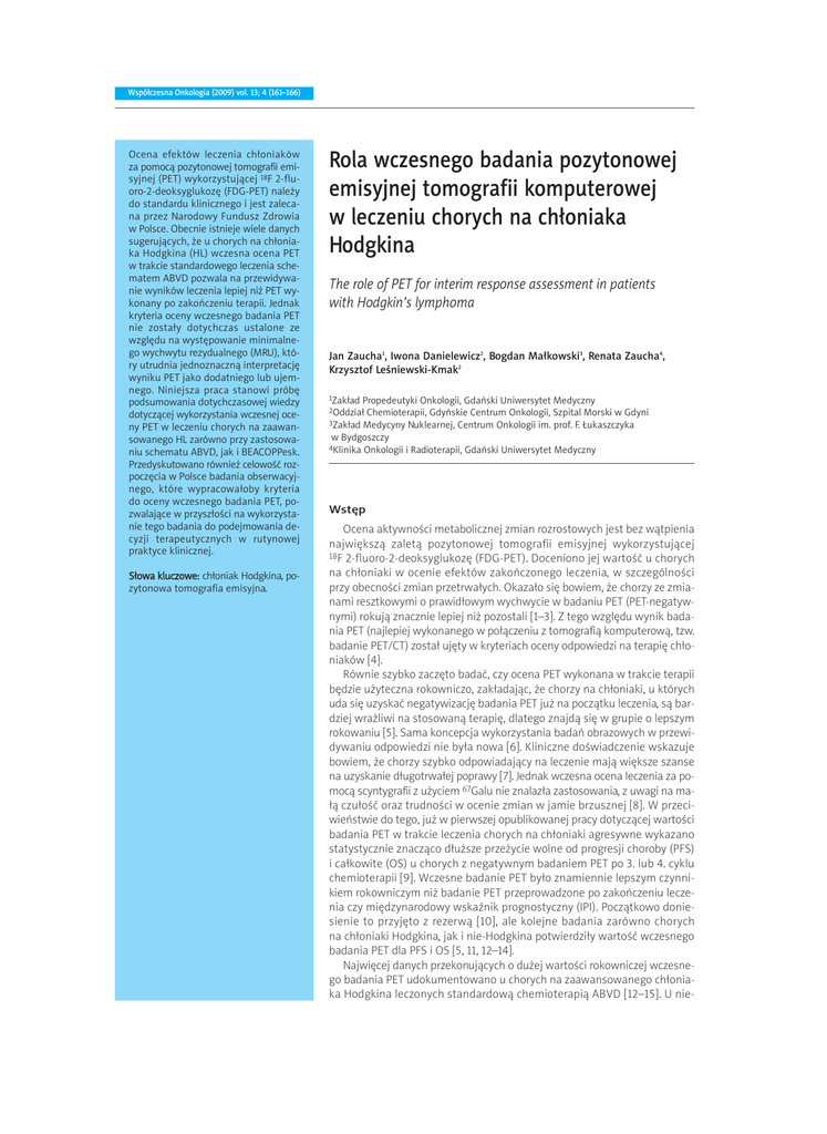 Współczesna Onkologia (2009) vol. 13; 4 (161–166) Ocena efektów leczenia chłoniaków za pomocą pozytonowej tomografii emisyjnej (PET) wykorzystującej 18F 2-fluoro-2-deoksyglukozę (FDG-PET) należy do standardu klinicznego i jest zalecana przez Narodowy Fundusz Zdrowia w Polsce. Obecnie istnieje wiele danych sugerujących, że u chorych na chłoniaka Hodgkina (HL) wczesna ocena PET w trakcie standardowego leczenia schematem ABVD pozwala na przewidywanie wyników leczenia lepiej niż PET wykonany po zakończeniu terapii. Jednak kryteria oceny wczesnego badania PET nie zostały dotychczas ustalone ze względu na występowanie minimalnego wychwytu rezydualnego (MRU), który utrudnia jednoznaczną interpretację wyniku PET jako dodatniego lub ujemnego. Niniejsza praca stanowi próbę podsumowania dotychczasowej wiedzy dotyczącej wykorzystania wczesnej oceny PET w leczeniu chorych na zaawansowanego HL zarówno przy zastosowaniu schematu ABVD, jak i BEACOPPesk. Przedyskutowano również celowość rozpoczęcia w Polsce badania obserwacyjnego, które wypracowałoby kryteria do oceny wczesnego badania PET, pozwalające w przyszłości na wykorzystanie tego badania do podejmowania decyzji terapeutycznych w rutynowej praktyce klinicznej. Słowa kluczowe: chłoniak Hodgkina, pozytonowa tomografia emisyjna. Rola wczesnego badania pozytonowej emisyjnej tomografii komputerowej w leczeniu chorych na chłoniaka Hodgkina The role of PET for interim response assessment in patients with Hodgkin’s lymphoma Jan Zaucha1, Iwona Danielewicz2, Bogdan Małkowski3, Renata Zaucha4, Krzysztof Leśniewski-Kmak2 1Zakład Propedeutyki Onkologii, Gdański Uniwersytet Medyczny Chemioterapii, Gdyńskie Centrum Onkologii, Szpital Morski w Gdyni 3Zakład Medycyny Nuklearnej, Centrum Onkologii im. prof. F. Łukaszczyka w Bydgoszczy 4Klinika Onkologii i Radioterapii, Gdański Uniwersytet Medyczny 2Oddział Wstęp Ocena aktywności metabolicznej zmian rozrostowych jest bez wątpienia największą zaletą pozytonowej tomografii emisyjnej wykorzystującej 18F 2-fluoro-2-deoksyglukozę (FDG-PET). Doceniono jej wartość u chorych na chłoniaki w ocenie efektów zakończonego leczenia, w szczególności przy obecności zmian przetrwałych. Okazało się bowiem, że chorzy ze zmianami resztkowymi o prawidłowym wychwycie w badaniu PET (PET-negatywnymi) rokują znacznie lepiej niż pozostali [1–3]. Z tego względu wynik badania PET (najlepiej wykonanego w połączeniu z tomografią komputerową, tzw. badanie PET/CT) został ujęty w kryteriach oceny odpowiedzi na terapię chłoniaków [4]. Równie szybko zaczęto badać, czy ocena PET wykonana w trakcie terapii będzie użyteczna rokowniczo, zakładając, że chorzy na chłoniaki, u których uda się uzyskać negatywizację badania PET już na początku leczenia, są bardziej wrażliwi na stosowaną terapię, dlatego znajdą się w grupie o lepszym rokowaniu [5]. Sama koncepcja wykorzystania badań obrazowych w przewidywaniu odpowiedzi nie była nowa [6]. Kliniczne doświadczenie wskazuje bowiem, że chorzy szybko odpowiadający na leczenie mają większe szanse na uzyskanie długotrwałej poprawy [7]. Jednak wczesna ocena leczenia za pomocą scyntygrafii z użyciem 67Galu nie znalazła zastosowania, z uwagi na małą czułość oraz trudności w ocenie zmian w jamie brzusznej [8]. W przeciwieństwie do tego, już w pierwszej opublikowanej pracy dotyczącej wartości badania PET w trakcie leczenia chorych na chłoniaki agresywne wykazano statystycznie znacząco dłuższe przeżycie wolne od progresji choroby (PFS) i całkowite (OS) u chorych z negatywnym badaniem PET po 3. lub 4. cyklu chemioterapii [9]. Wczesne badanie PET było znamiennie lepszym czynnikiem rokowniczym niż badanie PET przeprowadzone po zakończeniu leczenia czy międzynarodowy wskaźnik prognostyczny (IPI). Początkowo doniesienie to przyjęto z rezerwą [10], ale kolejne badania zarówno chorych na chłoniaki Hodgkina, jak i nie-Hodgkina potwierdziły wartość wczesnego badania PET dla PFS i OS [5, 11, 12–14]. Najwięcej danych przekonujących o dużej wartości rokowniczej wczesnego badania PET udokumentowano u chorych na zaawansowanego chłoniaka Hodgkina leczonych standardową chemioterapią ABVD [12–15]. U nie- Współczesna Onkologia (2009) vol. 13; 4 (161–166) 18F 2-fluoro-2-deoxyglucose positron emission tomography (FDG-PET) assessment after completion of therapy for lymphomas has been recently incorporated into the clinical guidelines and is also advocated in Poland by the National Health Fund. There is emerging evidence that in patients with Hodgkin’s lymphoma (HL) PET performed early during chemotherapy predicts the therapy response better than post-therapy PET. However, it is not clear which criteria should be adopted for an interim PET assessment because of minimal residual uptake (MRU), which hampers interpretation of PET scans as positive or negative. This brief review summarizes the evidence to date for the use of interim PET assessment in patients with advanced HL both using ABVD and BEACOPPesc chemotherapy. The rationale for performing an observational study in Poland aiming at defining criteria used for interim PET assessment which could be utilized in the future as a basis for early therapeutic modification in routine clinical practice is also discussed. Key words: Hodgkin’s lymphoma, positron emission tomography. mal 80% chorych stwierdza się całkowitą normalizację badania PET już po 2 cyklach ABVD. Prawdopodobieństwo 2-letniego przeżycia wolnego od choroby u chorych PET(–) po 2. cyklu ABVD wynosiło niemal 95% i było istotnie większe w porównaniu z wartością 15% u chorych PET(+). Należy podkreślić, że różnice te były widoczne zarówno u chorych z małym (0–2), jak i dużym (3–7) międzynarodowym wskaźnikiem prognostycznym (IPS), co sugeruje wyższość rokowniczą wczesnej oceny PET nad IPS. Wczesne badanie PET w chłoniaku Hodgkina Tak dobre