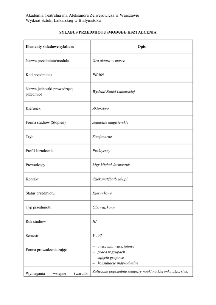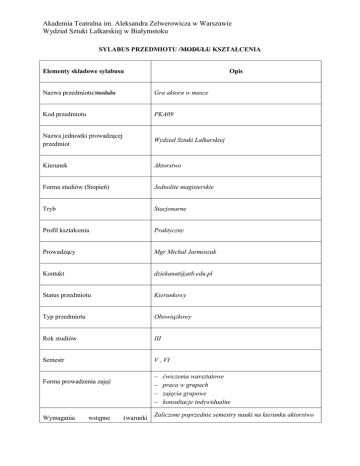 Akademia Teatralna im. Aleksandra Zelwerowicza w Warszawie Wydział Sztuki Lalkarskiej w Białymstoku SYLABUS PRZEDMIOTU /MODUŁU KSZTAŁCENIA Elementy składowe sylabusu Opis Nazwa przedmiotu/modułu Gra aktora w masce Kod przedmiotu PKA09 Nazwa jednostki prowadzącej przedmiot Wydział Sztuki Lalkarskiej Kierunek Aktorstwo Forma studiów (Stopień) Jednolite magisterskie Tryb Stacjonarne Profil kształcenia Praktyczny Prowadzący Mgr Michał Jarmoszuk Kontakt [email protected] Status przedmiotu Kierunkowy Typ przedmiotu Obowiązkowy Rok studiów III Semestr V , VI ćwiczenia warsztatowe praca w grupach zajęcia grupowe konsultacje indywidualne Forma prowadzenia zajęć Wymagania wstępne (warunki Zaliczone poprzednie semestry nauki na kierunku aktorstwo Akademia Teatralna im. Aleksandra Zelwerowicza w Warszawie Wydział Sztuki Lalkarskiej w Białymstoku uczestnictwa) Cele przedmiotu/modułu Treści kształcenia Efekty kształcenia Kształcenie świadomości ciała Style i kanony ruchu jako środek wyrazu w pantomimie i grze aktora w masce Semestr V, VI Kinetyka i biomechanika w sztuce aktorskiej oraz jej wykorzystanie w technice: gra aktora w masce, Poznanie linii estetycznych i dynamicznych, i świadomy ich wybór jako środka wyrazu aktorskiego w technice: gra aktora w masce Budowanie postaci i jej charakterystyczności narzuconej przez formę jaką jest maska W zakresie wiedzy (W) student: rozróżnia style gry w technice maskowej (tradycyjnej jak i współczesnej), a także wymienia ich przedstawicieli A_W5 poszukuje i uzupełnia wiedzę z zakresu ruchu scenicznego, pantomimy i gry aktora w masce A_W7 posiada szeroką wiedzę dotyczącą realizacji prac artystycznych związaną z teatrem maski, jak również pełną wiedzę dotyczącą środków ekspresji i umiejętności warsztatowych pokrewnych dyscyplin A_W9 W zakresie umiejętności (U) student: dysponuje umiejętnościami potrzebnymi do realizacji własnych koncepcji artystycznych z zakresu gry aktora w masce A_U1 dysponuje wyspecjalizowanymi umiejętnościami zawodowymi w aspekcie gry aktora w masce A_U5 potrafi poprzez samodzielną pracę doskonalić swój warsztat aktorski A_U9 W zakresie kompetencji społecznych (K) student: pracuje samodzielnie wykazując się przy tym zbieraniem, analizowaniem i interpretowaniem informacji, rozwijaniem idei i formułowaniem krytycznej argumentacji, wewnętrzną motywacją i własną organizacją pracy A_K1 dąży do efektywnego wykorzystania wyobraźni, intuicji, emocjonalności, zdolności twórczego myślenia i twórczej pracy w trakcie rozwiązywania problemów, zdolności elastycznego myślenia, adaptowania się do nowych i zmieniających się okoliczności, umiejętności kontrolowania swoich zachowań i sprostania warunkom związanym z publicznymi prezentacjami A_K2 dyskutuje na temat społecznych, naukowych i etycznych Akademia Teatralna im. Aleksandra Zelwerowicza w Warszawie Wydział Sztuki Lalkarskiej w Białymstoku aspektów związanych z własną pracą. A_K4 Forma zaliczenia przedmiotu Sposoby weryfikacji V sem. - Zaliczenie VI sem. - Egzamin wykonanie pracy zaliczeniowej: wykonanie określonej prezentacji scenicznej etiudy przed komisją egzaminacyjną oraz ocena aktywności w trakcie zajęć. Liczba godzin zajęć dydaktycznych 120 godz. Liczba punktów ECTS 6 pkt. Język wykładowy polski Wykaz literatury podstawowej Wykaz literatury uzupełniającej Uwagi 1. Decroux Etienne, O sztuce mimu, PIW, Warszawa 1967. 2. Lecoq Jacques, Ciało poetyckie, Wrocław 2011. 3. Hera Janina, Z dziejów pantomimy, czyli pałac zaczarowany, Warszawa 1975. 1. Barba Eugenio, Savarese Nicola, Sekretna sztuka aktora, Wrocław 2005. 2. MOVEMENT FOR ACTORS, Allworth Press, NYC, Lipiec 2002 r 3. Jerzy Grotowski Ku teatrowi ubogiemu. Opracował Eugenio Barba, przedmowa Peter Brook, przekład z języka angielskiego Grzegorz Ziółkowski, redakcja wydania polskiego Leszek Kolankiewicz, Instytut im. Jerzego Grotowskiego, Wrocław 2007 4. T. S. Eliot: The Dry Salvages i inni autorzy w pracy zbiorowej pt: Świadomość ruchu. Teksty o tańcu współczesnym. Red. J. Majewska. Wyd. Korporacja Ha!art. Kraków 2013. 5. Anna R. Burzyńska, Maska twarzy. Twórczość dramatyczna Stanisława Grochowiaka, Wydawnictwo: Księgarnia Akademicka, 2011 Materiał uzupełniający: projekcje DVD wybranych spektakli
