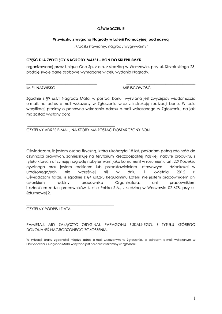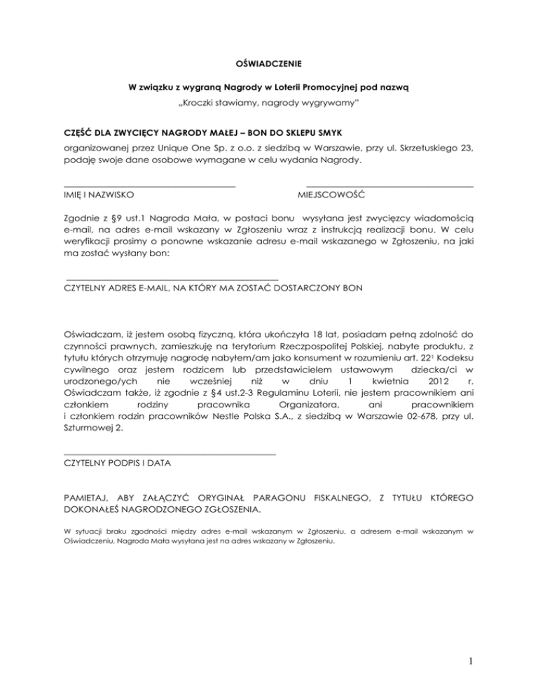 OŚWIADCZENIE W związku z wygraną Nagrody w Loterii Promocyjnej pod nazwą „Kroczki stawiamy, nagrody wygrywamy” CZĘŚĆ DLA ZWYCIĘCY NAGRODY MAŁEJ – BON DO SKLEPU SMYK organizowanej przez Unique One Sp. z o.o. z siedzibą w Warszawie, przy ul. Skrzetuskiego 23, podaję swoje dane osobowe wymagane w celu wydania Nagrody. ______________________________________ IMIĘ I NAZWISKO _____________________________________ MIEJSCOWOŚĆ Zgodnie z §9 ust.1 Nagroda Mała, w postaci bonu wysyłana jest zwycięzcy wiadomością e-mail, na adres e-mail wskazany w Zgłoszeniu wraz z instrukcją realizacji bonu. W celu weryfikacji prosimy o ponowne wskazanie adresu e-mail wskazanego w Zgłoszeniu, na jaki ma zostać wysłany bon: _______________________________________________ CZYTELNY ADRES E-MAIL, NA KTÓRY MA ZOSTAĆ DOSTARCZONY BON Oświadczam, iż jestem osobą fizyczną, która ukończyła 18 lat, posiadam pełną zdolność do czynności prawnych, zamieszkuję na terytorium Rzeczpospolitej Polskiej, nabyte produktu, z tytułu których otrzymuję nagrodę nabyłem/am jako konsument w rozumieniu art. 221 Kodeksu cywilnego oraz jestem rodzicem lub przedstawicielem ustawowym dziecka/ci w urodzonego/ych nie wcześniej niż w dniu 1 kwietnia 2012 r. Oświadczam także, iż zgodnie z §4 ust.2-3 Regulaminu Loterii, nie jestem pracownikiem ani członkiem rodziny pracownika Organizatora, ani pracownikiem i członkiem rodzin pracowników Nestle Polska S.A., z siedzibą w Warszawie 02-678, przy ul. Szturmowej 2. _______________________________________________ CZYTELNY PODPIS I DATA PAMIETAJ, ABY ZAŁĄCZYĆ ORYGINAŁ PARAGONU FISKALNEGO, Z TYTUŁU KTÓREGO DOKONAŁEŚ NAGRODZONEGO ZGŁOSZENIA. W sytuacji braku zgodności między adres e-mail wskazanym w Zgłoszeniu, a adresem e-mail wskazanym w Oświadczeniu, Nagroda Mała wysyłana jest na adres wskazany w Zgłoszeniu. 1 OŚWIADCZENIE W związku z wygraną Nagrody w Loterii Promocyjnej pod nazwą „Kroczki stawiamy, nagrody wygrywamy” CZEŚĆ DLA ZWYCIĘZCY NAGRODY GŁÓWNEJ: organizowanej przez Unique One Sp. z o.o. z siedzibą w Warszawie, przy ul. Skrzetuskiego 23, podaję swoje dane osobowe wymagane w celu wydania Nagrody. …………………………………………... imię i nazwisko Zwycięzcy …………………………………………... Numer dokumentu potwierdzającego tożsamość zwycięzcy (dowód osobisty lub paszport) …………………………………………... numer PESEL …………………………………………...…………………………………………...…………………………… w przypadku braku numeru PESEL - adres zamieszkania, data urodzenia i obywatelstwo Wybór formy przekazania NAGRODY GŁÓWNEJ* 1. Przekazanie nagrody w formie przelewu bankowego W związku z wygraną Nagrody Głównej w loterii promocyjnej ”Kroczki stawiamy, nagrody wygrywamy” w wysokości 30 000 zł, wnoszę o przelanie uzyskanej nagrody na numer rachunku bankowego: __-____-____- ____- ____-____-____ (numer rachunku bankowego) Potwierdzam, iż jestem posiadaczem rachunku o powyższym numerze** …………………………………………………… podpis Zwycięzcy …………………………………………………… miejsce i data złożenia oświadczenia **w przypadku nieposiadania rachunku bankowego i wskazania rachunku bankowego innej osoby fizycznej, należy podać jej dane osobowe (imię, nazwisko) oraz oświadczenie o zgodzie na przelanie nagrody na jej numer rachunku bankowego. 2. Przekazanie nagrody w formie przekazu pocztowego W związku z wygraną Nagrody Głównej w loterii promocyjnej ”Kroczki stawiamy, nagrody wygrywamy” w wysokości 30 000 zł , wnoszę o przekazanie nagrody przekazem pocztowym pod wskazany adres zamieszkania: 2 …………………………………………... imię i nazwisko Zwycięzcy …………………………………………... ulica (adresu zamieszkania) …………………………………………... kod pocztowy (adresu zamieszkania) …………………………………………... miasto (adresu zamieszkania) …………………………………………………… podpis Zwycięzcy …………………………………………………… miejsce i data złożenia oświadczenia *Proszę wypełnić punkt 1 albo punkt 2. PAMIETAJ, ABY ZAŁĄCZYĆ ORYGINAŁ PARAGONU FISKALNEGO, Z TYTUŁU KTÓREGO DOKONAŁEŚ NAGRODZONEGO ZGŁOSZENIA. 3