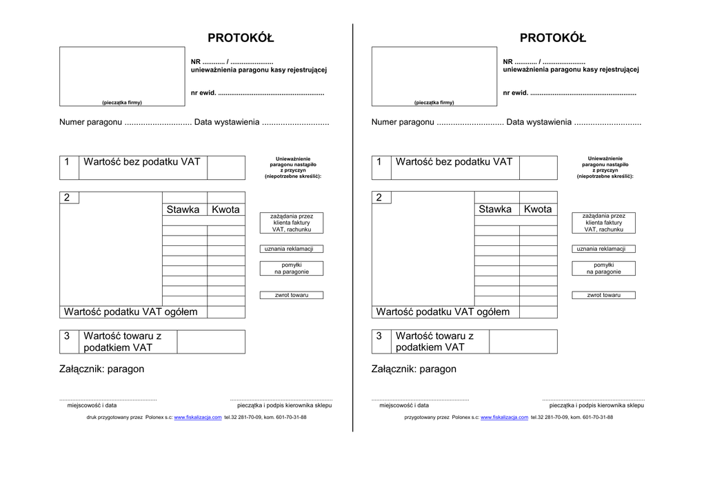 PROTOKÓŁ PROTOKÓŁ NR ............ / ....................... uniewaŜnienia paragonu kasy rejestrującej NR ............ / ....................... uniewaŜnienia paragonu kasy rejestrującej nr ewid. ......................................................... nr ewid. ......................................................... (pieczątka firmy) (pieczątka firmy) Numer paragonu ............................. Data wystawienia ............................. 1 UniewaŜnienie paragonu nastąpiło z przyczyn (niepotrzebne skreślić): Wartość bez podatku VAT Numer paragonu ............................. Data wystawienia ............................. 1 UniewaŜnienie paragonu nastąpiło z przyczyn (niepotrzebne skreślić): Wartość bez podatku VAT 2 2 Stawka Kwota Stawka zaŜądania przez klienta faktury VAT, rachunku uznania reklamacji zaŜądania przez klienta faktury VAT, rachunku uznania reklamacji pomyłki na paragonie pomyłki na paragonie zwrot towaru zwrot towaru Wartość podatku VAT ogółem Wartość podatku VAT ogółem 3 3 Wartość towaru z podatkiem VAT Wartość towaru z podatkiem VAT Załącznik: paragon Załącznik: paragon ............................................................ miejscowość i data Kwota ............................................................... pieczątka i podpis kierownika sklepu druk przygotowany przez Polonex s.c: www.fiskalizacja.com tel.32 281-70-09, kom. 601-70-31-88 ............................................................ miejscowość i data ............................................................... pieczątka i podpis kierownika sklepu przygotowany przez Polonex s.c: www.fiskalizacja.com tel.32 281-70-09, kom. 601-70-31-88