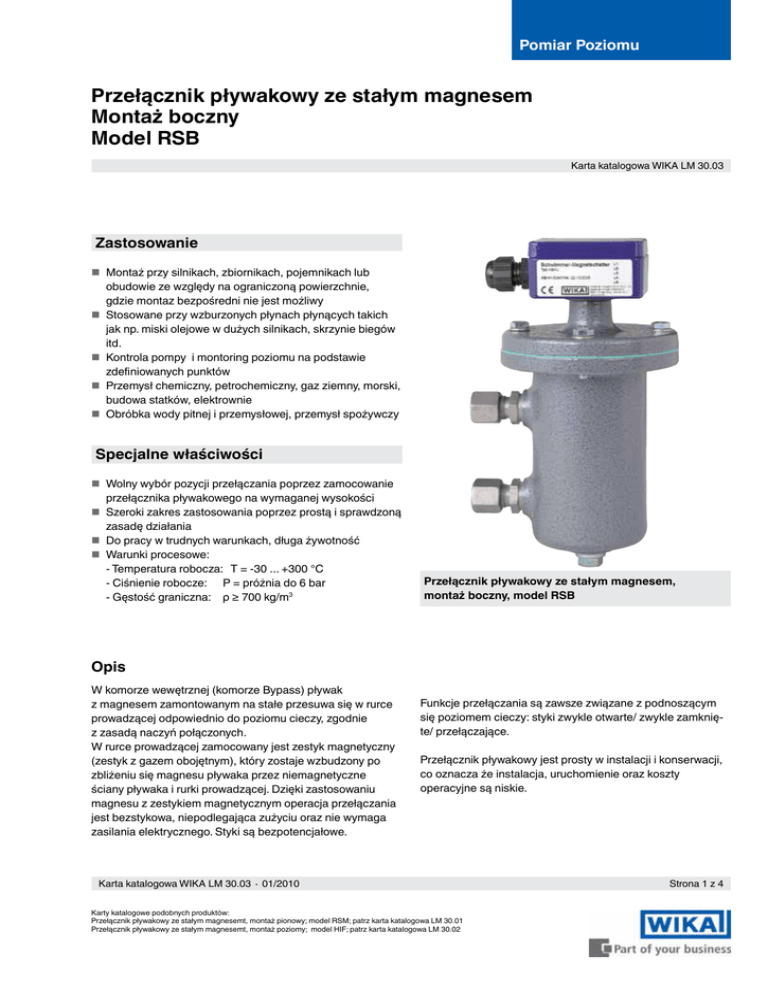 Pomiar Poziomu Przełącznik pływakowy ze stałym magnesem Montaż boczny Model RSB Karta katalogowa WIKA LM 30.03 Zastosowanie Montaż przy silnikach, zbiornikach, pojemnikach lub obudowie ze względy na ograniczoną powierzchnie, gdzie montaz bezpośredni nie jest możliwy Stosowane przy wzburzonych płynach płynących takich jak np. miski olejowe w dużych silnikach, skrzynie biegów itd. Kontrola pompy i montoring poziomu na podstawie zdefiniowanych punktów Przemysł chemiczny, petrochemiczny, gaz ziemny, morski, budowa statków, elektrownie Obróbka wody pitnej i przemysłowej, przemysł spożywczy Specjalne właściwości Wolny wybór pozycji przełączania poprzez zamocowanie przełącznika pływakowego na wymaganej wysokości Szeroki zakres zastosowania poprzez prostą i sprawdzoną zasadę działania Do pracy w trudnych warunkach, długa żywotność Warunki procesowe: - Temperatura robocza: T = -30 ... +300 °C - Ciśnienie robocze: P = próżnia do 6 bar - Gęstość graniczna: ρ ≥ 700 kg/m3 Przełącznik pływakowy ze stałym magnesem, montaż boczny, model RSB Opis W komorze wewętrznej (komorze Bypass) pływak z magnesem zamontowanym na stałe przesuwa się w rurce prowadzącej odpowiednio do poziomu cieczy, zgodnie z zasadą naczyń połączonych. W rurce prowadzącej zamocowany jest zestyk magnetyczny (zestyk z gazem obojętnym), który zostaje wzbudzony po zbliżeniu się magnesu pływaka przez niemagnetyczne ściany pływaka i rurki prowadzącej. Dzięki zastosowaniu magnesu z zestykiem magnetycznym operacja przełączania jest bezstykowa, niepodlegająca zużyciu oraz nie wymaga zasilania elektrycznego. Styki są bezpotencjałowe. Funkcje przełączania są zawsze związane z podnoszącym się poziomem cieczy: styki zwykle otwarte/ zwykle zamknięte/ przełączające. Przełącznik pływakowy jest prosty w instalacji i konserwacji, co oznacza że instalacja, uruchomienie oraz koszty operacyjne są niskie. Karta katalogowa WIKA LM 30.03 ∙ 01/2010 Karty katalogowe podobnych produktów: Przełącznik pływakowy ze stałym magnesemt, montaż pionowy; model RSM; patrz karta katalogowa LM 30.01 Przełącznik pływakowy ze stałym magnesemt, montaż poziomy; model HIF; patrz karta katalogowa LM 30.02 Strona 1 z 4 Dodakowe właściwości specjalne Opcjonalnie Rura i pływak ze stali CrNi 1.4571 Komora z aluminium AlMg5 lub czerwonego żeliwa Rg5 Uniwersalne przetwarzanie sygnału:: możliwe jest bezpośrednie podłączenie do sterownika programowanego (PLC), złącza NAMUR, wzmocnienie sygnału/styku przekaźnika ochronnego Działa niezależnie od spienienia, przewodności, stałej dielektrycznej, ciśnienia, próżni, temperatury, pary, kondensacji, pęcherzyków, wpływu wrzenia oraz drgań. Maksymalnie dwa punkty przełączające Wysoka powtarzalność nastawy Wyłączniki pływakowe ze stałymi magnesami są kwalifikowane jako pasywny sprzęt elektryczny zgodnie z DIN IEC 60 079-11 i mogą być instalowane w „Strefie 1” niebezpiecznych obszarów bez certyfikacji, pod warunkiem, że sprzęt jest obsługiwany w certyfikowanym bezpiecznym beziskrowym obwodzie o minimalnej ochronie przeciwwybuchowej EEx ib. Wykonanie wg specyfikacji klienta Komora i inne elementy budowy wykonane ze stali CrNi1.4571, z innym przyłączami procesowymi i z 6 punktami przełączającymi Strona 2 z 4 Karta katalogowa WIKA LM 30.03 ∙ 01/2010 Wersja standardowa Wymiary w mm Skrzynka zaciskowa Komora Pozycja przełączania Śruba odpowietrzająca G ¼" Dane techniczne Komora n aluminium AlMg5 czerwony brąz Rg5 Przyłącze elektryczne skrzynka zaciskowa aluminium 64 x 58 x 34 mm Przyłącze procesowe złącze zaciskowe GE10-LR, stal ocynkowana Max. ciśnienie robocze 1 bar (komora aluminiowa) 6 bar (komora z czerwonego brązu) Pływak materiał: stal CrNi 1.4571 średnica zew.: 44 mm, średnica wew.: 15 mm gęstość graniczna: 85 %: 818 kg/m³ gęstość nominalna: 50 %: 1390 kg/m³ Rura materiał: stal CrNi 1.4571 średnica: 12 mm Zakres temperatury -30 ... +150 °C Funkcja przełączania styk przełączający U pozycja przełącznika stała ( patrz rysunek) max. liczba styków Moc przełączania 2xU 230 V AC; 40 VA; 1 A 230 V DC; 20 W; 0,5 A patrz proszę ochrona kontaktów (patrz S. 4)! Uwaga: wersja bez ochronnego przewodu - praca w strefie niskiego napięcia np. przekaźnik stykowy WIKA lub zewnętrzne uziemienie Montaż pionowy ± 30° Stopień ochrony IP 65 wg EN 60 529 / lEC 529 Schemat podłączenia 1 punkt przełączający niebieski (1) brązowy (2) czarny (3) Karta katalogowa WIKA LM 30.03 ∙ 01/2010 1 punkt przełączający Okablowanie do pracy SPS niebieski (1) brązowy (2) czarny (3) 22 Ohm 1 punkt przełączający Inicjator - schemat zastępczy wg EN 60 947-5-6 niebieski (1) brązowy (2) czarny (3) 1K 10 K 10 K Strona 3 z 4 Ochrona kontaktów Aby zapewnić bezpieczną pracą czujnika z przełącznikiem kontaktronowym i długą żywotność przyrządu należy przestrzegać S1 poniższych zasada bezpieczeństwa. S1 Pomiar wartości S1 szczytowej prądu 24 V DC za pomocą oscyloskopu 24 V DC S1 Obciążenie idukcyjne AC S1 24 - 230VS1 AC R R 24 - 230V AC C RC 24 - 230V AC RC-moduły w zależności od napięcia roboczego patrz tabela C + 24 - 250V DCS1 + 24 - 250V DC C = 0,33 µF/24 V DC Ograniczenie prądu dla obciążenia pojemnościowego RS np. SPS, S1 PLS i kabel > 50m 3-10 t (? s) C1 SPS C1 SPS t (? s) Moduły RC, w zależności od napięcia roboczego, mają być wykorzystywane wyłącznie zgodnie z poniższą tabelą. D D Rs = 22 Ohm (47 Ohm przy 10 VA kontaktach) C1= wew. pojemność elektryczna D L 200 200 RS S1 RS Ograniczenie prądu dla elektronicznego przekaź+ S1 RS C1 nika czasowego + V AC 230 – CZeit1 relais ZeitC1 relais Zeitrelais Rs = 220 Ohm (230 V AC) C1= wew. pojemność elektryczna D = Ø 16 mm - Ø 25 mm L = 26 mm - 58 mm Litze Dla przekaźnika kontaktronowego od 10-40 VA 200 S1 dopuszczalny zakres t (?µ s) 3-10 Moduły ochronne RC C1 SPS – 3-10 L 