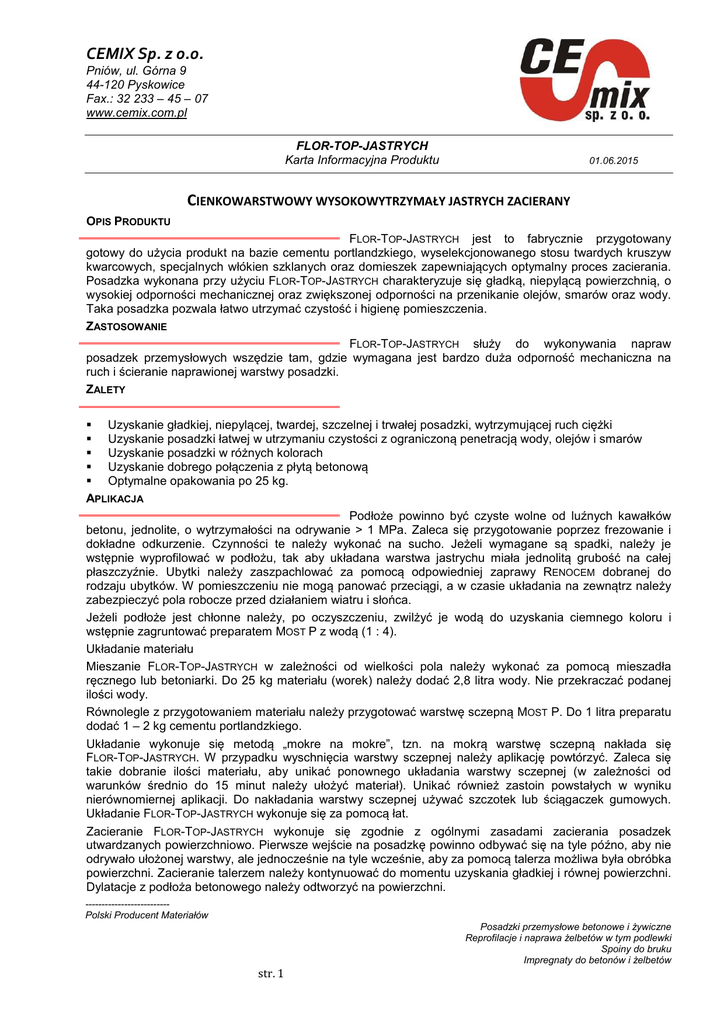 CEMIX Sp. z o.o. Pniów, ul. Górna 9 44-120 Pyskowice Fax.: 32 233 – 45 – 07 www.cemix.com.pl FLOR-TOP-JASTRYCH Karta Informacyjna Produktu 01.06.2015 CIENKOWARSTWOWY WYSOKOWYTRZYMAŁY JASTRYCH ZACIERANY OPIS PRODUKTU FLOR-TOP-JASTRYCH jest to fabrycznie przygotowany gotowy do użycia produkt na bazie cementu portlandzkiego, wyselekcjonowanego stosu twardych kruszyw kwarcowych, specjalnych włókien szklanych oraz domieszek zapewniających optymalny proces zacierania. Posadzka wykonana przy użyciu FLOR-TOP-JASTRYCH charakteryzuje się gładką, niepylącą powierzchnią, o wysokiej odporności mechanicznej oraz zwiększonej odporności na przenikanie olejów, smarów oraz wody. Taka posadzka pozwala łatwo utrzymać czystość i higienę pomieszczenia. ZASTOSOWANIE FLOR-TOP-JASTRYCH służy do wykonywania napraw posadzek przemysłowych wszędzie tam, gdzie wymagana jest bardzo duża odporność mechaniczna na ruch i ścieranie naprawionej warstwy posadzki. ZALETY Uzyskanie gładkiej, niepylącej, twardej, szczelnej i trwałej posadzki, wytrzymującej ruch ciężki Uzyskanie posadzki łatwej w utrzymaniu czystości z ograniczoną penetracją wody, olejów i smarów Uzyskanie posadzki w różnych kolorach Uzyskanie dobrego połączenia z płytą betonową Optymalne opakowania po 25 kg. APLIKACJA Podłoże powinno być czyste wolne od luźnych kawałków betonu, jednolite, o wytrzymałości na odrywanie > 1 MPa. Zaleca się przygotowanie poprzez frezowanie i dokładne odkurzenie. Czynności te należy wykonać na sucho. Jeżeli wymagane są spadki, należy je wstępnie wyprofilować w podłożu, tak aby układana warstwa jastrychu miała jednolitą grubość na całej płaszczyźnie. Ubytki należy zaszpachlować za pomocą odpowiedniej zaprawy RENOCEM dobranej do rodzaju ubytków. W pomieszczeniu nie mogą panować przeciągi, a w czasie układania na zewnątrz należy zabezpieczyć pola robocze przed działaniem wiatru i słońca. Jeżeli podłoże jest chłonne należy, po oczyszczeniu, zwilżyć je wodą do uzyskania ciemnego koloru i wstępnie zagruntować preparatem MOST P z wodą (1 : 4). Układanie materiału Mieszanie FLOR-TOP-JASTRYCH w zależności od wielkości pola należy wykonać za pomocą mieszadła ręcznego lub betoniarki. Do 25 kg materiału (worek) należy dodać 2,8 litra wody. Nie przekraczać podanej ilości wody. Równolegle z przygotowaniem materiału należy przygotować warstwę sczepną MOST P. Do 1 litra preparatu dodać 1 – 2 kg cementu portlandzkiego. Układanie wykonuje się metodą „mokre na mokre”, tzn. na mokrą warstwę sczepną nakłada się FLOR-TOP-JASTRYCH. W przypadku wyschnięcia warstwy sczepnej należy aplikację powtórzyć. Zaleca się takie dobranie ilości materiału, aby unikać ponownego układania warstwy sczepnej (w zależności od warunków średnio do 15 minut należy ułożyć materiał). Unikać również zastoin powstałych w wyniku nierównomiernej aplikacji. Do nakładania warstwy sczepnej używać szczotek lub ściągaczek gumowych. Układanie FLOR-TOP-JASTRYCH wykonuje się za pomocą łat. Zacieranie FLOR-TOP-JASTRYCH wykonuje się zgodnie z ogólnymi zasadami zacierania posadzek utwardzanych powierzchniowo. Pierwsze wejście na posadzkę powinno odbywać się na tyle późno, aby nie odrywało ułożonej warstwy, ale jednocześnie na tyle wcześnie, aby za pomocą talerza możliwa była obróbka powierzchni. Zacieranie talerzem należy kontynuować do momentu uzyskania gładkiej i równej powierzchni. Dylatacje z podłoża betonowego należy odtworzyć na powierzchni. -------------------------Polski Producent Materiałów Posadzki przemysłowe betonowe i żywiczne Reprofilacje i naprawa żelbetów w tym podlewki Spoiny do bruku Impregnaty do betonów i żelbetów str. 1 CEMIX Sp. z o.o. Pniów, ul. Górna 9 44-120 Pyskowice Fax.: 32 233 – 45 – 07 www.cemix.com.pl FLOR-TOP-JASTRYCH Karta Informacyjna Produktu 01.06.2015 PARAMETRY TECHNICZNE 10 KG/ 5 MM /1M2 ZUŻYCIE FLOR-TOP-JASTRYCH 0,5 – 0,7 L/M2 ZUŻYCIE MOST P ZUŻYCIE CEMENTU /OPCJA WYKONANIA/ 1,0 – 1,5KG/1 LITR MOST P WYTRZYMAŁOŚĆ NA ŚCISKANIE PO 28 DNIACH > 60 MPA WYTRZYMAŁOŚĆ NA ZGINANIE PO 28 DNIACH > 7 MPA WYTRZYMAŁOŚĆ NA ŚCIERANIE WEDŁUG TARCZY BOEHMEGO KLASA A6 ODPORNOŚĆ NA ŚCIERANIE WG BCA AR 0,5 SKURCZ ≤ 0,12 % WOREK 25 KG, PALETA 1000 KG OPAKOWANIE OD 5 DO 30 OC ZAKRES STOSOWANIA SKŁADOWANIE DO 12 MIESIĘCY W SUCHYCH I CHŁODNYCH WARUNKACH KOLORY PLATYNOWY, SZARY, GRAFITOWY, ZIELONY, CZERWONY POZOSTAŁE NA ZAMÓWIENIE PO WYKONANIU PRÓB MYCIE I KONSERWACJA ZGODNIE Z INSTRUKCJĄ PRODUCENTA Wyrób posiada aprobatę ITB, badanie w warunkach laboratoryjnych PIELĘGNACJA I EKSPLOATACJA Pielęgnację rozpoczyna się niezwłoczne po zakończeniu obróbki powierzchni zacieraczką z łopatkami. Pielęgnację prowadzić poprzez spryskanie całej posadzki jednym z zalecanych przez producenta preparatów pielęgnujących: FLOSIL, FLOSIL H, FLOSIL W lub FLOSIL C. Doboru pielęgnatora należy dokonać na podstawie warunków zewnętrznych oraz ogólnych uwarunkowań placu budowy. W szczególnych przypadkach na posadzce mogą pojawić się tzw. pęknięcia włoskowate. Nie obniżają one parametrów wytrzymałościowych posadzki i są typowym zjawiskiem dla posadzek betonowych. W początkowym okresie posadzka wykazuje silne przebarwienia, które w czasie dojrzewania zanikają ujednolicając kolor. ŚRODKI OSTROŻNOŚCI FLOR-TOP-JASTRYCH zawiera cement portlandzki, który w kontakcie z wodą powoduje powstanie czynników silnie zasadowych, mogących powodować oparzenia, podrażnienia i wysypkę. Należy nosić odpowiednie ubranie, rękawice i okulary ochronne. W przypadku kontaktu ze skórą należy natychmiast wymyć ją czystą wodą. W przypadku kontaktu z oczami należy je dokładnie przepłukać dużą ilością czystej wody i zwrócić się o pomoc lekarską. Informacje są podane przy uwzględnieniu aktualnego stanu wiedzy i doświadcz