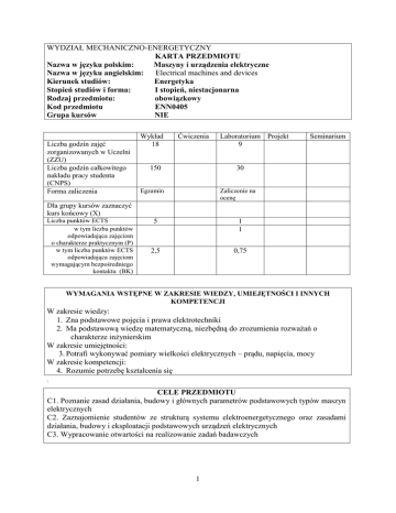 WYDZIAŁ MECHANICZNO-ENERGETYCZNY KARTA PRZEDMIOTU Nazwa w języku polskim: Maszyny i urządzenia elektryczne Nazwa w języku angielskim: Electrical machines and devices Kierunek studiów: Energetyka Stopień studiów i forma: I stopień, niestacjonarna Rodzaj przedmiotu: obowiązkowy Kod przedmiotu ENN0405 Grupa kursów NIE Liczba godzin zajęć zorganizowanych w Uczelni (ZZU) Liczba godzin całkowitego nakładu pracy studenta (CNPS) Forma zaliczenia Wykład 18 Ćwiczenia 150 Laboratorium Projekt 9 Seminarium 30 Egzamin Zaliczenie na ocenę Dla grupy kursów zaznaczyć kurs końcowy (X) Liczba punktów ECTS w tym liczba punktów odpowiadająca zajęciom o charakterze praktycznym (P) w tym liczba punktów ECTS odpowiadająca zajęciom wymagającym bezpośredniego kontaktu (BK) 5 1 1 2,5 0,75 WYMAGANIA WSTĘPNE W ZAKRESIE WIEDZY, UMIEJĘTNOŚCI I INNYCH KOMPETENCJI W zakresie wiedzy: 1. Zna podstawowe pojęcia i prawa elektrotechniki 2. Ma podstawową wiedzę matematyczną, niezbędną do zrozumienia rozważań o charakterze inżynierskim W zakresie umiejętności: 3. Potrafi wykonywać pomiary wielkości elektrycznych – prądu, napięcia, mocy W zakresie kompetencji: 4. Rozumie potrzebę kształcenia się \ CELE PRZEDMIOTU C1. Poznanie zasad działania, budowy i głównych parametrów podstawowych typów maszyn elektrycznych C2. Zaznajomienie studentów ze strukturą systemu elektroenergetycznego oraz zasadami działania, budowy i eksploatacji podstawowych urządzeń elektrycznych C3. Wypracowanie otwartości na realizowanie zadań badawczych 1 PRZEDMIOTOWE EFEKTY KSZTAŁCENIA Z zakresu wiedzy: PEK_W01 Student zna budowę, zasady działania oraz główne parametry podstawowych grup maszyn elektrycznych PEK_W02 Ma podstawową wiedzę dotyczącą budowy, zasad działania i parametrów urządzeń elektrycznych, pracujących w elektroenergetycznym systemie zasilającym Z zakresu umiejętności: PEK_U01 Umie wykonać pomiary współczynnika mocy odbiornika i korygować jego wartość PEK_U02 Potrafi przeprowadzić podstawowe badania transformatora PEK_U03 Potrafi analizować przebiegi rozruchowe oraz regulować prędkość silnika klatkowego z wykorzystaniem przemiennika częstotliwości Z zakresu kompetencji społecznych: PEK_K01 Jest otwarty na poznawanie rozwiązań technicznych PEK_K02 Potrafi aktywnie pracować w zespole TREŚCI PROGRAMOWE Forma zajęć - wykład Zjawiska wykorzystywane w maszynach i urządzeniach. Maszyny prądu stałego, zasada działania, budowa, połączenia. Podstawowe charakterystyki prądnic. Silniki prądu stałego, rozruch, Wy2 regulacja prędkości, hamowanie. Straty i sprawność. Transformatory jednofazowe, schemat zastępczy, stany pracy, Wy3 transformatory regulacyjne, przekładniki, transformatory trójfazowe. Maszyny indukcyjne, zasada działania, pole wirujące, budowa, Wy4 podstawowe zależności. Silniki indukcyjne, charakterystyki, rozruch, regulacja prędkości, hamowanie. Silnik jednofazowy. Maszyny synchroniczne, zasada działania, budowa, synchronizacja generatorów, rozruch i regulacja poboru mocy przez silniki. Wy5 Przekształtniki, przemienniki częstotliwości, wykorzystanie przekształtników w układach napędowych. Przesyłanie i rozdział energii elektrycznej. Schemat systemu, rodzaje i Wy6 budowa linii zasilających, elementarne układy sieciowe. Stacje transformatorowo-rozdzielcze, rozdzielnie. Zasilanie zakładów przemysłowych, instalacje w budynkach. Sposoby Wy7 pracy punktu neutralnego sieci nn. Działanie prądu na organizm. Środki ochrony przeciwporażeniowej. Budowa i dobór przewodów i kabli, gaszenie łuku, łączniki. Odbiorniki Wy8 oświetleniowe. Parametry określające jakość energii elektrycznej. Działanie układów sterowania, układ samotrzymania stycznika. Egzamin pisemny w terminie zerowym. Elementy układów automatyki: silników i obwodów Wy9 przekaźniki, bezpieczniki. Zabezpieczenia oświetleniowych. Rynek energii elektrycznej. Suma godzin Wy1 2 Liczba godzin 2 2 2 2 2 2 2 2 2 18 Forma zajęć - laboratorium La1 La2 La3 La4 La5 Liczba godzin Zapoznanie z BHP, regulaminem, programem ćwiczeń, obsługą stanowisk laboratoryjnych, omówienie zasad wykonywania sprawozdań Poprawa współczynnika mocy – kompensacja mocy biernej Próby transformatorów trójfazowych Badanie rozruchu silników klatkowych Badanie silnika indukcyjnego zasilanego z przemiennika częstotliwości Suma godzin 1 2 2 2 2 9 STOSOWANE NARZĘDZIA DYDAKTYCZNE N1. Wykład problemowy N2. Prezentacja audiowizualna N3. Laboratorium pomiarowe w grupach ćwiczeniowych, sprawdzanie przygotowania, opracowanie wyników w formie sprawozdania N4. Konsultacje OCENA OSIĄGNIĘCIA PRZEDMIOTOWYCH EFEKTÓW KSZTAŁCENIA Oceny (F – formująca (w trakcie Numer efektu Sposób oceny osiągnięcia efektu semestru), P – podsumowująca (na kształcenia kształcenia koniec semestru) Wykład P Laboratorium F1 PEK_W01PEKW02 Egzamin Sprawdzenie przygotowania do ćwiczeń laboratoryjnych Obserwacja aktywności na PEK_U01PEK_U03 zajęciach Ocena poprawności wykonania sprawozdań z wykonanych badań F2 F3 P=0,6*F1+0,2*F2+0,2*F3 LITERATURA PODSTAWOWA I UZUPEŁNIAJĄCA LITERATURA PODSTAWOWA: [1] Praca zbiorowa: Elektrotechnika i elektronika dla nieelektryków, WNT, Warszawa 2005 [2] Miedziński B.: Elektrotechnika Podstawy i instalacje elektryczne, PWN Warszawa 2000 [3] Markiewicz H.: Instalacje elektryczne, WNT, Warszawa 1996 [4] Plamitzer A.: Maszyny elektryczne, WNT Warszawa 1986 [5] Praca zbiorowa pod kier. Z. Grunwalda: Napęd elektryczny, WNT Warszawa 1987 LITERATURA UZUPEŁNIAJĄCA: [1] Jabłoński W., Płoszajski G.: Elektrotechnika z automatyką, wyd. Szkolne i Ped., Warszawa 1996 [2] Bełdowski T., Markiewicz H.: Stacje i urządzenia elektroenergetyczne, WNT, Warszawa 1998 [3] Markiewicz H.: Bezpieczeństwo w elektroenergetyce, WNT, Warszawa 1999 [4] Karolewski B., Okraszewski Z., Szymański A.: Elektrotechnika. Ćwiczenia laboratoryjne dla wydziałów niee