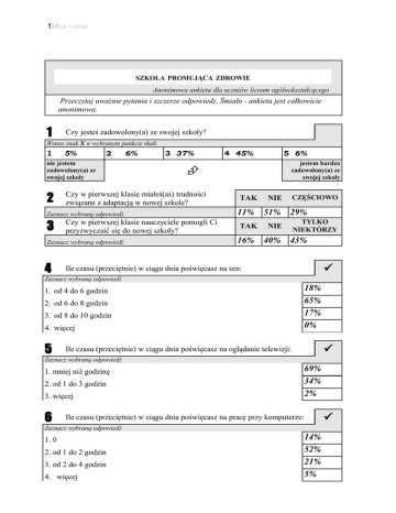 1MOJE LICEUM SZKOŁA PROMUJĄCA ZDROWIE Anonimowa ankieta dla uczniów liceum ogólnokształcącego Przeczytaj uważnie pytania i szczerze odpowiedz. Śmiało - ankieta jest całkowicie anonimowa. 1 Czy jesteś zadowolony(a) ze swojej szkoły? Wstaw znak X w wybranym punkcie skali 1 5% 2 nie jestem zadowolony(a) ze swojej szkoły 2 6% 3 37% Czy w pierwszej klasie miałeś(aś) trudności związane z adaptacją w nowej szkole? Czy w pierwszej klasie nauczyciele pomogli Ci przyzwyczaić się do nowej szkoły? Zaznacz wybraną odpowiedź 4 5 6% jestem bardzo zadowolony(a) ze swojej szkoły Zaznacz wybraną odpowiedź 3 4 45% TAK 11% TAK 16% CZĘŚCIOWO NIE 51% 29% TYLKO NIEKTÓRZY NIE 40% 43% Ile czasu (przeciętnie) w ciągu dnia poświęcasz na sen: Zaznacz wybraną odpowiedź 1. od 4 do 6 godzin 2. od 6 do 8 godzin 3. od 8 do 10 godzin 4. więcej 5 18% 65% 17% 0% Ile czasu (przeciętnie) w ciągu dnia poświęcasz na oglądanie telewizji: Zaznacz wybraną odpowiedź 1. mniej niż godzinę 2. od 1 do 3 godzin 3. więcej 6 69% 34% 2% Ile czasu (przeciętnie) w ciągu dnia poświęcasz na pracę przy komputerze: Zaznacz wybraną odpowiedź 1. 0 2. od 1 do 2 godzin 3. od 2 do 4 godzin 4. więcej 14% 52% 21% 5% 2MOJE LICEUM 7 Ile czasu (przeciętnie) w ciągu dnia poświęcasz na odrabianie pracy domowej Zaznacz wybraną odpowiedź 19% 29% 44% 7% 1. mniej niż godzinę 2. od 1 do 2 godzin 3. od 2 do 4 godzin 4. więcej 8 Ile czasu (przeciętnie) w ciągu dnia poświęcasz na wybrane formy aktywności ruchowej Zaznacz wybraną odpowiedź 17,5% 29% 36% 12,5% 1. 15 minut 2. 1 godzinę 3. 2 godziny 4. więcej 9 Oceń swoje relacje z: Wstaw znak X w wybranym punkcie skali, w każdym z poniższych przykładów 1 2 a) z innymi uczniami w szkole 0% 2% 20% 51% 43% b) z nauczycielami 7,8% 6% 31% 51% 3% c) z wychowawcą 8% 11% 30,6% 40% raczej złe 10 Czy atmosfera panująca w szkole pozwala Ci czuć się bezpiecznie? Zaznacz wybraną odpowiedź 11 Czy jadasz w szkole przynajmniej jeden posiłek? Zaznacz wybraną odpowiedź 12 Czy korzystasz ze stołówki szkolnej? Zaznacz wybraną odpowiedź 3 4 5 9,6% TAK 70% TAK 74% TAK 35% bardzo dobre NIE 3% CZASAMI 27% NIE NIE ZAWSZE 11% NIE 43,5 % 15% CZASAMI 21,5% 3MOJE LICEUM 13 Czy zmieniłbyś coś w pracy stołówki? Zaznacz wybraną odpowiedź 14 TAK 30% NIE 70% Jeżeli tak to co? Cieplejsze posiłki, stołówka powinna być większa, więcej drobiu, mniej mięsa 15 Czy palisz papierosy? TAK NIE CZASAMI Zaznacz wybraną odpowiedź 98% 16 Czy pijesz alkohol? Zaznacz wybraną odpowiedź 17 Czy próbowałeś zażywać narkotyki? Zaznacz wybraną odpowiedź 18 Czy zetknąłeś się w naszej szkole z przemocą? Zaznacz wybraną odpowiedź 19 TAK 8% TAK 2% TAK 16% NIE 63% 2% CZASAMI 29% NIE 98% NIE 84% Jeśli tak to: Zaznacz wybraną odpowiedź 1. byłem ofiarą 2. byłem sprawcą 3.byłem świadkiem 20 16% 8% 76% W szkole najczęściej czujesz się: Zaznacz wszystkie wybrane odpowiedzi 1. zestresowany 2. zrelaksowany 3. znudzony 61% 17,7% 59% 4MOJE LICEUM 17,7 21% 64% 3% 30% 43% 3% 4. doceniany przez nauczycieli 5. niezauważany przez nauczycieli 6. lubiany przez kolegów/koleżanki 7. samotny 8. sprawiedliwie oceniany 9. niesprawiedliwie oceniany 10. nielubiany przez kolegów/koleżanki 21 Czy chciałbyś wziąć udział w warsztatach dotyczących promocji zdrowia i edukacji zdrowotnej? Zaznacz wybraną odpowiedź 22 TAK 43% NIE 57% Jaka tematyka warsztatów zainteresowałaby cię? Zaznacz wszystkie wybrane odpowiedzi 1. zdrowe odżywianie 2. profilaktyka uzależnień 3.zapobieganie HIV/AIDS 4.kontrola stresu 5.zdrowe życie rodzinne 32,% 22,5% 21% 34% 14% 25% 6. stop agresji – radzenie sobie w sytuacjach konfliktowych 7 inne (jakie) 23 Wymień trzy, Twoim zdaniem, główne zalety szkoły Czysta, bezpieczna, monitoring, stołówka, wysoki poziom nauczania, sklepik, przyjazna atmosfera, bogato wyposażone pracownie, kreatywność i zaangażowanie niektórych nauczycieli, szczęśliwy numerek, nowoczesna Dyskoteki i inne imprezy szkolne, radio, segregacja odpadów, przyjmowanie gości z zagranicy, zajęcia pozalekcyjne, segregacja odpadów, przyjemne sale 24 Wymień trzy rzeczy, które Twoim zdaniem, należy w naszej szkole zmienić Sala gimnastyczna, zwiększyć ilość ławek na korytarzu, za dużo sprawdzianów, zły stosunek nauczycieli do uczniów, dodatkowe zajęcia, niesprawiedliwe oceny, brak papieru toaletowego i mydła, nauczyciele nie stosują statutu, wydłużyć przerwę obiadową, więcej tolerancji 5MOJE LICEUM Dziękuję