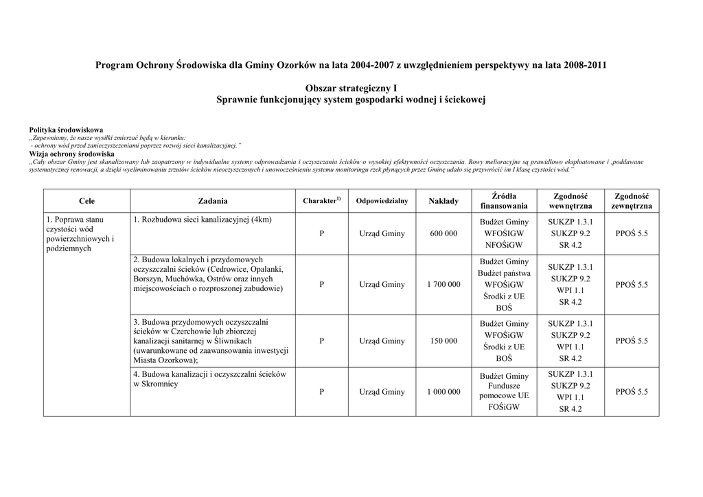 Program Ochrony Środowiska dla Gminy Ozorków na lata 2004-2007 z uwzględnieniem perspektywy na lata 2008-2011 Obszar strategiczny I Sprawnie funkcjonujący system gospodarki wodnej i ściekowej Polityka środowiskowa „Zapewniamy, że nasze wysiłki zmierzać będą w kierunku: - ochrony wód przed zanieczyszczeniami poprzez rozwój sieci kanalizacyjnej.” Wizja ochrony środowiska „Cały obszar Gminy jest skanalizowany lub zaopatrzony w indywidualne systemy odprowadzania i oczyszczania ścieków o wysokiej efektywności oczyszczania. Rowy melioracyjne są prawidłowo eksploatowane i ,poddawane systematycznej renowacji, a dzięki wyeliminowaniu zrzutów ścieków nieoczyszczonych i unowocześnieniu systemu monitoringu rzek płynących przez Gminę udało się przywrócić im I klasę czystości wód.” Cele 1. Poprawa stanu czystości wód powierzchniowych i podziemnych Zadania Charakter1) Odpowiedzialny Nakłady Źródła finansowania Zgodność wewnętrzna Zgodność zewnętrzna P Urząd Gminy 600 000 Budżet Gminy WFOŚIGW NFOŚiGW SUKZP 1.3.1 SUKZP 9.2 SR 4.2 PPOŚ 5.5 1 700 000 Budżet Gminy Budżet państwa WFOŚiGW Środki z UE BOŚ SUKZP 1.3.1 SUKZP 9.2 WPI 1.1 SR 4.2 PPOŚ 5.5 150 000 Budżet Gminy WFOŚiGW Środki z UE BOŚ SUKZP 1.3.1 SUKZP 9.2 WPI 1.1 SR 4.2 PPOŚ 5.5 1 000 000 Budżet Gminy Fundusze pomocowe UE FOŚiGW SUKZP 1.3.1 SUKZP 9.2 WPI 1.1 SR 4.2 PPOŚ 5.5 1. Rozbudowa sieci kanalizacyjnej (4km) 2. Budowa lokalnych i przydomowych oczyszczalni ścieków (Cedrowice, Opalanki, Borszyn, Muchówka, Ostrów oraz innych miejscowościach o rozproszonej zabudowie) 3. Budowa przydomowych oczyszczalni ścieków w Czerchowie lub zbiorczej kanalizacji sanitarnej w Śliwnikach (uwarunkowane od zaawansowania inwestycji Miasta Ozorkowa); 4. Budowa kanalizacji i oczyszczalni ścieków w Skromnicy P P P Urząd Gminy Urząd Gminy Urząd Gminy 2. Zapewnienie mieszkańcom wody do picia dobrej jakości 5. Budowa zbiorczej kanalizacji sanitarnej w Sokolnikach Lesie (jeżeli liczba stałych mieszkańców wzrośnie do 1500); O Urząd Gminy 6. Identyfikacja nielegalnych odprowadzeń ścieków do cieków wodnych P 7. Likwidacja nielegalnych odprowadzeń ścieków do cieków wodnych 8. Opracowanie koncepcji utworzenia stref ochrony pośredniej dla ujęć wód głębinowych 26 000 000 Budżet Gminny, Fundusze Pomocowe UE, FOŚiGW SUKZP 1.3.1 SUKZP 9.2 WPI 1.1 SR 4.2 PPOŚ 5.5 Urząd Gminy bn - SUKZP 9.2 PPOŚ 5.5 P Urząd Gminy bd Budżet Gminy GFOŚiGW SUKZP 9.2 - O Urząd Gminy 3 500 Budżet Gminy SUKZP 9.2 SUKZP 10 - 370 000 Budżet Gminy WFOŚiGW Środki z UE BOŚ SUKZP 9.2 WPI 1.2 PPOŚ 5.5 SUKZP 9.2 WPI 1.2 PPOŚ 5.5 1. Wymiana sieci wodociągowej azbestocementowej na terenie Gminy P Urząd Gminy 2. Rozbudowa sieci wodociągowej w Sokolnikach Lesie 3. Budowa stacji uzdatniania wody w Sokolnikach Lesie 4. Konserwacja zbiornika wodnego w Sokolnikach Lesie 5. Budowa stacji uzdatniania wody i stacji wodociągowej w Skromnicy P Urząd Gminy 121 000 Budżet Gminy WFOŚiGW Środki z UE BOŚ P Urząd Gminy 485 000 Budżet Gminny, WFOŚiGW BOŚ SUKZP 9.2 WPI 1.2 PPOŚ 5.5 60 000 Budżet Gminny, Fundusze Pomocowe UE, WFOŚiGW SUKZP 9.2 WPI 1.2 PPOŚ 5.5 300 000 Budżet Gminy Fundusze pomocowe UE BOŚ SUKZP 9.2 WPI 1.2 PPOŚ 5.5 P P Urząd Gminy Urząd Gminy 3. Zagospodarowanie gnojówki, gnojowicy i obornika 1. Doradztwo dot. budowy płyt obornikowych i zbiorników na gnojowicę P 2. Dofinansowanie budowy płyt obornikowych i zbiorników na gnojowicę 3. Budowa zbiorników na gnojowicę i płyt obornikowych 1. Renowacja i modernizacja urządzeń 4. Mała retencja i melioracje szczegółowe melioracyjnych 2. Właściwe utrzymanie istniejącego systemu melioracyjnego. 4. Sporządzenie studium określającego granice bezpośredniego zagrożenia powodzią oraz inne informacje stanowiące podstawę do prowadzenia akcji przeciwpowodziowej P- podstawowy, O – optymalny, M - maksymalny PPOŚ – Powiatowy Program Ochrony Środowiska SUKZP – Studium uwarunkowań i kierunków zagospodarowania przestrzennego Gminy Ozorków WPI – Wieloletni Plan Inwestycyjny Gminy Ozorków na lata 2003 – 2006 SR – Strategia Rozwoju Gminy Ozorków bn Wg możliwości, przyjętych procedur i wielkości dostępnych środków Według możliwości inwestorów - - - WFOŚ, GFOŚ, środki zewnętrzne - - Środki pomocowe - - SUKZP 1.3.1 SUKZP 9.2 PPOŚ 5.5 M Urząd Gminy P Rolnicy P RZGW, Urząd Gminy 150 000 Zgodnie z założeniami Programu Małej Retencji P RZGW. Urząd Gminy 50 000 Budżet Gminny, WFOŚiGW PFOŚiGW, SUKZP 1.3.1 SUKZP 9.2 PPOŚ 5.5 P Urząd Gminy, Stowarzyszenie Gmin Dorzecza Bzury bd Zgodnie z założeniami „Programu Bzura” SUKZP 9.2 PPOŚ 5.5 P RZGW 15 000 Środki własne - PPOŚ 5.5 3. Realizacja zapisów „Programu Bzura” 1) Urząd Gminy, ODR Obszar strategiczny II Ochrona zasobów przyrody i dziedzictwa kulturowego Polityka środowiskowa „Zapewniamy, że nasze wysiłki zmierzać będą w kierunku: − ochrony unikatowych zasobów przyrody i zachowania bioróżnorodności, − zapobiegania degradacji gleb„ .Wizja ochrony środowiska „Piękne, zachwycające bogactwem gatunków świata roślin i zwierząt lasy, malowniczo wkomponowane w lokalny krajobraz zadrzewienia i zakrzewienia śródpolne oraz objęte ochroną obszary i obiekty przyrodnicze stanowią niezwykłe enklawy dla spragnionych spokoju turystów i mieszkańców i pozwalają na zachowanie dziedzictwa przyrodniczego dla przyszłych pokoleń. O dziedzictwie kulturowym Gminy świadczą świetnie zachowane i utrzymane parki wiejskie z unikalnym drzewostanem” Cele 1. Inwentaryzacja i zapewnienie właściwej ochrony zasobów przyrodniczych na terenie Gminy Charakter1) Odpowiedzialny Nakłady Źródła finansowania Zgodność wewnętrzna Zgodność zewnętrzna 1. Opracowanie dokumentacji ekofizjograficznej/inwentaryzacji przyrodniczej, uwzględniającej obszary i obiekty chronione lub szczególnie cenne. P Urząd Gminy 9000 Eko