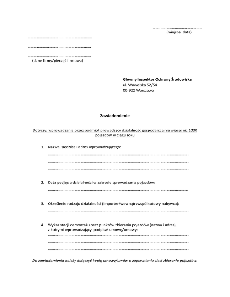 …………………………………………… (miejsce, data) ………………………………………………………… ……………………………………………………….. ……………………………………………………….. (dane firmy/pieczęć firmowa) Główny Inspektor Ochrony Środowiska ul. Wawelska 52/54 00-922 Warszawa Zawiadomienie Dotyczy: wprowadzania przez podmiot prowadzący działalność gospodarczą nie więcej niż 1000 pojazdów w ciągu roku 1. Nazwa, siedziba i adres wprowadzającego: ……………………………………………………………………………………………………………………………… ……………………………………………………………………………………………………………………………… ……………………………………………………………………………………………………………………………… 2. Data podjęcia działalności w zakresie sprowadzania pojazdów: …………………………………………………………………………………………………………………………….. 3. Określenie rodzaju działalności (importer/wewnątrzwspólnotowy nabywca): ……………………………………………………………………………………………………………………………… 4. Wykaz stacji demontażu oraz punktów zbierania pojazdów (nazwa i adres), z którymi wprowadzający podpisał umowę/umowy: ……………………………………………………………………………………………………………………………… ……………………………………………………………………………………………………………………………… ……………………………………………………………………………………………………………………………… Do zawiadomienia należy dołączyć kopię umowy/umów o zapewnieniu sieci zbierania pojazdów.