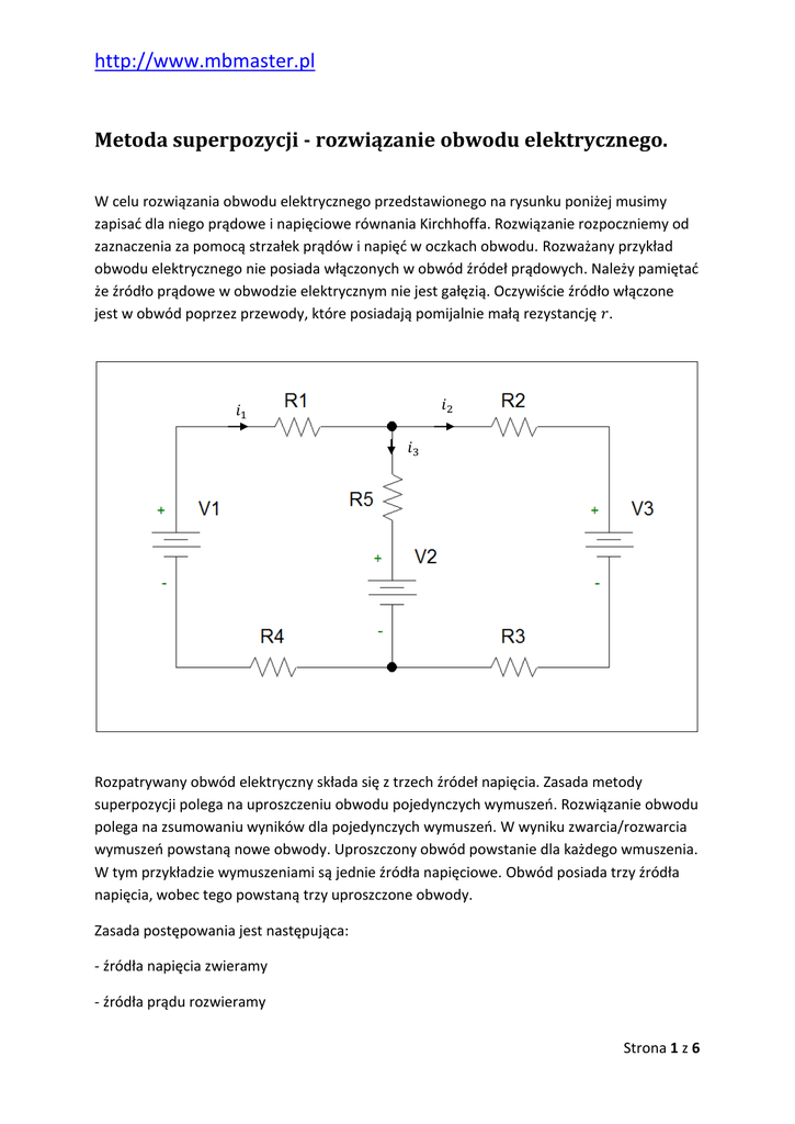 http://www.mbmaster.pl Metoda superpozycji - rozwiązanie obwodu elektrycznego. W celu rozwiązania obwodu elektrycznego przedstawionego na rysunku poniżej musimy zapisać dla niego prądowe i napięciowe równania Kirchhoffa. Rozwiązanie rozpoczniemy od zaznaczenia za pomocą strzałek prądów i napięć w oczkach obwodu. Rozważany przykład obwodu elektrycznego nie posiada włączonych w obwód źródeł prądowych. Należy pamiętać że źródło prądowe w obwodzie elektrycznym nie jest gałęzią. Oczywiście źródło włączone jest w obwód poprzez przewody, które posiadają pomijalnie małą rezystancję . Rozpatrywany obwód elektryczny składa się z trzech źródeł napięcia. Zasada metody superpozycji polega na uproszczeniu obwodu pojedynczych wymuszeń. Rozwiązanie obwodu polega na zsumowaniu wyników dla pojedynczych wymuszeń. W wyniku zwarcia/rozwarcia wymuszeń powstaną nowe obwody. Uproszczony obwód powstanie dla każdego wmuszenia. W tym przykładzie wymuszeniami są jednie źródła napięciowe. Obwód posiada trzy źródła napięcia, wobec tego powstaną trzy uproszczone obwody. Zasada postępowania jest następująca: - źródła napięcia zwieramy - źródła prądu rozwieramy Strona 1 z 6 http://www.mbmaster.pl Prądy w obwodzie pochodzące od źródła napięcia V1. Pierwszym krokiem będzie zwarcie źródeł napięcia i . Po zwarciu wspomnianych źródeł napięcia powstał nowy obwód elektryczny. Prądy płynące w gałęziach obwodu są oznaczone jako , , . Prądy te są prądami , , pochodzącymi tylko od wymuszenia źródłem napięcia . Najpierw wyznaczymy prąd , aby było to możliwe konieczne jest wyznaczenie rezystancji zastępczej tego obwodu. Prąd dany jest równaniem: Pierwsze równanie Kirchhoffa dla obwodu: Rezystancja zastępcza tego obwodu jest równa: Strona 2 z 6 http://www.mbmaster.pl Wobec tego prąd jest równy: Pozostały do wyznaczenia pozostałe dwa prądy. Wyznaczymy więc prąd korzystając z drugiego prawa Kirchhoffa. Zapiszemy drugie równanie Kirchhoffa dla lewego oczka. Prąd równy jest: Do wyznaczenia pozostał prąd prądowe Kirchhoffa. . Wyznaczony zostanie on w oparciu o znane już równanie Prądy w obwodzie pochodzące od źródła napięcia V2. Kolejnym krokiem będzie zwarcie źródeł napięcia i . Strona 3 z 6 http://www.mbmaster.pl Zwarcie źródeł napięć i utworzyło kolejny obwód elektryczny. Prądy płynące w gałęziach obwodu są oznaczone jako , , . Prądy te są prądami , , pochodzącymi tylko od wymuszenia źródłem napięcia . Najpierw wyznaczymy prąd , aby było to możliwe konieczne jest wyznaczenie rezystancji zastępczej tego obwodu. Prąd dany jest równaniem: Pierwsze równanie Kirchhoffa dla obwodu: Rezystancja zastępcza tego obwodu jest równa: Wobec tego prąd jest równy: Niezbędne jest wyznaczenie wartości pozostałych dwóch prądów. Najpierw wyznaczymy prąd . Skorzystamy z równania napięciowego Kirchhoffa dla prawego oczka. Do wyznaczenie pozostał prąd . Prąd ten wyznaczymy w oparciu o znane już równanie prądowe Kirchhoffa dla obwodu. Strona 4 z 6 http://www.mbmaster.pl Prądy w obwodzie pochodzące od źródła napięcia V3. Na tym etapie zadania zewrzemy źródła napięcia i . Zwarcie źródeł napięć i utworzyło kolejny obwód elektryczny. Prądy płynące w gałęziach obwodu są oznaczone jako , , . Prądy te są prądami , , pochodzącymi tylko od wymuszenia źródłem napięcia . Najpierw wyznaczymy prąd , aby było to możliwe konieczne jest wyznaczenie rezystancji zastępczej tego obwodu. Prąd dany jest równaniem: Pierwsze równanie Kirchhoffa dla obwodu: Rezystancja zastępcza tego obwodu jest równa: Wobec tego prąd jest równy: Strona 5 z 6 http://www.mbmaster.pl Pozostało wyznaczyć prądy oraz . Najpierw wyznaczymy prąd równanie napięciowe Kirchhoffa dla lewego oczka obwodu. w oparciu o Równanie napięciowe Kirchhoffa dla lewego oczka obwodu: Pozostał do wyznaczenia prąd Kirchhoffa. . Wyznaczony zostanie on w oparciu o równanie prądowe Wyznaczenie prądów obwodu głównego. Wyznaczone zostały już wszystkie składowe prądów w obwodzie pochodzące od poszczególnych wymuszeń. Prądy główne w obwodzie są zatem opisane następującymi równaniami. Strona 6 z 6