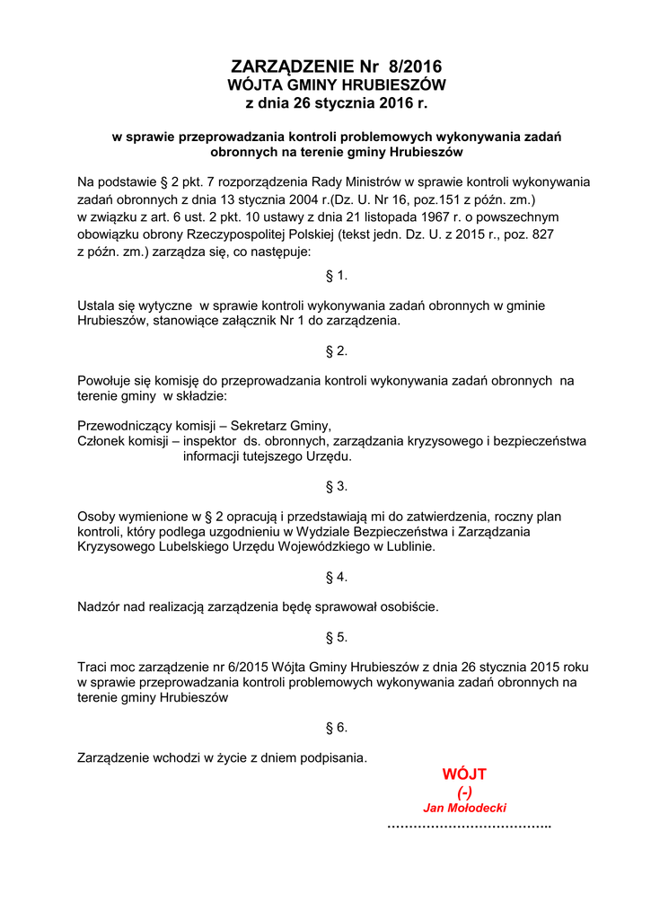 ZARZĄDZENIE Nr 8/2016 WÓJTA GMINY HRUBIESZÓW z dnia 26 stycznia 2016 r. w sprawie przeprowadzania kontroli problemowych wykonywania zadań obronnych na terenie gminy Hrubieszów Na podstawie § 2 pkt. 7 rozporządzenia Rady Ministrów w sprawie kontroli wykonywania zadań obronnych z dnia 13 stycznia 2004 r.(Dz. U. Nr 16, poz.151 z późn. zm.) w związku z art. 6 ust. 2 pkt. 10 ustawy z dnia 21 listopada 1967 r. o powszechnym obowiązku obrony Rzeczypospolitej Polskiej (tekst jedn. Dz. U. z 2015 r., poz. 827 z późn. zm.) zarządza się, co następuje: § 1. Ustala się wytyczne w sprawie kontroli wykonywania zadań obronnych w gminie Hrubieszów, stanowiące załącznik Nr 1 do zarządzenia. § 2. Powołuje się komisję do przeprowadzania kontroli wykonywania zadań obronnych na terenie gminy w składzie: Przewodniczący komisji – Sekretarz Gminy, Członek komisji – inspektor ds. obronnych, zarządzania kryzysowego i bezpieczeństwa informacji tutejszego Urzędu. § 3. Osoby wymienione w § 2 opracują i przedstawiają mi do zatwierdzenia, roczny plan kontroli, który podlega uzgodnieniu w Wydziale Bezpieczeństwa i Zarządzania Kryzysowego Lubelskiego Urzędu Wojewódzkiego w Lublinie. § 4. Nadzór nad realizacją zarządzenia będę sprawował osobiście. § 5. Traci moc zarządzenie nr 6/2015 Wójta Gminy Hrubieszów z dnia 26 stycznia 2015 roku w sprawie przeprowadzania kontroli problemowych wykonywania zadań obronnych na terenie gminy Hrubieszów § 6. Zarządzenie wchodzi w życie z dniem podpisania. WÓJT (-) Jan Mołodecki ……………………………….. Załącznik Nr 1 do Zarządzenia Nr …./2016 Wójta Gminy Hrubieszów z dnia …..01. 2016 r. WYTYCZNE w sprawie kontroli wykonywania zadań obronnych w gminie. Postanowienia ogólne. Wytyczne określają zakres prowadzenia przez powołaną Komisję kontroli wykonywania zadań obronnych planowanych i realizowanych przez komórki organizacyjne Urzędu Gminy oraz gminne jednostki organizacyjne. Kontrola realizacji zadań obronnych na szczeblu gminnym, może być prowadzona w trybie kontroli problemowej. Zakres i tryb organizowania kontroli. 1. Kontrolę prowadzi się w stosunku do komórek organizacyjnych Urzędu Gminy oraz gminnych jednostek organizacyjnych, realizujących zadania obronne nałożone na zasadach określonych w odrębnych przepisach. 2. Kontrolą obejmuje się wykonywanie zadań obronnych wynikających z ustaw oraz przepisów wydanych na ich podstawie, jak również zarządzeń uprawnionego organu i decyzji administracyjnych. Kontrolę prowadzi się w celu sprawdzenia wykonywania zadań obronnych oraz określenia przygotowań obronnych w jednostce podlegającej kontroli. Sprawdzenie to polega na ustaleniu stanu faktycznego. Przeprowadzanie kontroli 1. Wójt planuje i organizuje kontrole problemowe odpowiednio do zakresu swoich właściwości na administrowanym przez siebie terenie. 2. Osoby wchodzące w skład zespołu kontrolnego prowadzą czynności kontrolne na podstawie dokumentu stwierdzającego tożsamość i upoważnienia wydanego przez organ, który zarządził kontrolę. 4. Przewodniczący zespołu kontrolnego organizuje pracę zespołu, odpowiada za terminowe przeprowadzenie kontroli i prowadzi dokumentację związaną z czynnościami kontrolnymi . 5. O zakresie i terminie kontroli organ zarządzający kontrolę powiadamia kontrolowanego co najmniej na 30 dni przed dniem rozpoczęcia kontroli. 6. Kontrolę problemową prowadzi się w danej jednostce nie częściej jak co 2 lata, bądź sprawdzające każdorazowo w przypadku zaistnienia okoliczności wymagających przeprowadzenia kontroli. Kontrolę realizacji planowania operacyjnego, przygotowania systemu kierowania (stałego dyżuru) przeprowadza: Wojewoda oraz osoby przez niego upoważnione, Wójt oraz osoby przez niego upoważnione. Osoby kontrolujące prowadzą kontrolę na podstawie dokumentu stwierdzającego tożsamość i imiennego upoważnienia wydanego przez organ, który zarządził kontrolę lub osobę działającą w jego imieniu. Wzór upoważnienia (w załączeniu) określa załącznik do rozporządzenia Rady Ministrów z dnia 13 stycznia 2004 r. w sprawie kontroli wykonywania zadań obronnych (Dz. U. 2004 r. Nr 16, poz. 151 z późn. zm.). Z kontroli sporządza się protokół, którego wzór stanowi załącznik nr 2 do niniejszych wytycznych. WÓJT Jan Mołodecki ……………………………………… Zał. 1 - wzór upoważnienia Zał. Nr 2 – wzór protokołu z przeprowadzonej kontroli Załącznik Nr 1 do wytycznych w sprawie kontroli wykonywania zadań obronnych w gminie. WZÓR UPOWAŻNIENIA ............................................. (miejscowość i data) ........................................................ (nazwa organu zarządzającego kontrolę) UPOWAŻNIENIE Nr….... Na podstawie § 13 ust. 2 rozporządzenia Rady Ministrów z dnia 13 stycznia 2004 r. w sprawie kontroli wykonywania zadań obronnych (Dz. U. Nr 16, poz. 151 z późn. zm.), zarządzenia Nr …./2016 Wójta Gminy Hrubieszów z dnia …. stycznia 2016 r. w sprawie organizacji, uruchamiania i funkcjonowania systemów stałych dyżurów w Urzędzie Gminy Hrubieszów i gminnych jednostkach organizacyjnych w stanach gotowości obronnej państwa. upoważniam ............................................................................... (imię i nazwisko) ............................................................................... (imię i nazwisko) do przeprowadzenia kontroli wykonywania zadań obronnych ............................................................................................................................................. (zakres kontroli) w ......................................................................................................................................... (nazwa kontrolowanej jednostki organizacyjnej wykonującej zadania obronne) Upoważnienie jest ważne do ...................................