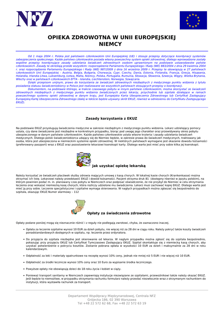 OPIEKA ZDROWOTNA W UNII EUROPEJSKIEJ NIEMCY Od 1 maja 2004 r. Polska jest państwem członkowskim Unii Europejskiej (UE) i stosuje przepisy dotyczące koordynacji systemów zabezpieczenia społecznego. Każde państwo członkowskie posiada własny powszechny system opieki zdrowotnej, dlatego wprowadzone zostały wspólne przepisy koordynujące zasady udzielania świadczeń zdrowotnych osobom uprawnionym na podstawie ustawodawstw państw członkowskich. Zasady te określają przede wszystkim: rozporządzenie Parlamentu Europejskiego i Rady (WE) 883/2004 z dnia 29 kwietnia 2004 r. oraz rozporządzenie Parlamentu Europejskiego i Rady (WE) 987/2009 z dnia 16 września 2009 r. Przepisy te obowiązują w 27 państwach członkowskich Unii Europejskiej - Austria, Belgia, Bułgaria, Chorwacja, Cypr, Czechy, Dania, Estonia, Finlandia, Francja, Grecja, Hiszpania, Holandia, Irlandia Litwa, Luksemburg, Łotwa, Malta, Niemcy, Polska, Portugalia, Rumunia, Słowacja, Słowenia, Szwecja, Węgry, Wielka Brytania, Włochy oraz w państwach członkowskich EFTA - Islandia, Liechtenstein, Norwegia, Szwajcaria. Dzięki przepisom unijnym, prawo do korzystania ze świadczeń zdrowotnych niezbędnych z medycznego punktu widzenia z tytułu posiadania statusu świadczeniobiorcy w Polsce jest realizowane we wszystkich państwach stosujących przepisy o koordynacji. Dokumentem, na podstawie którego, w trakcie czasowego pobytu w innym państwie członkowskim, można skorzystać ze świadczeń zdrowotnych niezbędnych z medycznego punktu widzenia świadczonych przez lekarzy, przychodnie lub szpitale działające w ramach powszechnego systemu opieki zdrowotnej w danym kraju, jest Europejska Karta Ubezpieczenia Zdrowotnego lub Certyfikat Zastępujący Europejską Kartę Ubezpieczenia Zdrowotnego (dalej w tekście będzie używany skrót EKUZ, również w odniesieniu do Certyfikatu Zastępującego EKUZ). Zasady korzystania z EKUZ Na podstawie EKUZ przysługują świadczenia medyczne w zakresie niezbędnym z medycznego punktu widzenia. Lekarz udzielający pomocy ustala, czy dane świadczenie jest niezbędne w konkretnym przypadku, biorąc pod uwagę jego charakter oraz przewidywany okres pobytu ubezpieczonego w danym państwie członkowskim. Każde państwo członkowskie ustala własne kryteria i zasady udzielania świadczeń medycznych. Dlatego polski świadczeniobiorca udający się do Niemiec będzie, w zakresie prawa do świadczeń medycznych, traktowany jak osoba, która jest ubezpieczona w niemieckim systemie opieki zdrowotnej. W niektórych państwach wymagane jest okazanie dowodu tożsamości (preferowany paszport) wraz z EKUZ oraz pozostawienie lekarzowi kserokopii karty. Dlatego warto jest mieć przy sobie kilka jej kserokopii. Jak uzyskać opiekę lekarską Należy korzystać ze świadczeń placówek służby zdrowia mających umowę z kasą chorych. W lokalnej kasie chorych (Krankenkasse) można otrzymać ich listę. Lekarzowi należy przedstawić EKUZ i dowód tożsamości. Pacjent otrzyma druk 81 (dostępny również w języku polskim), na którym powinien podać m. in. planowany czas pobytu w Niemczech oraz podpisać oświadczenie, że nie przybył do Niemiec w celu otrzymania leczenia oraz wskazać niemiecką kasę chorych, która rozliczy udzielone mu świadczenia. Lekarz musi zachować kopię EKUZ. Dlatego warto jest mieć ją przy sobie. Leczenie specjalistyczne i szpitalne wymaga skierowania. W nagłych przypadkach można zgłaszać się bezpośrednio do szpitala, okazując EKUZ.Numer alarmowy – 112 Opłaty za świadczenia zdrowotne Opłaty podane poniżej mogą się nieznacznie różnić i z reguły nie podlegają zwrotowi, chyba, że zaznaczono inaczej. Opłata za leczenie szpitalne wynosi 10 EUR za dzień pobytu, nie więcej niż za 28 dni w ciągu roku. Należy pokryć także koszty świadczeń ponadstandardowych dostępnych w szpitalu, np. leczenie przez ordynatora. Do przyjęcia do szpitala niezbędne jest skierowanie od lekarza. W nagłym przypadku można zgłosić się do szpitala bezpośrednio, pokazując przy przyjęciu EKUZ lub Certyfikat Tymczasowo Zastępujący EKUZ. Szpital skontaktuje się z niemiecką kasą chorych, aby uzyskać potwierdzenie o pokryciu kosztów. Zostanie pobrana opłata w wysokości 10 EUR za dzień i maksymalnie za 28 dni w roku kalendarzowym. Odpłatność za leki i materiały opatrunkowe na receptę wynosi 10% ceny, jednak nie mniej niż 5 EUR i nie więcej niż 10 EUR. Odpłatność za środki lecznicze wynosi 10% ceny oraz 10 Euro za wypisanie środka leczniczego. Powyższe opłaty nie obowiązują dzieci do 18 roku życia i kobiet w ciąży. Ponieważ transport sanitarny w Niemczech zapewniają instytucje niezwiązane ze szpitalami, przewoźnikowi także należy okazać EKUZ. Jeśli będzie to niemożliwe, w przypadku otrzymania rachunku formularz należy przesłać niezwłocznie wraz z otrzymanym rachunkiem do instytucji, która wystawiła rachunek za transport. Departament Współpracy Międzynarodowej, Centrala NFZ Grójecka 186, 02 390 Warszawa Tel +48 22 572 62 68, Fax +48 22 572 63 19 Za transport sanitarny do szpitala na terytorium Niemiec obowiązuje dopłata w wysokości 10%, jednak nie mniej niż 5 EUR i nie więcej niż 10 EUR. Koszty przewozu na leczenie ambulatoryjne są refundowane tylko w wyjątkowych przypadkach. UWAGA! EKUZ nie zapewnia pokrycia kosztów transportu medycznego do Polski oraz obowiązujących w Niemczech dopłat pacjenta za świadczenia medyczne. Dlatego, aby uniknąć obciążenia tymi kosztami, wskazane jest wykupienie dodatkowego prywatnego ubezpieczenia. Recepty Uprawnionym do wystawiania recepty objętej refundacją jest lekarz, który podpisał kontrakt z daną kasą chorych. Leczenie prywatne Jeżeli pacjent nie przedstawi wymaganych dokumentów (EKUZ lub Certyfikat Zastępujący EKUZ), zostanie obciążony kosztami leczenia jako pacjent prywatny. Recepty wystawione w takim przypadku będą realizowane przez apteki za peł