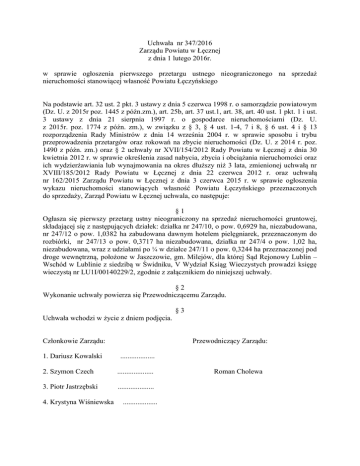 Uchwała nr 347/2016 Zarządu Powiatu w Łęcznej z dnia 1 lutego 2016r. w sprawie ogłoszenia pierwszego przetargu ustnego nieograniczonego na sprzedaż nieruchomości stanowiącej własność Powiatu Łęczyńskiego Na podstawie art. 32 ust. 2 pkt. 3 ustawy z dnia 5 czerwca 1998 r. o samorządzie powiatowym (Dz. U. z 2015r poz. 1445 z późn.zm.), art. 25b, art. 37 ust.1, art. 38, art. 40 ust. 1 pkt. 1 i ust. 3 ustawy z dnia 21 sierpnia 1997 r. o gospodarce nieruchomościami (Dz. U. z 2015r. poz. 1774 z późn. zm.), w związku z § 3, § 4 ust. 1-4, 7 i 8, § 6 ust. 4 i § 13 rozporządzenia Rady Ministrów z dnia 14 września 2004 r. w sprawie sposobu i trybu przeprowadzenia przetargów oraz rokowań na zbycie nieruchomości (Dz. U. z 2014 r. poz. 1490 z późn. zm.) oraz § 2 uchwały nr XVII/154/2012 Rady Powiatu w Łęcznej z dnia 30 kwietnia 2012 r. w sprawie określenia zasad nabycia, zbycia i obciążania nieruchomości oraz ich wydzierżawiania lub wynajmowania na okres dłuższy niż 3 lata, zmienionej uchwałą nr XVIII/185/2012 Rady Powiatu w Łęcznej z dnia 22 czerwca 2012 r. oraz uchwałą nr 162/2015 Zarządu Powiatu w Łęcznej z dnia 3 czerwca 2015 r. w sprawie ogłoszenia wykazu nieruchomości stanowiących własność Powiatu Łęczyńskiego przeznaczonych do sprzedaży, Zarząd Powiatu w Łęcznej uchwala, co następuje: §1 Ogłasza się pierwszy przetarg ustny nieograniczony na sprzedaż nieruchomości gruntowej, składającej się z następujących działek: działka nr 247/10, o pow. 0,6929 ha, niezabudowana, nr 247/12 o pow. 1,0382 ha zabudowana dawnym hotelem pielęgniarek, przeznaczonym do rozbiórki, nr 247/13 o pow. 0,3717 ha niezabudowana, działka nr 247/4 o pow. 1,02 ha, niezabudowana, wraz z udziałami po ¼ w działce 247/11 o pow. 0,3244 ha przeznaczonej pod droge wewnętrzną, położone w Jaszczowie, gm. Milejów, dla której Sąd Rejonowy Lublin – Wschód w Lublinie z siedzibą w Świdniku, V Wydział Ksiąg Wieczystych prowadzi księgę wieczystą nr LU1I/00140229/2, zgodnie z załącznikiem do niniejszej uchwały. §2 Wykonanie uchwały powierza się Przewodniczącemu Zarządu. §3 Uchwała wchodzi w życie z dniem podjęcia. Członkowie Zarządu: 1. Dariusz Kowalski Przewodniczący Zarządu: ................... 2. Szymon Czech .................... 3. Piotr Jastrzębski .................... 4. Krystyna Wiśniewska ................... Roman Cholewa Załącznik do uchwały nr 347/2016 Zarządu Powiatu w Łęcznej z dnia 1 lutego 2016 r. Zarząd Powiatu w Łęcznej ogłasza pierwszy ustny przetarg nieograniczony na sprzedaż nieruchomości położonych w Jaszczowie gm. Milejów stanowiącej własność Powiatu Łęczyńskiego 1. Przedmiotem przetargu są nieruchomości gruntowe, położone w Jaszczowie, gm. Milejów, dla których Sąd Rejonowy Lublin – Wschód w Lublinie z siedzibą w Świdniku, V Wydział Ksiąg Wieczystych prowadzi księgę wieczystą nr LU1I/00140229/2. 2. Nieruchomości usytuowane są ok. 200 m od przebiegającej przez miejscowość drogi wojewódzkiej nr 829 (Łucka – Łęczna – Milejów - Biskupice), na zapleczu zabudowy dawnego szpitala. Dojazd do nieruchomości droga powiatowa nr 2024L (Jaszczów – Jaszczów stacja PKP). Nieruchomość położona jest w otoczeniu zabudowy mieszkaniowej jednorodzinnej, zabudowań siedliskowych, drobnych zakładów naprawczych (samochodowe). 3. Zgodnie z miejscowym planem zagospodarowania przestrzennego gminy Milejów nieruchomość położona jest w terenie oznaczonym symbolem J1ZDP – tereny zabytkowego zespołu dworsko – parkowego wpisanego do ewidencji dóbr kultury województwa lubelskiego oraz RP – teren upraw polowych. W chwili obecnej złożony jest wniosek o zmianę w planie i przeznaczenie terenu całej nieruchomości na usługi publiczne. 1) nieruchomość oznaczona jako działka nr 247/10 o pow. 0,6929 ha, działka gruntowa niezabudowana wraz z udziałem ¼ w działce nr 247/11 o pow. 0,3244 ha, przeznaczonej pod drogę wewnętrzną, cena wywoławcza 324 000 zł w tym należny podatek VAT, wadium 16 200 zł, postąpienie nie mniej niż 3300 zł, 2) nieruchomość oznaczona jako działka nr 247/12 o pow. 1,0382 ha, działka gruntowa zabudowana dawnym hotelem pielęgniarek, przeznaczonym do rozbiórki, wraz z udziałem ¼ w działce nr 247/11 o pow. 0,3244 ha przeznaczonej pod drogę wewnętrzną, cena wywoławcza 254 000 zł, w tym należny podatek VAT, wadium 13 000 zł, postąpienie nie mniej niż 2600 zł, 3) nieruchomość oznaczona jako działka nr 247/13 o pow. 0,3717 ha, działka gruntowa niezabudowana wraz z udziałem ¼ w działce nr 247/11 o pow. 0,3244 ha przeznaczonej pod drogę wewnętrzną, cena wywoławcza 174 000 zł w tym należny podatek VAT, wadium 8 700 zł, postąpienie nie mniej niż 1800 zł, 4) nieruchomość oznaczona jako działka nr 247/4 o pow. 1,02 ha, działka gruntowa niezabudowana, wraz z udziałem ¼ w działce nr 247/11 o pow. 0,3244 ha przeznaczonej pod drogę wewnętrzną, cena wywoławcza 49 000 zł w tym należny podatek VAT, wadium 2 500 zł, postąpienie nie mniej niż 500 zł, 4. Teren, w którym położone są nieruchomości uzbrojony jest w napowietrzną sieć energetyczną oraz w sieci: wodociągową, kanalizacyjną i telefoniczną przebiegające w pobliżu działki. 5. W przetargu mogą uczestniczyć osoby fizyczne i prawne, które wpłacą wadium w formie, terminie i wysokości określonej w ust. 6 niniejszego ogłoszenia. Do uczestnictwa w przetargu osoby prawne winny przedłożyć aktualny wypis ze stosownego rejestru. Dopuszcza się udział w przetargu pełnomocników pod warunkiem okazania pełnomocnictwa z uwierzytelnionym notarialnie podpisem mocodawcy. 6. Warunkiem udziału w przetargu jest przedłożenie w dniu przetargu komisji przetargowej: 1) dokumentu potwierdzającego tożsamość osoby przystępującej do przetargu, 2) pisemnej zgody współmałżonka na nabycie nieruchomości w przypadku, gdy ma ona zostać
