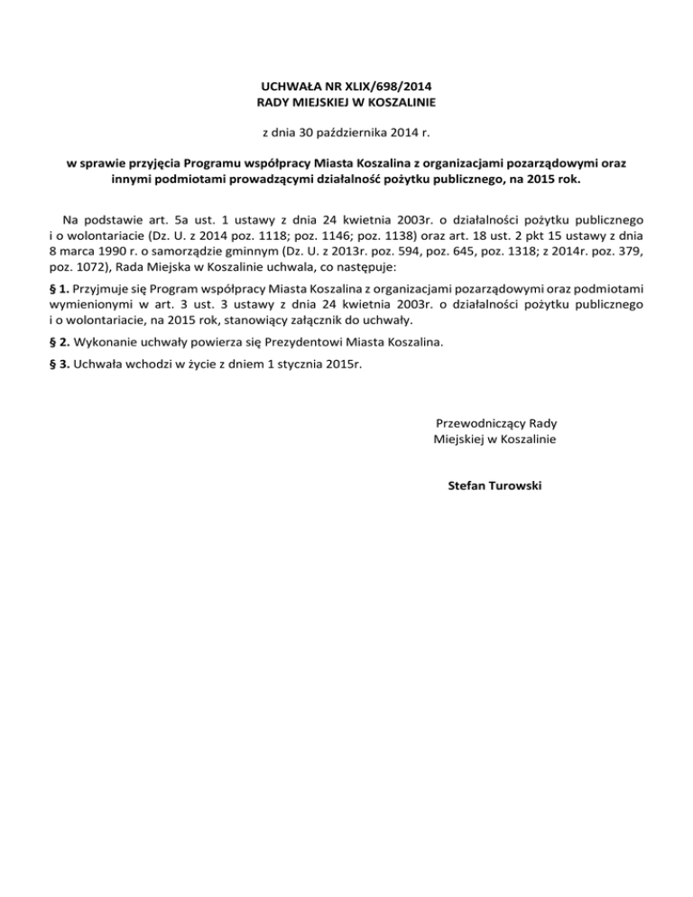UCHWAŁA NR XLIX/698/2014 RADY MIEJSKIEJ W KOSZALINIE z dnia 30 października 2014 r. w sprawie przyjęcia Programu współpracy Miasta Koszalina z organizacjami pozarządowymi oraz innymi podmiotami prowadzącymi działalność pożytku publicznego, na 2015 rok. Na podstawie art. 5a ust. 1 ustawy z dnia 24 kwietnia 2003r. o działalności pożytku publicznego i o wolontariacie (Dz. U. z 2014 poz. 1118; poz. 1146; poz. 1138) oraz art. 18 ust. 2 pkt 15 ustawy z dnia 8 marca 1990 r. o samorządzie gminnym (Dz. U. z 2013r. poz. 594, poz. 645, poz. 1318; z 2014r. poz. 379, poz. 1072), Rada Miejska w Koszalinie uchwala, co następuje: § 1. Przyjmuje się Program współpracy Miasta Koszalina z organizacjami pozarządowymi oraz podmiotami wymienionymi w art. 3 ust. 3 ustawy z dnia 24 kwietnia 2003r. o działalności pożytku publicznego i o wolontariacie, na 2015 rok, stanowiący załącznik do uchwały. § 2. Wykonanie uchwały powierza się Prezydentowi Miasta Koszalina. § 3. Uchwała wchodzi w życie z dniem 1 stycznia 2015r. Przewodniczący Rady Miejskiej w Koszalinie Stefan Turowski Załącznik Nr 1 do Uchwały Nr XLIX/698/2014 Rady Miejskiej w Koszalinie z dnia z dnia 30 października 2014 r. Program współpracy Miasta Koszalina z organizacjami pozarządowymi oraz podmiotami wymienionymi w art. 3 ust. 3 ustawy z dnia 24 kwietnia 2003r. o działalności pożytku publicznego i o wolontariacie, na 2015 rok. Rozdział 1. Postanowienia ogólne § 1. Ilekroć w Programie współpracy Miasta Koszalina z organizacjami pozarządowymi oraz podmiotami wymienionymi w art. 3 ust. 3 ustawy z dnia 24 kwietnia 2003r. o działalności pożytku publicznego i o wolontariacie, na 2015 rok jest mowa o: 1) ustawie - należy przez to rozumieć ustawę z dnia 24 kwietnia 2003 roku o działalności pożytku publicznego i o wolontariacie; 2) organizacji – należy przez to rozumieć organizacje pozarządowe określone w art. 3 ust. 2 ustawy oraz podmioty, wymienione w art. 3 ust. 3 ustawy; 3) Programie – należy przez to rozumieć Program współpracy Miasta Koszalina z organizacjami pozarządowymi oraz podmiotami wymienionymi w art. 3 ust. 3 ustawy z dnia 24 kwietnia 2003r. o działalności pożytku publicznego i o wolontariacie, na 2015 rok.; 4) Mieście – należy przez to rozumieć Gminę Miasto Koszalin; 5) dotacji — należy przez to rozumieć dotacje określone w ustawie z dnia 27 sierpnia 2009 roku o finansach publicznych; 6) konkursie - należy przez to rozumieć otwarty konkurs ofert, o którym mowa w art. 11 ust. 2 ustawy, 7) zadaniu publicznym - należy przez to rozumieć zadania określone w art. 4 ustawy, realizowane przez organizacje; 8) Urzędzie – należy przez to rozumieć Urząd Miejski w Koszalinie; 9) Prezydencie – należy przez to rozumieć Prezydenta Miasta Koszalina; 10) Radzie - należy przez to rozumieć Gminną Radę Działalności Pożytku Publicznego w Koszalinie; 11) Projekcie - należy przez to rozumieć projekt pn. „Koszalin - miasto na model. Program współpracy samorządu z organizacjami pozarządowymi”, finansowany ze środków Europejskiego Funduszu Społecznego i budżetu Państwa w ramach Programu Operacyjnego Kapitał Ludzki: Priorytet V Dobre rządzenie: Działanie 5.4 Rozwój potencjału trzeciego sektora: Poddziałanie 5.4.2 Rozwój dialogu obywatelskiego, realizowany przez Lidera projektu stowarzyszenie pn. Pracownia Pozarządowa oraz partnerów Fundację Nauka dla Środowiska i Gminę Miasto Koszalin, w terminie od 1 stycznia 2014r. do 30 czerwca 2015r.; 12) uchwale konsultacyjnej - należy przez to rozumieć uchwałę Rady Miejskiej w Koszalinie w sprawie szczegółowego sposobu konsultowania z radami działalności pożytku publicznego lub organizacjami pozarządowymi i podmiotami wymienionymi w art. 3 ust. 3 ustawy z dnia 24 kwietnia 2003r. o działalności pożytku publicznego i o wolontariacie, projektów aktów prawa miejscowego w dziedzinach dotyczących działalności statutowej tych organizacji. Rozdział 2. Cel główny i cele szczegółowe Programu § 2. Głównym celem Programu jest budowanie partnerstwa i określenie zakresu i zasad współpracy pomiędzy samorządem a sektorem pozarządowym, które mają służyć efektywnemu wykorzystaniu społecznej aktywności w diagnozowaniu i zaspokajaniu potrzeb mieszkańców Koszalina należących do zadań Miasta, który realizowany będzie poprzez następujące cele szczegółowe: 1) wspólne określanie i rozwiązywanie problemów lokalnej społeczności, 2) tworzenie warunków do budowania coraz lepszej współpracy, poprzez stałą poprawę komunikacji pomiędzy samorządem a organizacjami, 3) wzmacnianie skuteczności i efektywności wykonywania zadań publicznych Miasta, 4) rozwijanie poczucia przynależności organizacji do społeczności lokalnej, 5) zwiększenie udziału mieszkańców w rozwiązywaniu problemów lokalnych, poprzez rozwijanie i podejmowanie wspólnych inicjatyw z organizacjami na rzecz zwiększenia aktywności mieszkańców Miasta, 6) zwiększenie znaczenia organizacji w tworzeniu polityk publicznych. Rozdział 3. Zasady współpracy § 3. . Miasto i organizacje będą współpracować w oparciu o następujące zasady współpracy: 1) pomocniczości i suwerenności stron - zgodnie z którą Miasto respektując odrębność i suwerenność wspólnot obywateli, uznaje ich prawo do samodzielnego definiowania i rozwiązywania problemów, a także wspiera ich działalność oraz umożliwia realizację zadań publicznych na zasadach i w formach określonych w ustawie; 2) partnerstwa – zgodnie z którą organizacje uczestniczą we wspólnym identyfikowaniu i rozwiązywaniu problemów, a Miasto udziela wsparcia w formach określonych w Programie; 3) efektywności – zgodnie z którą Miasto przy zlecaniu organizacjom zadań publicznych do realizacji, dokonuje wyboru najefektywniejszego sposobu wykorzystania środków publicznych, przestrzegając zasad określonych w ustawie o fi