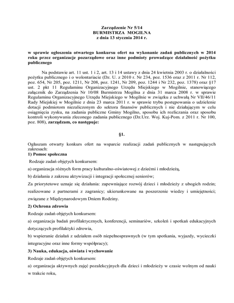 Zarządzenie Nr 5/14 BURMISTRZA MOGILNA z dnia 13 stycznia 2014 r. w sprawie ogłoszenia otwartego konkursu ofert na wykonanie zadań publicznych w 2014 roku przez organizacje pozarządowe oraz inne podmioty prowadzące działalność pożytku publicznego Na podstawie art. 11 ust. 1 i 2, art. 13 i 14 ustawy z dnia 24 kwietnia 2003 r. o działalności pożytku publicznego i o wolontariacie (Dz. U. z 2010 r. Nr 234, poz. 1536 oraz z 2011 r. Nr 112, poz. 654, Nr 205, poz. 1211, Nr 208, poz. 1241, Nr 209, poz. 1244 i Nr 232, poz. 1378) oraz §17 ust. 2 pkt 11 Regulaminu Organizacyjnego Urzędu Miejskiego w Mogilnie, stanowiącego załącznik do Zarządzenia Nr 10/08 Burmistrza Mogilna z dnia 31 marca 2008 r. w sprawie Regulaminu Organizacyjnego Urzędu Miejskiego w Mogilnie w związku z uchwałą Nr VII/46/11 Rady Miejskiej w Mogilnie z dnia 23 marca 2011 r. w sprawie trybu postępowania o udzielenie dotacji podmiotom niezaliczonym do sektora finansów publicznych i nie działającym w celu osiągnięcia zysku, na zadania publiczne Gminy Mogilno, sposobu ich rozliczania oraz sposobu kontroli wykonywania zleconego zadania publicznego (Dz.Urz. Woj. Kuj-Pom. z 2011 r. Nr 100, poz. 808), zarządzam, co następuje: §1. Ogłaszam otwarty konkurs ofert na wsparcie realizacji zadań publicznych w następujących zakresach: 1) Pomoc społeczna Rodzaje zadań objętych konkursem: a) organizacja różnych form pracy kulturalno-oświatowej z dziećmi i młodzieżą, b) działania z zakresu aktywizacji i integracji społecznej seniorów; Za priorytetowe uznaje się działania: zapewniające rozwój dzieci i młodzieży z ubogich rodzin; realizowane z partnerami z zagranicy; ukierunkowane na poszerzenie wiedzy i umiejętności; związane z Międzynarodowym Dniem Rodziny. 2) Ochrona zdrowia Rodzaje zadań objętych konkursem: a) organizacja badań profilaktycznych, konferencji, seminariów, szkoleń i spotkań edukacyjnych dotyczących profilaktyki zdrowia, b) wspieranie działań z udziałem osób niepełnosprawnych (w tym spotkania, wyjazdy, wycieczki integracyjne oraz inne formy współpracy); 3) Nauka, edukacja, oświata i wychowanie Rodzaje zadań objętych konkursem: a) organizacja aktywnych zajęć pozalekcyjnych dla dzieci i młodzieży w czasie wolnym od nauki w trakcie roku, b) organizacja konferencji, konkursów i innych form edukacji dla mieszkańców gminy Mogilno; Za priorytetowe uznaje się projekty dotyczące ważnych rocznic i wydarzeń związanych z historią Polski w tym Mogilna (np. 75.rocznicy obrony Mogilna), a także zadania przybliżające postaci związane z Mogilnem lub ziemią mogileńską. 4) Kultura, sztuka, ochrona dóbr kultury i dziedzictwa narodowego Rodzaje zadań objętych konkursem: a) upowszechnianie i rozwój kultury, sztuki, ochrony dóbr kultury i dziedzictwa narodowego, b) wspieranie przeglądów i działalności zespołów ludowych i regionalnych, c) promocja Mogilna w miastach partnerskich; Za priorytetowe uznaje się projekty: dotyczące obchodów rocznic związanych z osobami zasłużonymi dla kultury, sztuki, piśmiennictwa; promujące cykliczne wydarzenia o charakterze gminnym; promujące kulturę oraz miejsca gminy Mogilno za granicą; związane z Międzynarodowym Dniem Książki; interdyscyplinarne łączące różne dziedziny kultury, a także niekomercyjne wydawnictwa, opracowania, pocztówki i publikacje. 5) Wspieranie i upowszechnianie kultury fizycznej i sportu Rodzaje zadań objętych konkursem: a) organizacja zawodów, zajęć, turniejów i zgrupowań sportowych popularyzujących aktywność ruchową i rozwój kultury fizycznej, b) niekomercyjne imprezy sportowe o zasięgu ogólnopolskim, c) zawody i turnieje upamiętniające sportowców działających na terenie gminy Mogilno; Za priorytetowe uznaje się projekty, które kierowane są w szczególności do dzieci i młodzieży oraz promujące sportowy styl życia. 6) Turystyka i krajoznawstwo Rodzaje zadań objętych konkursem: a) organizacja konkursów wiedzy i artystycznych, b) wspieranie organizacji wyjazdów dla dzieci i młodzieży w czasie wakacji letnich; Za priorytetowe uznaje się projekty obejmujące organizację rajdów, wycieczek rowerowych, konkursów krajoznawczych, a także niekomercyjne publikacje i widokówki z ciekawymi miejscami w gminie Mogilno. 7) Działalność na rzecz organizacji pozarządowych Rodzaje zadań objętych konkursem: a) wspieranie szkoleń, konferencji i spotkań integracyjnych z pozarządowych, b) organizacja IV Forum Organizacji Pozarządowych Ziemi Mogileńskiej. udziałem organizacji §2. 1. Na realizację zadań, o których mowa w §1 planuje się przeznaczyć kwotę do wysokości: 20.800 zł w tym: a) zakres nr 2 do wysokości 800 zł, b) zakres nr 5 do wysokości 8.000 zł, c) zakresy nr 1,3,4,6 i 7 do wysokości 12.000 zł. 2. Kwota ta może ulec zmianie w szczególności w przypadku stwierdzenia, że zadanie można zrealizować mniejszym kosztem, gdy złożone oferty nie uzyskają akceptacji Burmistrza Mogilna lub zaistnieje konieczność zmniejszenia budżetu gminy Mogilno w części przeznaczonej na realizację zadania z przyczyn trudnych do przewidzenia w dniu ogłaszania konkursu. 3. Na realizację zadań publicznych z zakresu objętego konkursem z budżetu gminy w roku 2013 przeznaczono kwotę w wysokości 37.000 zł. §3. 1. Zlecenie zadania i udzielenie dotacji nastąpi z zastosowaniem przepisów ustawy z dnia 24 kwietnia 2003 r. o działalności pożytku publicznego i o wolontariacie (Dz. U. z 2010 r. Nr 234, poz. 1536 z poźn. zm.) oraz zasad określonych w uchwale Nr VII/46/11 Rady Miejskiej w Mogilnie z dnia 23 marca 2011 r. w sprawie trybu postępowania o udzielenie dotacji podmiotom niezaliczonym do sektora finansów publicznych i nie działającym w celu osiągnięcia zysku, na zadania publiczne Gminy Mogilno, sposobu ich rozliczania oraz sposobu kontroli wykonywania zleconego zadania publicznego (Dz.Urz. Woj. Kuj-Pom. z 2011 r. Nr 100, poz.