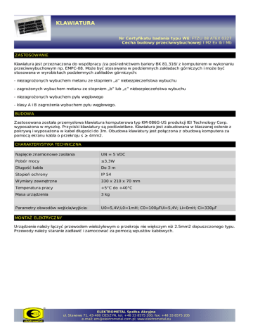KLAWIATURA Nr Certyfikatu badania typu WE: FTZU 08 ATEX 0327 Cecha budowy przeciwwybuchowej: I M2 Ex ib I Mb ZASTOSOWANIE Klawiatura jest przeznaczona do współpracy /za pośrednictwem bariery BK 81.316/ z komputerem w wykonaniu przeciwwybuchowym np. EMPC-08. Może być stosowana w podziemnych zakładach górniczych i może być stosowana w wyrobiskach podziemnych zakładów górniczych: - niezagrożonych wybuchem metanu ze stopniem „a” niebezpieczeństwa wybuchu - zagrożonych wybuchem metanu ze stopniem „b” lub „c” niebezpieczeństwa wybuchu - niezagrożonych wybuchem pyłu węglowego - klasy A i B zagrożenia wybuchem pyłu węglowego. BUDOWA Zastosowana została przemysłowa klawiatura komputerowa typ KM-086G-US produkcji IEI Technology Corp. wyposażona w myszkę. Przyciski klawiatury są podświetlane. Klawiatura jest zabudowana w blaszanej osłonie z pokrywą i wyposażona w kabel długości do 3m. Obudowa klawiatury jest połączona z obudową komputera za pomocą ekranu kabla o przekroju s ≥ 4mm2. CHARAKTERYSTYKA TECHNICZNA Napięcie znamionowe zasilania UN = 5 VDC Pobór mocy ≤3,3W Długość kabla Do 3 m Stopień ochrony IP 54 Wymiary zewnętrzne 330 x 210 x 70 mm Temperatura pracy +5°C do +40°C Masa urządzenia 3 kg Parametry obwodów wejścia/wyjścia: U0=5,4V;L0=1mH; C0=100μFUi=5,4V; Li=0mH; Ci=330μF MONTAŻ ELEKTRYCZNY Urządzenie należy łączyć przewodem wielożyłowym o przekroju nie większym niż 2.5mm2 dopuszczonego typu. Przewody należy staranie zadławić i zamocować za pomocą wpustów kablowych. ELEKTROMETAL Spółka Akcyjna ul. Stawowa 71, 43-400 CIESZYN, tel. +48 33 8575 200; fax: +48 33 8575 205 e-mail: [email protected]; www.elektrometal.eu
