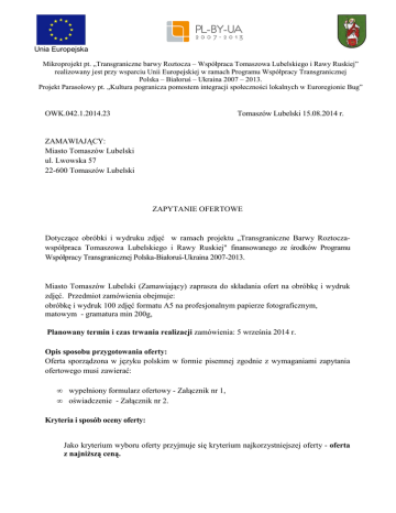 Unia Europejska Mikroprojekt pt. „Transgraniczne barwy Roztocza – Współpraca Tomaszowa Lubelskiego i Rawy Ruskiej” realizowany jest przy wsparciu Unii Europejskiej w ramach Programu Współpracy Transgranicznej Polska – Białoruś – Ukraina 2007 – 2013. Projekt Parasolowy pt. „Kultura pogranicza pomostem integracji społeczności lokalnych w Euroregionie Bug” OWK.042.1.2014.23 Tomaszów Lubelski 15.08.2014 r. ZAMAWIAJĄCY: Miasto Tomaszów Lubelski ul. Lwowska 57 22-600 Tomaszów Lubelski ZAPYTANIE OFERTOWE Dotyczące obróbki i wydruku zdjęć w ramach projektu „Transgraniczne Barwy Roztoczawspółpraca Tomaszowa Lubelskiego i Rawy Ruskiej" finansowanego ze środków Programu Współpracy Transgranicznej Polska-Białoruś-Ukraina 2007-2013. Miasto Tomaszów Lubelski (Zamawiający) zaprasza do składania ofert na obróbkę i wydruk zdjęć. Przedmiot zamówienia obejmuje: obróbkę i wydruk 100 zdjęć formatu A5 na profesjonalnym papierze fotograficznym, matowym - gramatura min 200g, Planowany termin i czas trwania realizacji zamówienia: 5 września 2014 r. Opis sposobu przygotowania oferty: Oferta sporządzona w języku polskim w formie pisemnej zgodnie z wymaganiami zapytania ofertowego musi zawierać: • • wypełniony formularz ofertowy - Załącznik nr 1, oświadczenie - Załącznik nr 2. Kryteria i sposób oceny oferty: Jako kryterium wyboru oferty przyjmuje się kryterium najkorzystniejszej oferty - oferta z najniższą ceną. Miejsce i termin składania ofert: Oferty należy składać osobiście lub pocztą w siedzibie zamawiającego przy ul. Lwowskiej 57, 22600 Tomaszów Lubelski lub na adres mailowy [email protected] do dnia 03.09.2014r. Załącznik Nr 1 FORMULARZ OFERTOWY Dane dotyczące Oferenta Nazwa/ Imię Nazwisko ............................................................................................................................ Siedziba/ Adres ........................................................................................................................................ nr telefonu/faksu ........................................................................................................................................ NIP ............................................................................................................................................................ REGON/PESEL ....................................................................................................................................... Dane dotyczące Zamawiającego: Miasto Tomaszów Lubelski, ul. Lwowska 57, 22-600 Tomaszów Lubelski, tel. 84 664 3740 faks: 84 664 22 43, adres e-mail: [email protected] Zobowiązania oferenta: W odpowiedzi na zapytanie ofertowe na wybór wykonawcy obróbki i wydruku zdjęć w ramach projektu „Transgraniczne Barwy Roztocza- współpraca Tomaszowa Lubelskiego i Rawy Ruskiej" współfinansowanego ze środków Programu Współpracy Transgranicznej Polska-Białoruś-Ukraina 2007-2013 oferuję kwotę w wysokości: cena brutto ………………………euro (słownie: ......................................................................................................................................... ) za realizację działań będących przedmiotem niniejszego zapytania ofertowego. Oświadczam, że: a) Wykonam zamówienie w wyznaczonym terminie. b) Dysponuję niezbędną wiedzą i doświadczeniem oraz osobami zdolnymi do wykonania zamówienia; c) Znajduję się w sytuacji ekonomicznej i finansowej umożliwiającej realizację zamówienia; d) W cenie proponowanej oferty uwzględnione zostały wszystkie koszty wykonania zamówienia. e) Wszystkie dane zawarte w ofercie są zgodne z prawdą. …………………………………………. Data ……………………………………………… Podpisy osób uprawnionych do reprezentowania Oferenta Załącznik Nr 2 OŚWIADCZENIE Oświadczam, że oferent: Nazwa/ Imię Nazwisko ............................................................................................................................................ Siedziba/ Adres ........................................................................................................................................................ nr telefonu/faksu....................................................................................................................................................... NIP ........................................................................................................................................................................... REGON/PESEL ....................................................................................................................................................... • • • • • • Nie znajduje się w stanie upadłości lub likwidacji, jego działalność nie podlega nadzorowi sądowemu, nie zawarł ugody z wierzycielami, nie zawiesił działalności, nie toczy się wobec niego postępowanie w wyżej wymienionych sprawach lub nie znajduje się w podobnej sytuacji wynikającej z podobnych procedur z godnie z przepisami i uregulowaniami krajowymi; Nie został skazany za przestępstwo związane z prowadzeniem działalności prawomocną decyzją właściwej instancji (od decyzji której nie ma odwołania); Nie został uznany winnym poważnego naruszenia zasad prowadzenia działalności; Wypełnił swoje zobowiązania związane z opłatą składek na ubezpieczenie społeczne lub podatki zgodnie z przepisami państwa, gdzie ma być realizowany kontrakt; Nie została wobec niego wydana prawomocna decyzja w sprawie oszustwa, korupcji, udziału w organizacji przestępczej lub innej działalności niezgodnej z prawem na szkodę interesom finansowym Wspólnoty; Nie podlega obecnie karze administracyjnej. ……………………………….…… Data ………………………………………… Podpis Oferenta