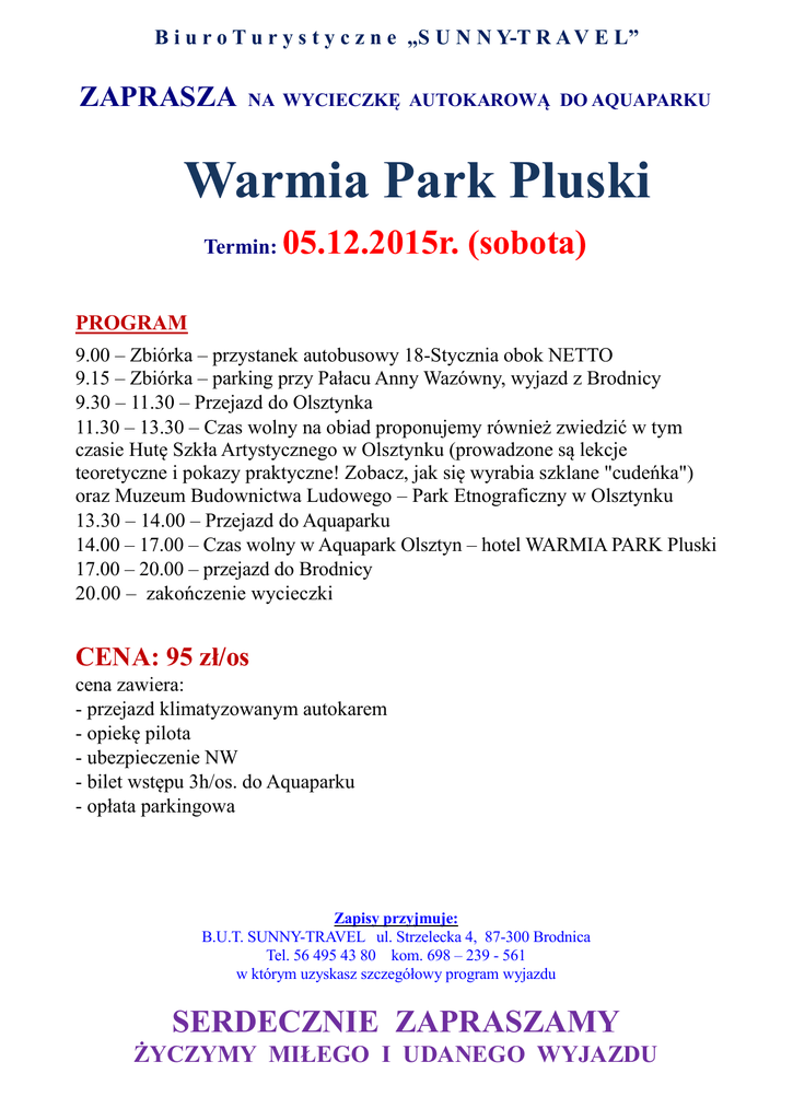 B i u r o T u r y s t y c z n e „S U N N Y-T R A V E L” ZAPRASZA NA WYCIECZKĘ AUTOKAROWĄ DO AQUAPARKU Warmia Park Pluski Termin: 05.12.2015r. (sobota) PROGRAM 9.00 – Zbiórka – przystanek autobusowy 18-Stycznia obok NETTO 9.15 – Zbiórka – parking przy Pałacu Anny Wazówny, wyjazd z Brodnicy 9.30 – 11.30 – Przejazd do Olsztynka 11.30 – 13.30 – Czas wolny na obiad proponujemy również zwiedzić w tym czasie Hutę Szkła Artystycznego w Olsztynku (prowadzone są lekcje teoretyczne i pokazy praktyczne! Zobacz, jak się wyrabia szklane "cudeńka") oraz Muzeum Budownictwa Ludowego – Park Etnograficzny w Olsztynku 13.30 – 14.00 – Przejazd do Aquaparku 14.00 – 17.00 – Czas wolny w Aquapark Olsztyn – hotel WARMIA PARK Pluski 17.00 – 20.00 – przejazd do Brodnicy 20.00 – zakończenie wycieczki CENA: 95 zł/os cena zawiera: - przejazd klimatyzowanym autokarem - opiekę pilota - ubezpieczenie NW - bilet wstępu 3h/os. do Aquaparku - opłata parkingowa Zapisy przyjmuje: B.U.T. SUNNY-TRAVEL ul. Strzelecka 4, 87-300 Brodnica Tel. 56 495 43 80 kom. 698 – 239 - 561 w którym uzyskasz szczegółowy program wyjazdu SERDECZNIE ZAPRASZAMY ŻYCZYMY MIŁEGO I UDANEGO WYJAZDU