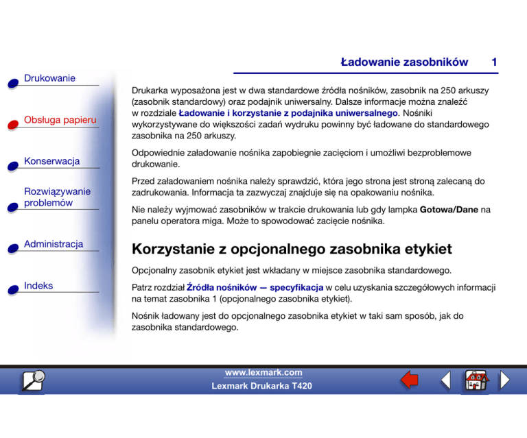 Ładowanie zasobników 1 Drukowanie Obsługa papieru Konserwacja Rozwiązywanie problemów Administracja Drukarka wyposażona jest w dwa standardowe źródła nośników, zasobnik na 250 arkuszy (zasobnik standardowy) oraz podajnik uniwersalny. Dalsze informacje można znaleźć w rozdziale Ładowanie i korzystanie z podajnika uniwersalnego. Nośniki wykorzystywane do większości zadań wydruku powinny być ładowane do standardowego zasobnika na 250 arkuszy. Odpowiednie załadowanie nośnika zapobiegnie zacięciom i umożliwi bezproblemowe drukowanie. Przed załadowaniem nośnika należy sprawdzić, która jego strona jest stroną zalecaną do zadrukowania. Informacja ta zazwyczaj znajduje się na opakowaniu nośnika. Nie należy wyjmować zasobników w trakcie drukowania lub gdy lampka Gotowa/Dane na panelu operatora miga. Może to spowodować zacięcie nośnika. Korzystanie z opcjonalnego zasobnika etykiet Opcjonalny zasobnik etykiet jest wkładany w miejsce zasobnika standardowego. Indeks Patrz rozdział Źródła nośników — specyfikacja w celu uzyskania szczegółowych informacji na temat zasobnika 1 (opcjonalnego zasobnika etykiet). Nośnik ładowany jest do opcjonalnego zasobnika etykiet w taki sam sposób, jak do zasobnika standardowego. www.lexmark.com Lexmark Drukarka T420 Ładowanie zasobników 2 Drukowanie Obsługa papieru Konserwacja Rozwiązywanie problemów Administracja Indeks Ładowanie nośnika do zasobnika standardowego, opcjonalnego zasobnika na 250 arkuszy lub opcjonalnego zasobnika etykiet Poniższe instrukcje dotyczą ładowania nośnika do zasobnika standardowego, opcjonalnego zasobnika etykiet lub opcjonalnego zasobnika na 250 arkuszy. Drukarka jest wyposażona w jeden standardowy zasobnik na 250 arkuszy. Opcjonalny zasobnik etykiet montowany jest w miejsce zasobnika standardowego. Jako źródło nośnika wydruku można wykorzystywać opcjonalne zasobniki na 250 lub na 500 arkuszy, jednak naraz można użyć tylko jednego z nich. Informacje dotyczące montażu zawarte są w broszurze Podręcznik instalacji. Informacje dotyczące rozmiarów oraz rodzajów nośników obsługiwanych przez te zasobniki znajdują się w rozdziale Źródła nośników — specyfikacja. Instrukcje dotyczące ładowania nośnika do opcjonalnego zasobnika na 500 arkuszy znajdują się w rozdziale Ładowanie do opcjonalnego zasobnika na 500 arkuszy. www.lexmark.com Lexmark Drukarka T420 Ładowanie zasobników Drukowanie Aby załadować nośnik wydruku do zasobnika: 1 Wysuń zasobnik. Wyjmij go zupełnie. Obsługa papieru Konserwacja Rozwiązywanie problemów Administracja Indeks www.lexmark.com Lexmark Drukarka T420 3 Ładowanie zasobników Drukowanie 2 Naciśnij metalową płytę, aż zablokuje się na swoim miejscu. Obsługa papieru Konserwacja Rozwiązywanie problemów Administracja Indeks www.lexmark.com Lexmark Drukarka T420 4 Ładowanie zasobników Drukowanie 3 Znajdź występy na obu prowadnicach. Obsługa papieru Konserwacja Rozwiązywanie problemów Administracja Występ Występ Indeks www.lexmark.com Lexmark Drukarka T420 5 Ładowanie zasobników 6 Drukowanie 4 Dociśnij występ prowadnicy długości do prowadnicy i przesuń ją do tyłu zasobnika. 5 Ściśnij występ prowadnicy szerokości i prowadnicę, a następnie przesuń prowadnicę Obsługa papieru Konserwacja maksymalnie w prawo. Prowadnica długości Rozwiązywanie problemów Administracja Indeks Prowadnica szerokości www.lexmark.com Lexmark Drukarka T420 Ładowanie zasobników 7 Drukowanie 6 Zegnij arkusze w jedną i w drugą stronę, aby je rozdzielić, a następnie przekartkuj Obsługa papieru stos. Papieru nie należy składać ani gnieść. Wyrównaj krawędzie arkuszy na płaskiej powierzchni. Konserwacja Rozwiązywanie problemów Administracja Indeks Trzymaj nośnik tak, aby strona przeznaczona do zadrukowania skierowana była do dołu, a przednia krawędź stosu w stronę przodu zasobnika. Informacje dotyczące ładowania papieru firmowego zawarte są w rozdziale Drukowanie na papierze firmowym. www.lexmark.com Lexmark Drukarka T420 Ładowanie zasobników 8 Drukowanie 7 Oprzyj stos nośnika o lewą ścianę zasobnika i wsuń arkusze pod metalowy ogranicznik. Obsługa papieru Konserwacja Rozwiązywanie problemów Upewnij się, czy nośnik łatwo wsuwa się pod metalowy ogranicznik i czy nie jest pogięty ani pomarszczony. Nie unoś metalowego ogranicznika ani nie wpychaj pod niego arkuszy na siłę. Uwaga: Nie przekraczaj maksymalnej wysokości stosu oznaczonej wskaźnikiem. Umieszczenie w zasobniku zbyt dużej liczby arkuszy może spowodować zacięcie papieru. Metalowy ogranicznik Wskaźnik maksymalnej wysokości stosu Administracja Indeks www.lexmark.com Lexmark Drukarka T420 Ładowanie zasobników 9 Drukowanie 8 Ściśnij występ prowadnicy szerokości i prowadnicę, a następnie dosuń prowadnicę do krawędzi nośnika. Obsługa papieru Konserwacja Rozwiązywanie problemów Administracja Indeks www.lexmark.com Lexmark Drukarka T420 Ładowanie zasobników 10 Drukowanie 9 Ściśnij występ prowadnicy długości i prowadnicę, a następnie dosuń prowadnicę do krawędzi nośnika. Obsługa papieru Konserwacja Rozwiązywanie problemów Administracja Indeks Uwaga: Zbyt mocne dociśnięcie prowadnic do nośnika może spowodować jego nieprawidłowe podawanie. www.lexmark.com Lexmark Drukarka T420 Ładowanie zasobników Drukowanie 10 Wsuń zasobnik. Obsługa papieru Konserwacja Rozwiązywanie problemów Administracja Indeks www.lexmark.com Lexmark Drukarka T420 11 Ładowanie zasobników 12 Drukowanie Obsługa papieru Ładowanie do opcjonalnego zasobnika na 500 arkuszy Opcjonalny zasobnik na 500 arkuszy przeznaczony jest tylko do papieru. Z tyłu zasobnika znajduje się specjalna pokrywa osłaniająca papier rozmiaru Legal. Osłona ta zabezpiecza papier rozmiaru Legal przed kurzem. Konserwacja Rozwiązywanie problemów Aby załadować papier do zasobnika: 1 Wysuń zasobnik. Wyjmij go zupełnie. Administracja In