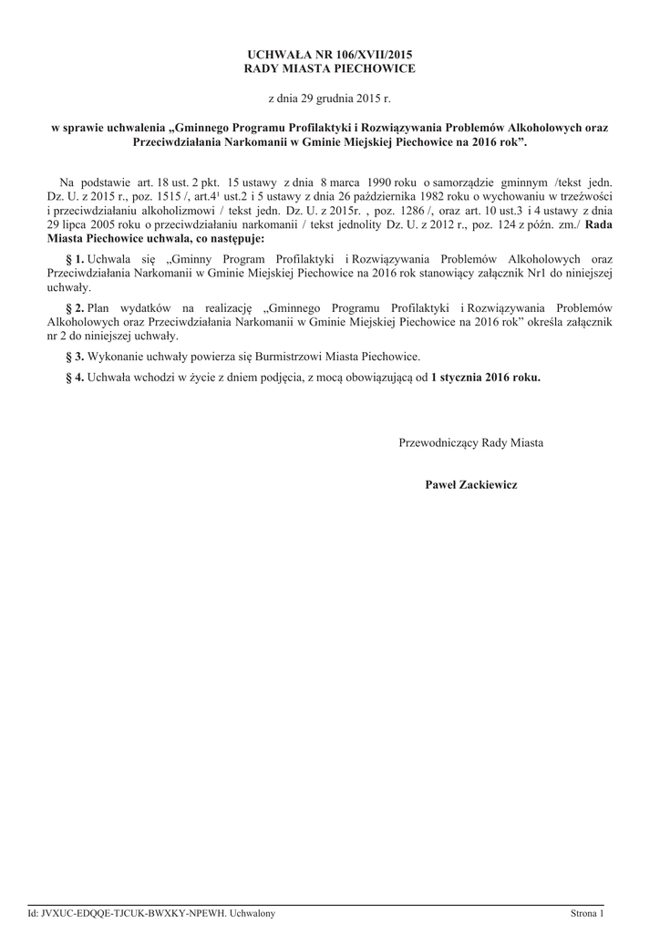 UCHWAŁA NR 106/XVII/2015 RADY MIASTA PIECHOWICE z dnia 29 grudnia 2015 r. w sprawie uchwalenia „Gminnego Programu Profilaktyki i Rozwiązywania Problemów Alkoholowych oraz Przeciwdziałania Narkomanii w Gminie Miejskiej Piechowice na 2016 rok”. Na podstawie art. 18 ust. 2 pkt. 15 ustawy z dnia 8 marca 1990 roku o samorządzie gminnym /tekst jedn. Dz. U. z 2015 r., poz. 1515 /, art.4¹ ust.2 i 5 ustawy z dnia 26 października 1982 roku o wychowaniu w trzeźwości i przeciwdziałaniu alkoholizmowi / tekst jedn. Dz. U. z 2015r. , poz. 1286 /, oraz art. 10 ust.3 i 4 ustawy z dnia 29 lipca 2005 roku o przeciwdziałaniu narkomanii / tekst jednolity Dz. U. z 2012 r., poz. 124 z późn. zm./ Rada Miasta Piechowice uchwala, co następuje: § 1. Uchwala się „Gminny Program Profilaktyki i Rozwiązywania Problemów Alkoholowych oraz Przeciwdziałania Narkomanii w Gminie Miejskiej Piechowice na 2016 rok stanowiący załącznik Nr1 do niniejszej uchwały. § 2. Plan wydatków na realizację „Gminnego Programu Profilaktyki i Rozwiązywania Problemów Alkoholowych oraz Przeciwdziałania Narkomanii w Gminie Miejskiej Piechowice na 2016 rok” określa załącznik nr 2 do niniejszej uchwały. § 3. Wykonanie uchwały powierza się Burmistrzowi Miasta Piechowice. § 4. Uchwała wchodzi w życie z dniem podjęcia, z mocą obowiązującą od 1 stycznia 2016 roku. Przewodniczący Rady Miasta Paweł Zackiewicz Id: JVXUC-EDQQE-TJCUK-BWXKY-NPEWH. Uchwalony Strona 1 Uzasadnienie Art. 1 ust. 1 ustawy z dnia 26 października 1982 roku o wychowaniu w trzeźwości i przeciwdziałaniu alkoholizmowi (Dz. U. z 2015 r. poz. 1286) stanowi, że: "Organy administracji rządowej i jednostek samorządu terytorialnego są obowiązane do podejmowania działań zmierzających do ograniczania spożycia napojów alkoholowych oraz zmiany struktury ich spożywania, inicjowania i wspierania przedsięwzięć mających na celu zmianę obyczajów w zakresie organizacji społecznych i zakładów pracy". Powyższy zapis doprecyzowany jest w art. 41 ust. 1 ustawy, w którym wyszczególniono zadania, jakie powinna realizować gmina w ramach gminnego programu profilaktyki i rozwiązywania problemów alkoholowych. Do zadań tych należą: 1) zwiększanie dostępności pomocy terapeutycznej i rehabilitacyjnej dla osób uzależnionych od alkoholu; 2) udzielanie rodzinom, w których występują problemy alkoholowe, pomocy psychospołecznej i prawnej, a w szczególności ochrony przed przemocą w rodzinie; 3) prowadzenie profilaktycznej działalności informacyjnej i edukacyjnej w zakresie rozwiązywania problemów alkoholowych i przeciwdziałania narkomanii, w szczególności dla dzieci i młodzieży, w tym prowadzenie pozalekcyjnych zajęć sportowych, a także działań na rzecz dożywiania dzieci uczestniczących w pozalekcyjnych programach opiekuńczo-wychowawczych i socjoterapeutycznych; 4) wspomaganie działalności instytucji, stowarzyszeń i osób fizycznych, służącej rozwiązywaniu problemów alkoholowych; 5) podejmowanie interwencji w związku z naruszeniem przepisów określonych w art. 131 i art. 15 ustawy oraz występowanie przed sądem w charakterze oskarżyciela publicznego; 6) wspieranie zatrudnienia socjalnego poprzez organizowanie i finansowanie centrów integracji społecznej. Z kolei art. 41 ust. 2 ustawy z dnia 26 października 1982 roku o wychowaniu w trzeźwości (Dz. U. z 2015 r., poz. 1286) nakłada na radę gminy obowiązek uchwalania corocznie gminnego programu profilaktyki i rozwiązywania problemów alkoholowych. Gminny Program Profilaktyki i Rozwiązywania Problemów Alkoholowych w Piechowicach na 2016 rok został opracowany zgodnie z ww. obligatoryjnymi zadaniami oraz potrzebami występującymi na terenie miasta Z art. 18 ust. 2 pkt 15 ustawy z dnia 8 marca 1990 r. o samorządzie gminnym (Dz. U. z 2015 r., poz. 1515) wynika, że do wyłącznej właściwości rady gminy należy podejmowanie uchwał w sprawach zastrzeżonych ustawami do kompetencji rady gminy. W świetle powyższego podjęcie uchwały w sprawie uchwalenia Gminnego Programu Profilaktyki i Rozwiązywania Problemów Alkoholowych w Piechowicach na 2016 rok jest zasadne. Id: JVXUC-EDQQE-TJCUK-BWXKY-NPEWH. Uchwalony Strona 1 !"# Zał cznik nr 1 do Uchwały Nr 106/XVII/2015 Rady Miasta Piechowice z dnia 29 grudnia 2015 roku w sprawie uchwalenia „Gminnego programu profilaktyki i rozwi zywania problemów alkoholowych oraz przeciwdziałania narkomanii w Gminie Miejskiej Piechowice na 2016 rok”. GMINNY PROGRAM PROFILAKTYKI I ROZWI ZYWANIA PROBLEMÓW ALKOHOLOWYCH ORAZ PRZECIWDZIAŁANIA NARKOMANII W GMINIE MIEJSKIEJ PIECHOWICE NA 2016 ROK Id: JVXUC-EDQQE-TJCUK-BWXKY-NPEWH. Uchwalony Strona 1 !"# WST P „Gminny Program Profilaktyki i Rozwi zywania Problemów Alkoholowych oraz Przeciwdziałania Narkomanii w Gminie Miejskiej Piechowice na 2016 rok” jest podstawowym dokumentem okre laj cym zakres i form realizacji działa na terenie Gminy Miejskiej Piechowice. Ma na celu stworzenie spójnego systemu działa profilaktycznych i naprawczych, zmierzaj cych do zapobiegania powstawaniu nowych problemów oraz zmniejszeniu tych, które aktualnie wyst puj . Program charakteryzuje si wielopłaszczyznowym podej ciem do kwestii przeciwdziałania i rozwi zywania problemów alkoholowych, a kierunki działa w nim okre lone stanowi rozwini cie i kontynuacj działa podejmowanych w latach poprzednich, zgodnych z: 1. Ustaw z dnia 26 pa dziernika 1982 r. o wychowaniu w trze wo ci i przeciwdziałaniu alkoholizmowi (Dz. U. z 2015 r. poz. 1286 ); 2. Narodowym Programem Profilaktyki i Rozwi zywania Problemów Alkoholowych na lata 2011-2015; 3. Ustaw z dnia 29 lipca 2005 r. o przeciwdziałaniu narkomanii (Dz. U. z 2012 r. poz. 124 z pó . zmianami ); 4. Ustaw z dnia 29 lipca 2005 r. o przeciwdziałaniu przemocy w rodzinie (Dz. U. 2015 r. Nr, poz. 1390 ); 5. Diagnoz Lokalnych Zagro e Społecznych Piechowice 2011; 6. Strategi Rozwi zywania Problemów Społecznych w Gminie 