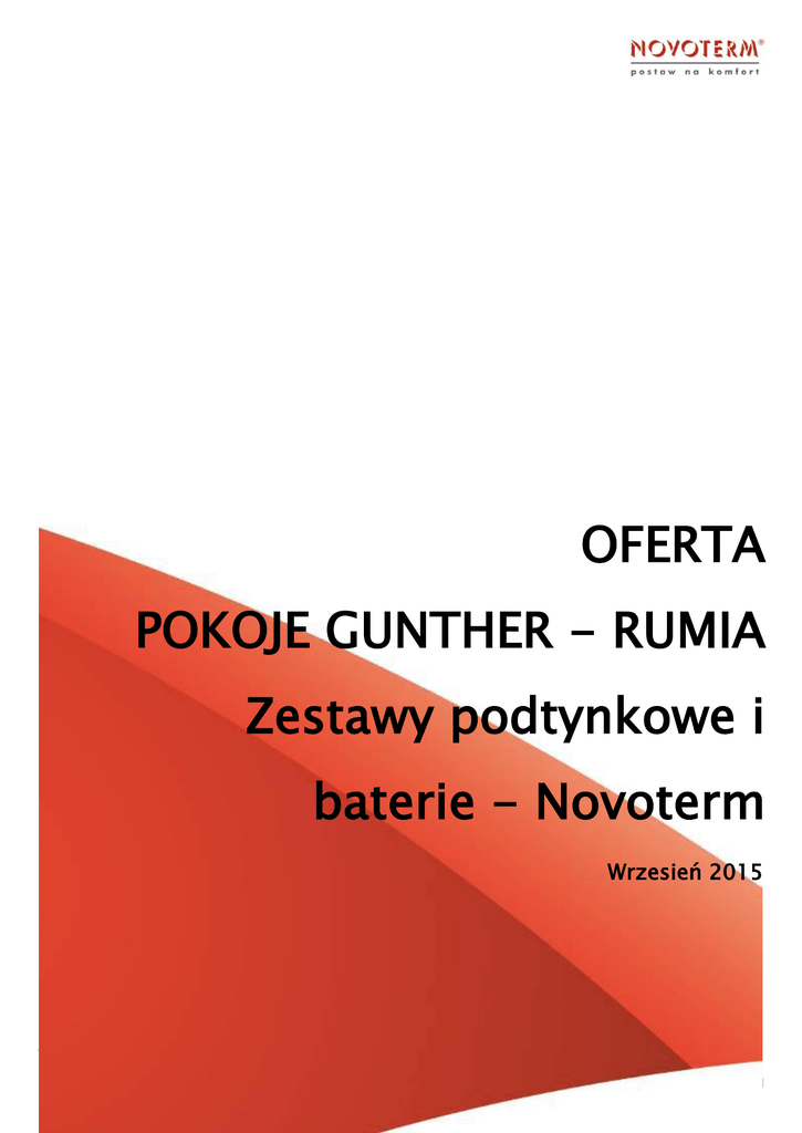 OFERTA POKOJE GUNTHER - RUMIA Zestawy podtynkowe i baterie - Novoterm Wrzesień 2015 Zestawy podtynkowe Kerra Zestaw podtynkowy do zabudowy lekkiej Summer Rama: z możliwością regulacji wysokości, montaż tradycyjny lub narożny Zbiornik: jednoczęściowy, izolowany, pojemność 6/3l Przycisk: chrom Miska: ceramiczna z deską wolnoopadającą W komplecie: akcesoria przyłączeniowe, podkładka wyciszająca Model 1 Summer Opis CZ netto 309,00 Zestaw podtynkowy Summer 2 Zestawy podtynkowe Kerra Zestaw podtynkowy do zabudowy lekkiej Spring Rama: z możliwością regulacji wysokości, montaż tradycyjny lub narożny Zbiornik: jednoczęściowy, izolowany, pojemność 6/3l Przycisk: chrom Miska: ceramiczna z deską wolnoopadającą W komplecie: akcesoria przyłączeniowe, podkładka wyciszająca Model 1 Spring Opis CZ netto 309,00 Zestaw podtynkowy Spring 3 Baterie sanitarne Loge Baterie Bateria umywalkowa Dionizos DO01 Wykończenie: chrom Typ: umywalkowa wysoka Materiał: mosiądz Głowica: ceramiczna 40mm Bateria umywalkowa Ares AE01 Wykończenie: chrom Typ: umywalkowa Materiał: mosiądz Głowica: ceramiczna 35 mm Model Opis CZ netto 1 Dionizos DO01 Bateria umywalkowa 45,89 2 Ares AE01 Bateria umywalkowa 97,14 Zdjęcia produktów mają charakter poglądowy. 4