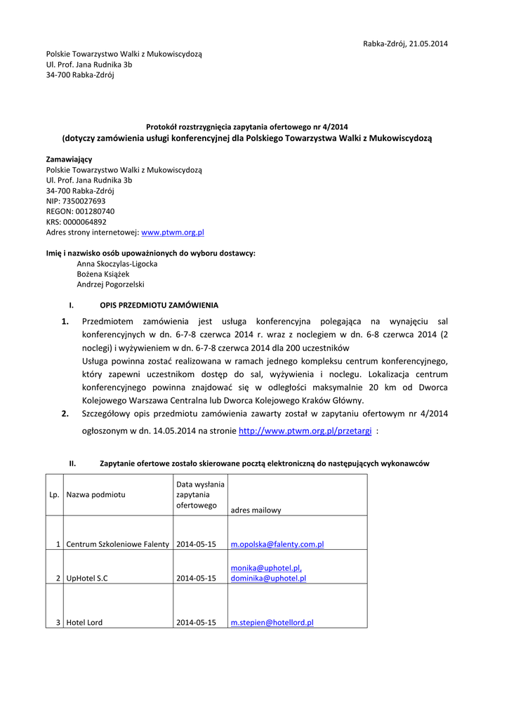 Rabka-Zdrój, 21.05.2014 Polskie Towarzystwo Walki z Mukowiscydozą Ul. Prof. Jana Rudnika 3b 34-700 Rabka-Zdrój Protokół rozstrzygnięcia zapytania ofertowego nr 4/2014 (dotyczy zamówienia usługi konferencyjnej dla Polskiego Towarzystwa Walki z Mukowiscydozą Zamawiający Polskie Towarzystwo Walki z Mukowiscydozą Ul. Prof. Jana Rudnika 3b 34-700 Rabka-Zdrój NIP: 7350027693 REGON: 001280740 KRS: 0000064892 Adres strony internetowej: www.ptwm.org.pl Imię i nazwisko osób upoważnionych do wyboru dostawcy: Anna Skoczylas-Ligocka Bożena Książek Andrzej Pogorzelski I. 1. OPIS PRZEDMIOTU ZAMÓWIENIA Przedmiotem zamówienia jest usługa konferencyjna polegająca na wynajęciu sal konferencyjnych w dn. 6-7-8 czerwca 2014 r. wraz z noclegiem w dn. 6-8 czerwca 2014 (2 noclegi) i wyżywieniem w dn. 6-7-8 czerwca 2014 dla 200 uczestników Usługa powinna zostać realizowana w ramach jednego kompleksu centrum konferencyjnego, który zapewni uczestnikom dostęp do sal, wyżywienia i noclegu. Lokalizacja centrum konferencyjnego powinna znajdować się w odległości maksymalnie 20 km od Dworca Kolejowego Warszawa Centralna lub Dworca Kolejowego Kraków Główny. Szczegółowy opis przedmiotu zamówienia zawarty został w zapytaniu ofertowym nr 4/2014 2. ogłoszonym w dn. 14.05.2014 na stronie http://www.ptwm.org.pl/przetargi : II. Zapytanie ofertowe zostało skierowane pocztą elektroniczną do następujących wykonawców Lp. Nazwa podmiotu Data wysłania zapytania ofertowego adres mailowy 1 Centrum Szkoleniowe Falenty 2014-05-15 [email protected] 2 UpHotel S.C 2014-05-15 [email protected], [email protected] 3 Hotel Lord 2014-05-15 [email protected] Warsaw Plaza Hotel 2014-05-15 [email protected], [email protected] Development People 2014-05-15 [email protected] III. oferty złożyły firmy Lp. Nazwa podmiotu Data wpływu 1. Centrum Szkoleniowe Falenty 20.05.2014 2. 5Points Magdalena Makowska, obiekt MCC Mazurkas Conference Centre & Hotel 20.05.2014 IV. Oferty które zostały odrzucone z przyczyn formalnych brak V. OCENA OFERT Lp. Nazwa podmiotu Data wpływu oferty Cena usługi netto Cena usługi brutto Odległość od Dworca Warszawa Centralna (wg. google maps) ocena ofert wg. wzoru liczba z zapytania uzyskanych ofertowego punktów 1 Centrum 20.05.2014 86910,00 Szkoleniowe Falenty 93862,80 15,9 km 1 100 2 5Points Magdalena Makowska 206615,40 16,1 km 0,51 50,75 VI. 20.05.2014 167980,00 INFORMACJE DOTYCZĄCE WYBORU NAJKORZYSTNIEJSZEJ OFERTY Za najkorzystniejszą uznano ofertę firmy: Centrum Szkoleniowe Falenty Uzasadnienie: oferta prawidłowo przygotowana pod względem formalnym i uzyskała najwyższą ocenę. Cena brutto usługi wynosi zł 93862,80 zł. Rabka-Zdrój, 21.05.2014