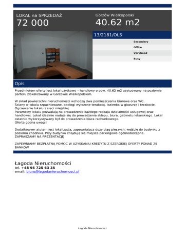 Gorzów Wielkopolski LOKAL na SPRZEDAŻ 40.62 m2 72 000 13/2181/OLS Secondary Office VeryGood Busy Opis Przedmiotem oferty jest lokal użytkowo – handlowy o pow. 40.62 m2 usytuowany na poziomie parteru zlokalizowany w Gorzowie Wielkopolskim. W skład powierzchni nieruchomości wchodzą dwa pomieszczenia biurowe oraz WC. Ściany w lokalu szpachlowane, podłogi wyłożone terakotą, łazienka w glazurze i terakocie. Ogrzewanie lokalu z sieci miejskiej. Parametry lokalu pozwalają na prowadzenie każdego rodzaju działalności usługowej oraz handlowej. Lokal idealnie nadaje się do prowadzenia sklepu, biura, gabinetu lekarskiego. Lokal ostatnio wykorzystywany był do prowadzenia biura rachunkowego. Oferta godna uwagi! Dodatkowym atutem jest lokalizacja, zapewniająca duży ciąg pieszych, wejście do budynku z poziomu chodnika. Przy budynku znajdują się miejsca parkingowe ogólnodostępne. ZAPRASZAMY NA PREZENTACJĘ ZAPEWNIAMY BEZPŁATNĄ POMOC W UZYSKANIU KREDYTU Z SZEROKIEJ OFERTY PONAD 25 BANKÓW Łagoda Nieruchomości tel. +48 95 725 63 35 email: [email protected] Łagoda Nieruchomości Powered by TCPDF (www.tcpdf.org)