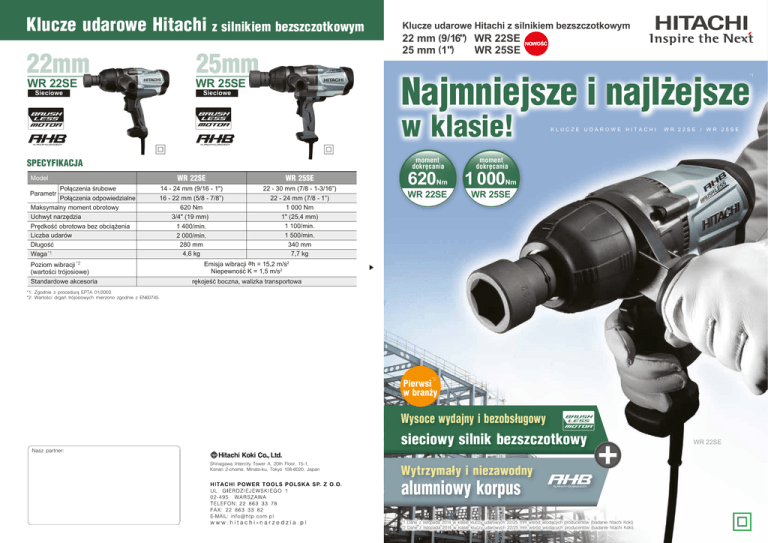 Klucze udarowe Hitachi z silnikiem bezszczotkowym 22mm 25mm WR 22SE Najmniejsze i najlżejsze *1 WR 25SE Sieciowe Klucze udarowe Hitachi z silnikiem bezszczotkowym 22 mm (9/16") WR 22SE NOWOŚĆ 25 mm (1") WR 25SE Sieciowe w klasie! moment dokręcania SPECYFIKACJA WR 22SE WR 25SE 14 - 24 mm (9/16 - 1") 16 - 22 mm (5/8 - 7/8”) 620 Nm 3/4" (19 mm) 1 400/min. 2 000/min. 280 mm 4,6 kg 22 - 30 mm (7/8 - 1-3/16”) 22 - 24 mm (7/8 - 1”) 1 000 Nm 1" (25,4 mm) 1 100/min. 1 500/min. 340 mm 7,7 kg Model Połączenia śrubowe Parametr Połączenia odpowiedzialne Maksymalny moment obrotowy Uchwyt narzędzia Prędkość obrotowa bez obciążenia Liczba udarów Długość Waga *1 Poziom wibracji *2 (wartości trójosiowe) Standardowe akcesoria 620 Nm WR 22SE KLUCZE UDAROWE HITACHI WR 22SE / WR 25SE moment dokręcania 1 000 Nm WR 25SE Emisja wibracji ah = 15,2 m/s2 Niepewność K = 1,5 m/s2 rękojeść boczna, walizka transportowa *1: Zgodnie z procedurą EPTA 01/2003. *2: Wartości drgań trójosiowych mierzono zgodnie z EN60745. *2 Pierwsi w branży Wysoce wydajny i bezobsługowy sieciowy silnik bezszczotkowy Nasz partner: Shinagawa Intercity Tower A, 20th Floor, 15-1, Konan 2-chome, Minato-ku, Tokyo 108-6020, Japan Wytrzymały i niezawodny alumniowy korpus *1 Dane z listopada 2014 w klasie kluczy udarowych 22/25 mm wśród wiodących producentów (badanie hitachi Koki). *2 Dane z listopada 2014 w klasie kluczy udarowych 22/25 mm wśród wiodących producentów (badanie hitachi Koki). WR 22SE e z s j e i n m j Na ejsze ż l j i nlaasie! Aluminiowa obudowa Konstrukcja wewnętrznej podwójnej izolacji obudowy z bardzo wytrzymałego odlewu aluminiowego oraz plastikowy korpus wewnętrzny stojana. Obudowa jest znacznie bardziej sztywna, zwiększając trwałość silnika. *1 wk ” w klasie y z s j e ż l j jszy i na odny” „Najmnie rzymały i niezaw yt *2 oraz „W siągnięte dzięki tkowego Pierwsi zalety o silnika bezszczo o t w branży aniu zastosow iowej obudowy! in oraz alum I A C H T I H E R O W A D U C Z E K L U W R E 2 2 S / Alminium Plastik Wytrzymała E 2 5 S W R Bardzo trwała Sieciowy silnik bezszczotkowy Bezobsługowy moment dokręcania Znaczące wydłużenie żywotności 620 Żadnych kłopotów z wymianą szczotek, zużyciem komutatora. Cały czas monitoruje warunki pracy dostarczając stabilnie ilość momentu obrotowego nawet podczas pracy z przedłużaczem. Warunki testu: Przy użyciu 100 metrowego przedłużacza (dwa przedłużacze 50 m) 2,0 mm (Test zrobiony tylko dla pokazana efektu. Prosimy używać właściwych przedłużaczy) model poprzedni WR 22SA / WH 25 WR 22SE / WR 25SE 100% 0 model poprzedni około 45% tylko około 15% Długość całkowita 280 mm Niższa waga 50% model poprzedni WR 22SA / WH 25 WR 22SE / WR 25SE 100% model poprzedni WR 25SE 22mm WR 22SE 2 Zasilanie sieciowe WR 22SE Wysoka efektywność Spadek siły dokręcania Nm Zasilanie sieciowe Sieciowy silnik bezszczotkowy Zapewnia stałe parametry nawet w przypadku spadku napięcia 50% 1 000 Nm Nie ma potrzeby wymiany szczotek węglowych 0 moment dokręcania 4,6 kg 25mm 23 mm krótszy Długość całkowita 0,2 kg lżejszy Niższa waga niż model poprzedni WR22SA niż model poprzedni WR22SA 340 mm 97mm krótszy 7,7 kg 1,3 kg lżejszy niż model poprzedni WH25 niż model poprzedni WH25 około 21% tylko około 7% Współpracuje z generatorami prądu Przystosowany do zasilania z generatorów prądu dzięki oryginalnej konstrukcji falownika Hitachi. *1 W listopadzie 2014 w klasie 22/25 mm kluczy udarowych produkowanych przez wiodących producentów elektronarzędzi, ankietowanych przez Hitachi Koki. *2 W listopadzie 2014 w klasie kluczy udarowych produkowanych przez wiodących producentów elektronarzędzi, ankietowanych przez Hitachi Koki. typ przód/tył Osłona Nowy włącznik Osłania przekładnię. Zapewnia szybkie przełączanie obrotów lewo/prawo. Tylna osłona Wieszak Tylna osłona obudowy. Zaprojektowany do wieszania na linie do podciągania (dla WR25SE). Soft grip Zapobiega poślizgowi dłoni i zapewnia komfort uchwytu.