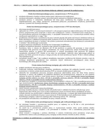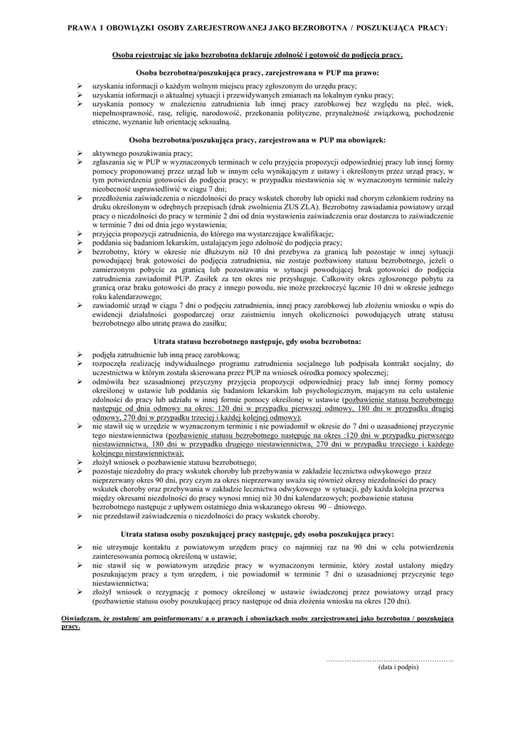 PRAWA I OBOWIĄZKI OSOBY ZAREJESTROWANEJ JAKO BEZROBOTNA / POSZUKUJĄCA PRACY: Osoba rejestrując się jako bezrobotna deklaruje zdolność i gotowość do podjęcia pracy. Osoba bezrobotna/poszukująca pracy, zarejestrowana w PUP ma prawo: uzyskania informacji o kaŜdym wolnym miejscu pracy zgłoszonym do urzędu pracy; uzyskania informacji o aktualnej sytuacji i przewidywanych zmianach na lokalnym rynku pracy; uzyskania pomocy w znalezieniu zatrudnienia lub innej pracy zarobkowej bez względu na płeć, wiek, niepełnosprawność, rasę, religię, narodowość, przekonania polityczne, przynaleŜność związkową, pochodzenie etniczne, wyznanie lub orientację seksualną. Osoba bezrobotna/poszukująca pracy, zarejestrowana w PUP ma obowiązek: aktywnego poszukiwania pracy; zgłaszania się w PUP w wyznaczonych terminach w celu przyjęcia propozycji odpowiedniej pracy lub innej formy pomocy proponowanej przez urząd lub w innym celu wynikającym z ustawy i określonym przez urząd pracy, w tym potwierdzenia gotowości do podjęcia pracy; w przypadku niestawienia się w wyznaczonym terminie naleŜy nieobecność usprawiedliwić w ciągu 7 dni; przedłoŜenia zaświadczenia o niezdolności do pracy wskutek choroby lub opieki nad chorym członkiem rodziny na druku określonym w odrębnych przepisach (druk zwolnienia ZUS ZLA). Bezrobotny zawiadamia powiatowy urząd pracy o niezdolności do pracy w terminie 2 dni od dnia wystawienia zaświadczenia oraz dostarcza to zaświadczenie w terminie 7 dni od dnia jego wystawienia; przyjęcia propozycji zatrudnienia, do którego ma wystarczające kwalifikacje; poddania się badaniom lekarskim, ustalającym jego zdolność do podjęcia pracy; bezrobotny, który w okresie nie dłuŜszym niŜ 10 dni przebywa za granicą lub pozostaje w innej sytuacji powodującej brak gotowości do podjęcia zatrudnienia, nie zostaje pozbawiony statusu bezrobotnego, jeŜeli o zamierzonym pobycie za granicą lub pozostawaniu w sytuacji powodującej brak gotowości do podjęcia zatrudnienia zawiadomił PUP. Zasiłek za ten okres nie przysługuje. Całkowity okres zgłoszonego pobytu za granicą oraz braku gotowości do pracy z innego powodu, nie moŜe przekroczyć łącznie 10 dni w okresie jednego roku kalendarzowego; zawiadomić urząd w ciągu 7 dni o podjęciu zatrudnienia, innej pracy zarobkowej lub złoŜeniu wniosku o wpis do ewidencji działalności gospodarczej oraz zaistnieniu innych okoliczności powodujących utratę statusu bezrobotnego albo utratę prawa do zasiłku; Utrata statusu bezrobotnego następuje, gdy osoba bezrobotna: podjęła zatrudnienie lub inną pracę zarobkową; rozpoczęła realizację indywidualnego programu zatrudnienia socjalnego lub podpisała kontrakt socjalny, do uczestnictwa w którym została skierowana przez PUP na wniosek ośrodka pomocy społecznej; odmówiła bez uzasadnionej przyczyny przyjęcia propozycji odpowiedniej pracy lub innej formy pomocy określonej w ustawie lub poddania się badaniom lekarskim lub psychologicznym, mającym na celu ustalenie zdolności do pracy lub udziału w innej formie pomocy określonej w ustawie (pozbawienie statusu bezrobotnego następuje od dnia odmowy na okres: 120 dni w przypadku pierwszej odmowy, 180 dni w przypadku drugiej odmowy, 270 dni w przypadku trzeciej i kaŜdej kolejnej odmowy); nie stawił się w urzędzie w wyznaczonym terminie i nie powiadomił w okresie do 7 dni o uzasadnionej przyczynie tego niestawiennictwa (pozbawienie statusu bezrobotnego następuje na okres :120 dni w przypadku pierwszego niestawiennictwa, 180 dni w przypadku drugiego niestawiennictwa, 270 dni w przypadku trzeciego i kaŜdego kolejnego niestawiennictwa); złoŜył wniosek o pozbawienie statusu bezrobotnego; pozostaje niezdolny do pracy wskutek choroby lub przebywania w zakładzie lecznictwa odwykowego przez nieprzerwany okres 90 dni, przy czym za okres nieprzerwany uwaŜa się równieŜ okresy niezdolności do pracy wskutek choroby oraz przebywania w zakładzie lecznictwa odwykowego w sytuacji, gdy kaŜda kolejna przerwa między okresami niezdolności do pracy wynosi mniej niŜ 30 dni kalendarzowych; pozbawienie statusu bezrobotnego następuje z upływem ostatniego dnia wskazanego okresu 90 – dniowego. nie przedstawił zaświadczenia o niezdolności do pracy wskutek choroby. Utrata statusu osoby poszukującej pracy następuje, gdy osoba poszukująca pracy: nie utrzymuje kontaktu z powiatowym urzędem pracy co najmniej raz na 90 dni w celu potwierdzenia zainteresowania pomocą określoną w ustawie; nie stawił się w powiatowym urzędzie pracy w wyznaczonym terminie, który został ustalony między poszukującym pracy a tym urzędem, i nie powiadomił w terminie 7 dni o uzasadnionej przyczynie tego niestawiennictwa; złoŜył wniosek o rezygnację z pomocy określonej w ustawie świadczonej przez powiatowy urząd pracy (pozbawienie statusu osoby poszukującej pracy następuje od dnia złoŜenia wniosku na okres 120 dni). Oświadczam, Ŝe zostałem/ am poinformowany/ a o prawach i obowiązkach osoby zarejestrowanej jako bezrobotna / poszukująca pracy. ……………………………………………….. (data i podpis)