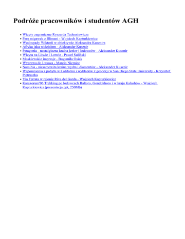 Podróże pracowników i studentów AGH Wizyty zagraniczne Ryszarda Tadeusiewicza Parę migawek z Illimani - Wojciech Kapturkiewicz Wodospady Wiktorii w obiektywie Aleksandra Kusznira Afryka jaką widziałem - Aleksander Kusznir Patagonia - nostalgiczna kraina jezior i lodowców - Aleksander Kusznir Wizyta na Litwie i Łotwie - Paweł Suliński Moskiewskie impresje - Bogumiła Osiak Wyprawa do Lwowa - Marcin Niemiec Namibia - niesamowita kraina wydm i diamentów - Aleksander Kusznir Wspomnienia z pobytu w Californii i wykładów z geodezji w San Diego State University - Krzysztof Pietruszka Via Ferrata w rejonie Riva del Garda - Wojciech Kapturkiewicz Karakorum'06 Trekking po lodowcach Baltoro, Gondokhoro i w kraju Kalashów - Wojciech Kapturkiewicz (prezentacja ppt, 250Mb)