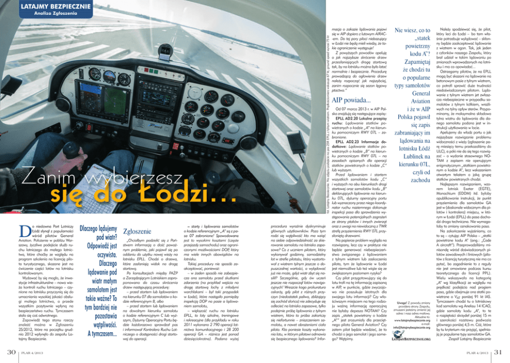 LATAJMY BEZPIECZNIE fot. Latajmy Bezoiecznie. Na zdjęciu podejście na pas 25R EPLL z tylnym wiatrem. Prędkościomierz wskazuje 67 kt, ground speed wynosi 75 kt Analiza Zgłoszenia Zanim wybierzesz się do Łodzi... D o niedawna Port Lotniczy Łódź słynął z popularności wśród pilotów General Aviation. Położenie w pobliżu Warszawy, życzliwe podejście służb ruchu lotniczego do małego lotnictwa, które choćby ze względu na program szkolenia na licencję pilota turystycznego, skazane jest na ćwiczenie części lotów na lotnisku kontrolowanym. Wydawać by się mogło, że inwestycje infrastrukturalne – nowa wieża kontroli ruchu lotniczego – czynione na lotnisku przyczynią się do umacniania wysokiej jakości obsługi małego lotnictwa, a przede wszystkim pozytywnie wpłyną na bezpieczeństwo ruchu. Tymczasem stało się coś odwrotnego. Zapowiedź tego stanu rzeczy znaleźć można w Zgłoszeniu 25/2012, które na początku grudnia 2012 wpłynęło do zespołu Latajmy Bezpiecznie. 30 PLAR 4/2013 Dlaczego lądujemy Zgłoszenie pod wiatr? „Chciałbym podzielić się z Pańinformacją o dość poważOdpowiedź jest stwem nym problemie, jaki pojawił się po do użytku nowej wieży na oczywista. oddaniu lotnisku EPLL. Chodzi o drzewa, zasłaniają widok na drogę Dlaczego które startową. lądowanie pod Po konsultacjach między PAŻP a Zarządzającym Lotniskiem zaprowiatr małym ponowano do czasu skrócenia następującą procedurę: samolotem jest drzew – przed startem lub lądowaniem kierunku 07 dla samolotów o kotakie ważne? To na dzie referencyjnym B, albo przed startem lub lądowaniem tym bardziej nie na– dowolnym kierunku samolotu o kodzie referencyjnym lub wyżpozostawia szym, Dyżurny OperacyjnyC Portu bękażdorazowo sprawdzał pas wątpliwości. dzie i informował Kontrolera Ruchu LotA tymczasem... niczego o dostępności drogi startowej do operacji. – starty i lądowania samolotów o kodzie referencyjnym „A” są z pasa 07 zabronione! Spowodowane jest to wysokimi kosztami (częste przejazdy samochodu) oraz ograniczonymi możliwościami DOP, który ma wiele innych obowiązków na lotnisku. Takiej procedury nie sposób zaakceptować, ponieważ: – w żaden sposób nie zabezpiecza ona samolotu przed skutkami zdarzenia (na przykład wejścia na drogę startową lochy z młodymi warchlakami – był taki przypadek w Łodzi), które nastąpiło pomiędzy inspekcją DOP na pasie a lądowaniem samolotu, – większość ruchu na lotnisku EPLL, to loty szkolne, treningowe i rekreacyjne (dla przykładu w roku 2011 wykonano 2 790 operacji lotnictwa komunikacyjnego i 28 200 operacji GA – różnica jest ponad dziesięciokrotna). Podana wyżej procedura wyraźnie dyskryminuje głównych użytkowników. Poza tym rodzi się wątpliwość kto ma wziąć na siebie odpowiedzialność za skierowanie samolotu na lotnisko zapasowe? Co z uczniem pilotem, który wykonywał godzinny, samodzielny lot w strefie pilotażu, który wystartował z wiatrem tylnym jeszcze o dopuszczalnej wartości, a wylądować już nie może, gdyż wiatr zbyt się nasilił? Szczególnie, gdy ów uczeń jeszcze nie rozpoczął lotów nawigacyjnych! Wreszcie kogo prokuratura oskarży, gdy pilot z różnych przyczyn (niedostatek paliwa, zbliżający się zachód słońca) nie zdecyduje się odlecieć na lotnisko zapasowe, tylko podejmie próbę lądowania z tylnym wiatrem, która to próba zakończy się niefortunnie – zniszczeniem samolotu, a nawet obrażeniami ciała pilota. Kto poniesie koszty wykonania lotu, w którym pilotowi odmawia się bezpiecznego lądowania? Infor- macja o zakazie lądowania pojawi się w AIP dopiero z lutowym AIRAC-em. Do tej pory piloci niebazujący w Łodzi nie będą mieli wiedzy, że takie ograniczenie występuje! Z powyższych powodów apeluję o jak najszybsze skrócenie drzew przesłaniających drogę startową tak, by na lotnisku można było latać normalnie i bezpiecznie. Procedurę prowadzącą do ogłowienia drzew należy rozpocząć jak najszybciej, zanim rozpocznie się sezon lęgowy ptactwa.” AIP powiada... Od 07 marca 2013 r. w AIP Polska znajdują się następujące zapisy: EPLL AD2.20 Lokalne przepisy ruchu: Lądowanie statków powietrznych o kodzie „A” na kierunku pomocniczym RWY 07L – zabronione. EPLL AD2.23 Informacje dodatkowe: Lądowanie statków powietrznych o kodzie „B” na kierunku pomocniczym RWY 07L – na zasadach opisanych dla operacji statków powietrznych o kodzie „C” lub wyższym. Przed lądowaniem i startem wszystkich samolotów kodu „C” i wyższych na obu kierunkach drogi startowej oraz samolotów kodu „B” deklarujących lądowanie na kierunku 07L, dyżurny operacyjny portu lub wyznaczony przez niego koordynator ruchu naziemnego dokonuje inspekcji pasa dla sprawdzenia występowania potencjalnych zagrożeń ze strony ptaków i innych zwierząt oraz z uwagi na niewidoczną z TWR strefę przyziemienia RWY 07L przysłoniętą drzewami. Na papierze problem wygląda na rozwiązany, lecz czy w praktyce nie będzie generować niebezpieczeństwa związanego z lądowaniem z tylnym wiatrem lub zaskoczenia pilota, tym że lądowanie w Łodzi jest niemożliwe lub też wiąże się ze zwiększonym poziomem ryzyka? Czy pilot przygotowujący się do lotu trafi na tę informację zapisaną w AIP, w punkcie, gdzie zwyczajowo nie poszukuje istotnych dla swojego lotu informacji? Czy właściwszym miejscem na tego rodzaju ważną informację operacyjną nie byłaby depesza NOTAM? Czy zapis „statek powietrzny o kodzie „A”” jest zrozumiały dla przeciętnego pilota General Aviation? Czy zatem pilot będzie wiedzieć, że to chodzi o jego samolot i jego samego? Wątpimy. Nie wiesz, co to „statek powietrzny kodu A”? Zapamiętaj że chodzi tu o popularne typy samolotów General Aviation i że w AIP Polska pojawił się zapis zabraniający im lądowania na lotnisku Łódź Lublinek na kierunku 07L, czyli od zachodu U