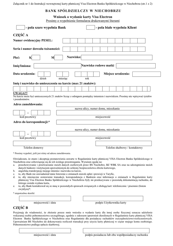 BANK SPÓŁDZIELCZY W NIECHOBRZU Wniosek o wydanie karty