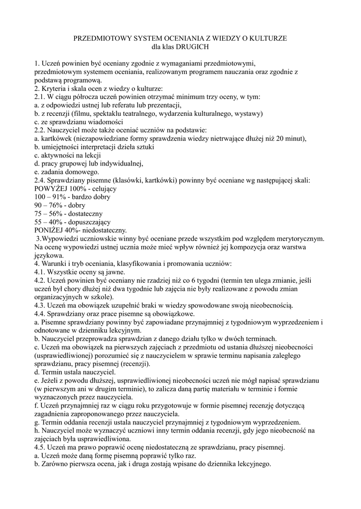 PRZEDMIOTOWY SYSTEM OCENIANIA Z WIEDZY O KULTURZE dla klas DRUGICH 1. Uczeń powinien być oceniany zgodnie z wymaganiami przedmiotowymi, przedmiotowym systemem oceniania, realizowanym programem nauczania oraz zgodnie z podstawą programową. 2. Kryteria i skala ocen z wiedzy o kulturze: 2.1. W ciągu półrocza uczeń powinien otrzymać minimum trzy oceny, w tym: a. z odpowiedzi ustnej lub referatu lub prezentacji, b. z recenzji (filmu, spektaklu teatralnego, wydarzenia kulturalnego, wystawy) c. ze sprawdzianu wiadomości 2.2. Nauczyciel może także oceniać uczniów na podstawie: a. kartkówek (niezapowiedziane formy sprawdzenia wiedzy nietrwające dłużej niż 20 minut), b. umiejętności interpretacji dzieła sztuki c. aktywności na lekcji d. pracy grupowej lub indywidualnej, e. zadania domowego. 2.4. Sprawdziany pisemne (klasówki, kartkówki) powinny być oceniane wg następującej skali: POWYŻEJ 100% - celujący 100 – 91% - bardzo dobry 90 – 76% - dobry 75 – 56% - dostateczny 55 – 40% - dopuszczający PONIŻEJ 40%- niedostateczny. 3.Wypowiedzi uczniowskie winny być oceniane przede wszystkim pod względem merytorycznym. Na ocenę wypowiedzi ustnej ucznia może mieć wpływ również jej kompozycja oraz warstwa językowa. 4. Warunki i tryb oceniania, klasyfikowania i promowania uczniów: 4.1. Wszystkie oceny są jawne. 4.2. Uczeń powinien być oceniany nie rzadziej niż co 6 tygodni (termin ten ulega zmianie, jeśli uczeń był chory dłużej niż dwa tygodnie lub zajęcia nie były realizowane z powodu zmian organizacyjnych w szkole). 4.3. Uczeń ma obowiązek uzupełnić braki w wiedzy spowodowane swoją nieobecnością. 4.4. Sprawdziany oraz prace pisemne są obowiązkowe. a. Pisemne sprawdziany powinny być zapowiadane przynajmniej z tygodniowym wyprzedzeniem i odnotowane w dzienniku lekcyjnym. b. Nauczyciel przeprowadza sprawdzian z danego działu tylko w dwóch terminach. c. Uczeń ma obowiązek na pierwszych zajęciach z przedmiotu od ustania dłuższej nieobecności (usprawiedliwionej) porozumieć się z nauczycielem w sprawie terminu napisania zaległego sprawdzianu, pracy pisemnej (recenzji). d. Termin ustala nauczyciel. e. Jeżeli z powodu dłuższej, usprawiedliwionej nieobecności uczeń nie mógł napisać sprawdzianu (w pierwszym ani w drugim terminie), to zalicza daną partię materiału w terminie i formie wyznaczonych przez nauczyciela. f. Uczeń przynajmniej raz w ciągu roku przygotowuje w formie pisemnej recenzję dotyczącą zagadnienia zaproponowanego przez nauczyciela. g. Termin oddania recenzji ustala nauczyciel przynajmniej z tygodniowym wyprzedzeniem. h. Nauczyciel może wyznaczyć uczniowi inny termin oddania recenzji, gdy jego nieobecność na zajęciach była usprawiedliwiona. 4.5. Uczeń ma prawo poprawić ocenę niedostateczną ze sprawdzianu, pracy pisemnej. a. Uczeń może daną formę pisemną poprawić tylko raz. b. Zarówno pierwsza ocena, jak i druga zostają wpisane do dziennika lekcyjnego. c. Termin poprawy ustala nauczyciel. Nie powinien on przekraczać dwóch tygodni od oddania poprawianej pracy. 4.6. Uczeń ma prawo do jednego nieprzygotowania w ciągu śródrocza. a. W pierwszym tygodniu bezpośrednio po chorobie trwającej nieprzerwanie minimum dwa tygodnie uczeń ma prawo do dodatkowego nieprzygotowania. b. Brak zadania domowego oznacza nieprzygotowanie do zajęć lekcyjnych. c. Uczeń zgłasza nieprzygotowanie pisemnie na kartce przed rozpoczęciem zajęć lekcyjnych. d. Uczeń nie może zgłosić nieprzygotowania przed zapowiedzianym powtórzeniem materiału (także w formie ustnej) i przed zapowiedzianą formą pisemną. e. Nauczyciel odnotowuje nieprzygotowania w dzienniku lekcyjnym.4.7. Zakres dostosowania metod i form pracy do indywidualnych potrzeb ucznia z dysfunkcją. Nauczyciel powinien: • ułatwić uczniowi koncentrację – uczeń powinien siedzieć jak najbliżej nauczyciela, • w trakcie odpowiedzi ustnej stosować pytania pomocnicze, • wydłużyć czas odpowiedzi ustnej, • unikać pytań problemowych, • nie odpytywać z głośnego czytania • starać się w miarę możliwości przygotowywać sprawdziany i kartkówki w formie testów, • uwzględniać trudności w rozumieniu treści podczas samodzielnej pracy z tekstem, dawać więcej czasu, instruować lub zalecać przeczytanie tekstu wcześniej w domu, • nie omawiać błędów ucznia wobec całej klasy, • w przypadku trudności w redagowaniu wypowiedzi pisemnych uczyć tworzenia schematów pracy, planowania kompozycji wypowiedzi (wstęp, rozwinięcie, zakończenie), • nie obniżać ocen za błędy ortograficzne i graficzne w pracach pisemnych • sprawdzać, czy uczeń skończył notatkę z lekcji, w razie potrzeby skracać wielkość notatek, • pozwalać na wykonywanie prac na komputerze, • zachęcać do poprawy zadań, prac pisemnych, sprawdzianów. 4.8. Przy ustalaniu oceny śródrocznej oraz rocznej nauczyciel uwzględnia zdobytą wiedzę i umiejętności, zaangażowanie i aktywność, obecność na zajęciach lekcyjnych. a. Podstawą oceny klasyfikacyjnej są oceny zapisane w dzienniku lekcyjnym. b. Sprawdziany wiadomości, prace pisemne (recenzje) oraz odpowiedzi ustne mają większą wartość od pozostałych ocen uzyskiwanych przez ucznia. c. Ocena nie jest średnią. d. Nauczyciel powiadamia ucznia i wychowawcę o przewidywanej ocenie niedostatecznej na miesiąc przed klasyfikacją roczną. e. Po otrzymaniu propozycji oceny klasyfikacyjnej uczeń ma obowiązek w ciągu tygodnia zadeklarować chęć poprawy. f. Warunki ubiegania się o ocenę wyższą to: • usprawiedliwienie wszystkich nieobecności na zajęciach, • przystąpienie do wszystkich przeprowadzonych przez nauczyciela sprawdzianów oraz oddanie do sprawdzenia prac pisemnych, • przystępowanie do poprawy ocen cząstkowych przeprowadzanych przez nauczyciela w ciągu roku szkolnego, • nienaganne przygotowanie do lekcji od momentu wystawienia oceny proponowanej do 