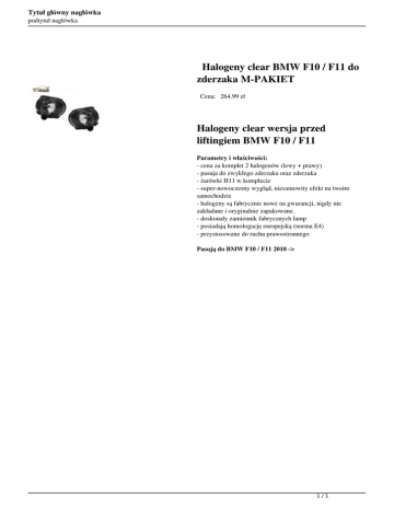 Tytuł główny nagłówka podtytuł nagłówka Halogeny clear BMW F10 / F11 do zderzaka M-PAKIET Cena: 264.99 zł Halogeny clear wersja przed liftingiem BMW F10 / F11 Parametry i właściwości: - cena za komplet 2 halogenów (lewy + prawy) - pasuja do zwykłego zderzaka oraz zderzaka - żarówki H11 w komplecie - super-nowoczesny wygląd, niesamowity efekt na twoim samochodzie - halogeny są fabrycznie nowe na gwarancji, nigdy nie zakładane i oryginalnie zapakowane. - doskonały zamiennik fabrycznych lamp - posiadają homologację europejską (norma E4) - przystosowane do ruchu prawostronnego Pasują do BMW F10 / F11 2010 -> 1/1 Powered by TCPDF (www.tcpdf.org)