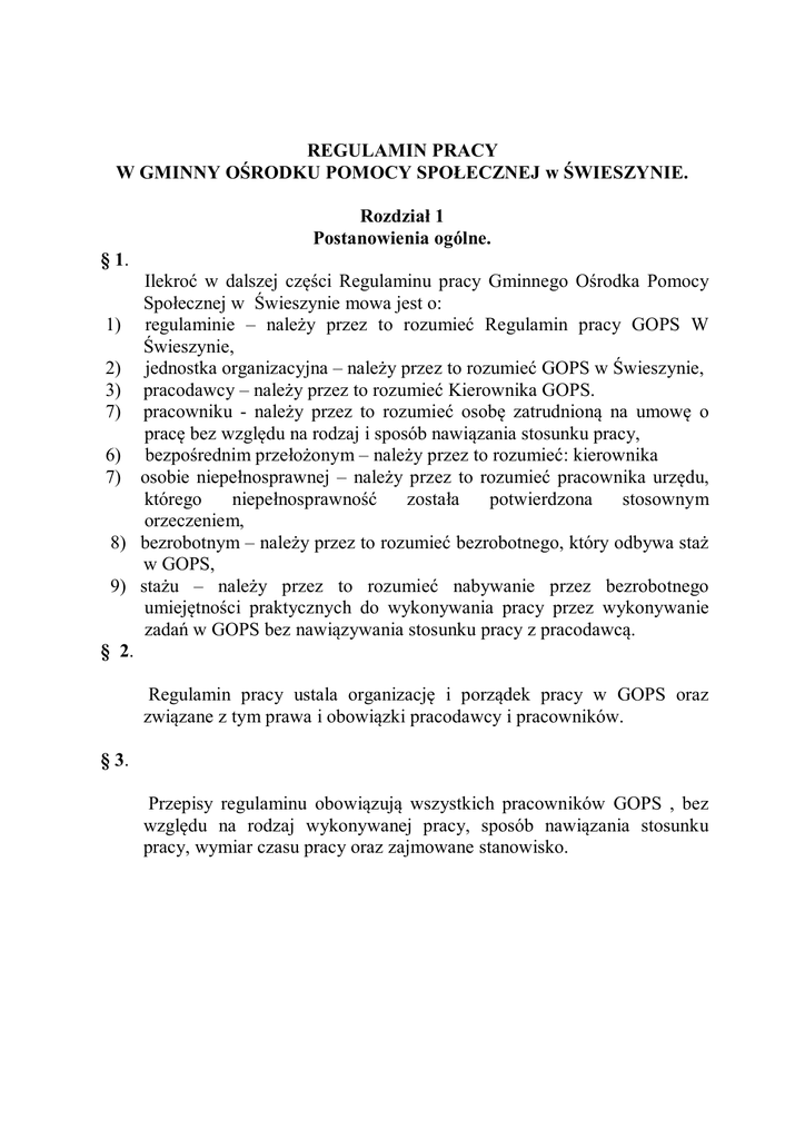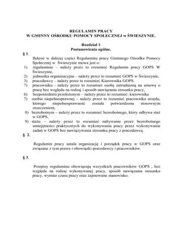 REGULAMIN PRACY W GMINNY OŚRODKU POMOCY SPOŁECZNEJ w ŚWIESZYNIE. Rozdział 1 Postanowienia ogólne. § 1. Ilekroć w dalszej części Regulaminu pracy Gminnego Ośrodka Pomocy Społecznej w Świeszynie mowa jest o: 1) regulaminie – należy przez to rozumieć Regulamin pracy GOPS W Świeszynie, 2) jednostka organizacyjna – należy przez to rozumieć GOPS w Świeszynie, 3) pracodawcy – należy przez to rozumieć Kierownika GOPS. 7) pracowniku - należy przez to rozumieć osobę zatrudnioną na umowę o pracę bez względu na rodzaj i sposób nawiązania stosunku pracy, 6) bezpośrednim przełożonym – należy przez to rozumieć: kierownika 7) osobie niepełnosprawnej – należy przez to rozumieć pracownika urzędu, którego niepełnosprawność została potwierdzona stosownym orzeczeniem, 8) bezrobotnym – należy przez to rozumieć bezrobotnego, który odbywa staż w GOPS, 9) stażu – należy przez to rozumieć nabywanie przez bezrobotnego umiejętności praktycznych do wykonywania pracy przez wykonywanie zadań w GOPS bez nawiązywania stosunku pracy z pracodawcą. § 2. Regulamin pracy ustala organizację i porządek pracy w GOPS oraz związane z tym prawa i obowiązki pracodawcy i pracowników. § 3. Przepisy regulaminu obowiązują wszystkich pracowników GOPS , bez względu na rodzaj wykonywanej pracy, sposób nawiązania stosunku pracy, wymiar czasu pracy oraz zajmowane stanowisko. Rozdział 2 Organizacja pracy. § 4. 1. Z zastrzeżeniem ust. 2 w GOPS obowiązuje zasada wydawania pracownikom poleceń służbowych przez bezpośredniego przełożonego. 1. W szczególnych przypadkach polecenie służbowe może być wydane przez przełożonego wyższego szczebla, wówczas pracownik obowiązany jest polecenie to wykonać, po uprzednim zawiadomieniu swojego bezpośredniego przełożonego. W przypadku nieobecności bezpośredniego przełożonego pracownik polecenie wykonuje, a bezpośredniego przełożonego informuje o tym po jego powrocie do pracy. 2. Jeżeli w przekonaniu pracownika polecenie jest niezgodne z prawem, powinien przedstawić przełożonemu swoje zastrzeżenia; w razie pisemnego potwierdzenia polecenia, powinien je wykonać, zawiadamiając jednocześnie kierownika o zastrzeżeniach. 3. Pracownikowi nie wolno wykonywać poleceń, których wykonanie według jego przekonania stanowiłoby przestępstwo lub groziłoby niepowetowanymi stratami. § 5. 1. W GOPS obowiązują następujące zasady przyjęć interesantów w sprawach skarg i wniosków: 1. kierownik - w każdy poniedziałek od godz. 1500 1600, po wcześniejszym ustaleniu terminu, pozostałe dni od godziny 7.00-15.00 2. Zasady przyjęć interesantów, o których mowa w ust. 1 powinny być podane do wiadomości interesantów w ogólnie dostępnym miejscu, w sposób zwyczajowo przyjęty np. na tablicy ogłoszeń. 3. kierownik może w szczególnie uzasadnionych przypadkach określić inne godziny przyjęć, o których mowa w ust. 1 pkt 2. § 6. Palenie tytoniu w GOPS jest dozwolone wyłącznie w miejscu do tego wyznaczonym. Rozdział 3 Obowiązki pracodawcy. § 7. Pracodawca ma w szczególności obowiązek: 1) zaznajamiania pracowników podejmujących pracę z zakresem czynności, uprawnień i odpowiedzialności oraz sposobem wykonywania pracy na wyznaczonych stanowiskach, 2) organizowania pracy w sposób zapewniający pełne wykorzystanie czasu pracy, oraz osiąganie przez pracowników przy wykorzystaniu ich uzdolnień i kwalifikacji, wysokiej wydajności i należytej jakości pracy, 3) przeciwdziałania dyskryminacji w zatrudnieniu ze względu na płeć, wiek, niepełnosprawność, rasę, religię, narodowość, przekonania polityczne, przynależność związkową, pochodzenie etniczne, wyznanie, orientację seksualną, a także bez względu na zatrudnienie na czas określony lub nie określony, albo w pełnym lub niepełnym wymiarze czasu pracy, 4) zapewnienia bezpiecznych i higienicznych warunków pracy poprzez: a) systematyczne szkolenie pracowników, b) dbanie o sprawność techniczną środków pracy, c) organizowanie i przygotowywanie pracy w sposób zabezpieczający przed wypadkami przy pracy i chorobami zawodowymi, d) realizowanie zaleceń lekarza sprawującego opiekę zdrowotną nad pracownikami. 5) 6) terminowego i prawidłowego wypłacania wynagrodzenia, ułatwiania pracownikom nabywania i podnoszenia kwalifikacji zawodowych, 7) zaspokajania, w miarę posiadania środków, socjalnych potrzeb pracowników, 8) kształtowania kontaktów pracowniczych w zgodzie z zasadami współżycia społecznego, w tym zasadą koleżeństwa, 9) niezwłocznego wydania pracownikowi, w związku z rozwiązaniem lub wygaśnięciem stosunku pracy, świadectwa pracy, bez uzależniania tego od wcześniejszego rozliczenia się pracownika, 10) stosowania obiektywnych i sprawiedliwych kryteriów oceny wykonywanej przez poszczególnych pracowników pracy, 11) prawidłowego prowadzenia dokumentacji pracowniczej i akt osobowych, 12) niestosowania i niedopuszczania do stosowania jakichkolwiek form dyskryminacji, 13) przeciwdziałania mobbingowi, 14) nie dopuszczać do pracy pracownika, jeżeli zachodzi uzasadnione podejrzenie, że stawił się do pracy w stanie po spożyciu alkoholu lub użyciu środków odurzających albo używał ich w czasie godzin lub w miejscu pracy. § 8. Pracodawcy przysługuje w szczególności prawo do: 1) 2) 3) 4) korzystania z wyników wykonywanej przez pracowników pracy, wydawania pracownikom wiążących poleceń dotyczących pracy w zakresie, w jakim polecenia te nie są sprzeczne z obowiązującymi przepisami lub zasadami współżycia społecznego, określania zakresu obowiązków pracowniczych każdego z pracowników, zgodnie z postanowieniami umów o pracę i obowiązujących przepisów, tworzenia i przystępowania do organizacji pracodawców w celu reprezentacji i ochrony swoich interesów. Rozdział 4 Prawa i obowiązki pracownika. § 9. Pracownikom przysługują w szczególności uprawnieni