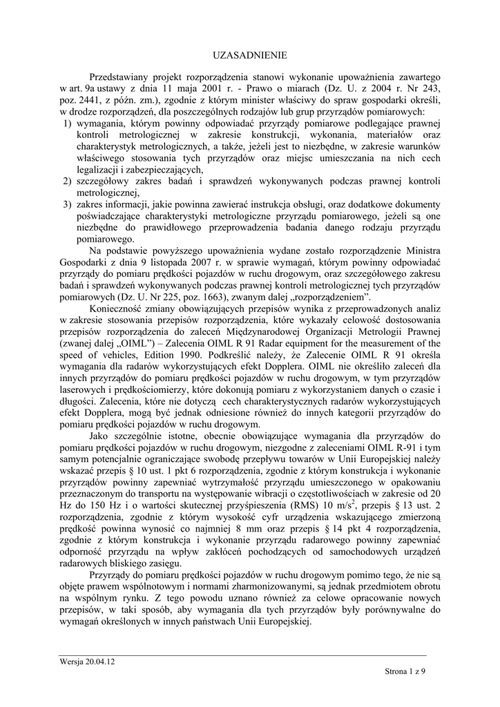 UZASADNIENIE Przedstawiany projekt rozporządzenia stanowi wykonanie upoważnienia zawartego w art. 9a ustawy z dnia 11 maja 2001 r. - Prawo o miarach (Dz. U. z 2004 r. Nr 243, poz. 2441, z późn. zm.), zgodnie z którym minister właściwy do spraw gospodarki określi, w drodze rozporządzeń, dla poszczególnych rodzajów lub grup przyrządów pomiarowych: 1) wymagania, którym powinny odpowiadać przyrządy pomiarowe podlegające prawnej kontroli metrologicznej w zakresie konstrukcji, wykonania, materiałów oraz charakterystyk metrologicznych, a także, jeżeli jest to niezbędne, w zakresie warunków właściwego stosowania tych przyrządów oraz miejsc umieszczania na nich cech legalizacji i zabezpieczających, 2) szczegółowy zakres badań i sprawdzeń wykonywanych podczas prawnej kontroli metrologicznej, 3) zakres informacji, jakie powinna zawierać instrukcja obsługi, oraz dodatkowe dokumenty poświadczające charakterystyki metrologiczne przyrządu pomiarowego, jeżeli są one niezbędne do prawidłowego przeprowadzenia badania danego rodzaju przyrządu pomiarowego. Na podstawie powyższego upoważnienia wydane zostało rozporządzenie Ministra Gospodarki z dnia 9 listopada 2007 r. w sprawie wymagań, którym powinny odpowiadać przyrządy do pomiaru prędkości pojazdów w ruchu drogowym, oraz szczegółowego zakresu badań i sprawdzeń wykonywanych podczas prawnej kontroli metrologicznej tych przyrządów pomiarowych (Dz. U. Nr 225, poz. 1663), zwanym dalej „rozporządzeniem”. Konieczność zmiany obowiązujących przepisów wynika z przeprowadzonych analiz w zakresie stosowania przepisów rozporządzenia, które wykazały celowość dostosowania przepisów rozporządzenia do zaleceń Międzynarodowej Organizacji Metrologii Prawnej (zwanej dalej „OIML”) – Zalecenia OIML R 91 Radar equipment for the measurement of the speed of vehicles, Edition 1990. Podkreślić należy, że Zalecenie OIML R 91 określa wymagania dla radarów wykorzystujących efekt Dopplera. OIML nie określiło zaleceń dla innych przyrządów do pomiaru prędkości pojazdów w ruchu drogowym, w tym przyrządów laserowych i prędkościomierzy, które dokonują pomiaru z wykorzystaniem danych o czasie i długości. Zalecenia, które nie dotyczą cech charakterystycznych radarów wykorzystujących efekt Dopplera, mogą być jednak odniesione również do innych kategorii przyrządów do pomiaru prędkości pojazdów w ruchu drogowym. Jako szczególnie istotne, obecnie obowiązujące wymagania dla przyrządów do pomiaru prędkości pojazdów w ruchu drogowym, niezgodne z zaleceniami OIML R-91 i tym samym potencjalnie ograniczające swobodę przepływu towarów w Unii Europejskiej należy wskazać przepis § 10 ust. 1 pkt 6 rozporządzenia, zgodnie z którym konstrukcja i wykonanie przyrządów powinny zapewniać wytrzymałość przyrządu umieszczonego w opakowaniu przeznaczonym do transportu na występowanie wibracji o częstotliwościach w zakresie od 20 Hz do 150 Hz i o wartości skutecznej przyśpieszenia (RMS) 10 m/s2, przepis § 13 ust. 2 rozporządzenia, zgodnie z którym wysokość cyfr urządzenia wskazującego zmierzoną prędkość powinna wynosić co najmniej 8 mm oraz przepis § 14 pkt 4 rozporządzenia, zgodnie z którym konstrukcja i wykonanie przyrządu radarowego powinny zapewniać odporność przyrządu na wpływ zakłóceń pochodzących od samochodowych urządzeń radarowych bliskiego zasięgu. Przyrządy do pomiaru prędkości pojazdów w ruchu drogowym pomimo tego, że nie są objęte prawem wspólnotowym i normami zharmonizowanymi, są jednak przedmiotem obrotu na wspólnym rynku. Z tego powodu uznano również za celowe opracowanie nowych przepisów, w taki sposób, aby wymagania dla tych przyrządów były porównywalne do wymagań określonych w innych państwach Unii Europejskiej. Wersja 20.04.12 Strona 1 z 9 Ze względu na zakres proponowanych zmian przepisów, wynikający w części także z występujących niejasności interpretacyjnych mających wpływ na stosowanie przepisów rozporządzenia, proponuje się wydanie nowego rozporządzenia. Celem wydania aktu jest: 1) pełne dostosowanie wymagań, którym powinny odpowiadać radarowe przyrządy do pomiaru prędkości pojazdów w ruchu drogowym w zakresie konstrukcji, wykonania, materiałów oraz charakterystyk metrologicznych do wymagań wynikających z Zalecenia OIML R 91, w zakresie uwzględniającym postęp techniczny dokonany w okresie od ogłoszenia przedmiotowego zalecenia, 2) zastosowanie wymagań wynikających z Zalecenia OIML R 91, które dają się zastosować do innych rodzajów przyrządów do pomiaru prędkości pojazdów w ruchu drogowym, poza przyrządami radarowymi, które jak wcześniej wspomniano są jedynym przedmiotem Zalecenia OIML R 91, 3) zapewnienie porównywalności wymagań dla przyrządów do pomiaru prędkości pojazdów w ruchu drogowym do wymagań obowiązujących w innych państwach Unii Europejskiej, 4) umożliwienie producentom stosowania nowych rozwiązań technicznych w przyrządach do pomiaru prędkości pojazdów w ruchu drogowym i w urządzeniach dodatkowych, 5) doprecyzowanie przepisów w zakresie szczegółowego zakresu badań i sprawdzeń wykonywanych podczas prawnej kontroli metrologicznej przyrządów do pomiaru prędkości pojazdów w ruchu drogowym. W projekcie rozporządzenia proponuje się wprowadzenie definicji następujących określeń, które w dotychczas obowiązującym rozporządzeniu nie zostały zdefiniowane: 1) interfejs, 2) nominalna suma kontrolna, 3) pojazd kontrolowany. W rozdziale 2 projektu rozporządzenia określone zostały wymagania w zakresie konstrukcji, wykonania i materiałów przyrządów. Wymagania te wynikają z Zalecenia OIML R 91. W projekcie rozporządzenia wymaganiami wynikającymi z Zalecenia OIML R 91 objęte zostały wszystkie kategorie przyrządów do pomiaru prędkości pojazdów w ruchu drogowym, które podlegają prawnej kontroli metr