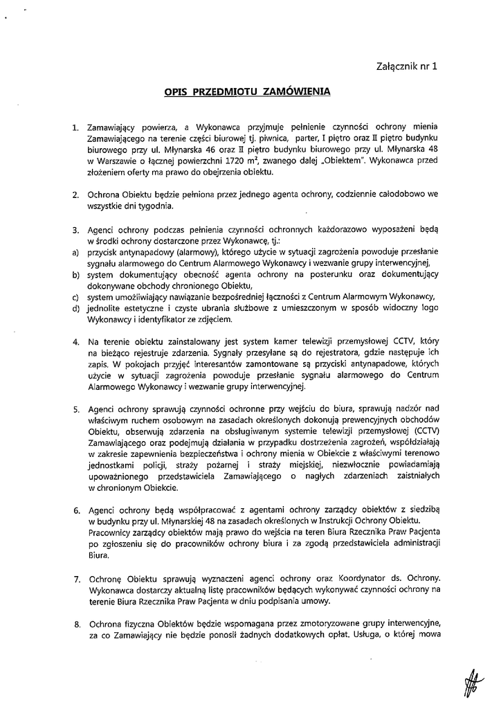 Załącznik nr 1. OPIS PRZEDMIOTU ZAMÓWIENIA 1. Zamawiający powierza, a Wykonawca przyjmuje pełnienie czynności ochrony mienia Zamawiającego na terenie części biurowej tj. piwnica, parter, I piętro oraz II piętro budynku biurowego przy ul. Młynarska 46 oraz U piętro budynku biurowego przy ul. Młynarska 48 w Warszawie o łącznej powierzchni 1720 m2, zwanego dalej „Obiektem~. Wykonawca przed złożeniem oferty ma prawo do obejrzenia obiektu. 2. Ochrona Obiektu będzie pełniona przez jednego agenta ochrony, codziennie całodobowo we wszystkie dni tygodnia. 3. Agenci ochrony podczas pełnienia czynności ochronnych każdorazowo wyposażeni będą w środki ochrony dostarczone przez Wykonawcę, tj.: przycisk antynapadowy (alarmowy), którego użycie w sytuacji zagrożenia powoduje przesłanie sygnału alarmowego do centrum Alarmowego Wykonawcy i wezwanie grupy interwencyjnej, system dokumentujący obecność agenta ochrony na posterunku oraz dokumentujący dokonywane obchody chronionego Obiektu, system umożliwiający nawiązanie bezpośredniej łączności z Centrum Alarmowym Wykonawcy, jednolite estetyczne i czyste ubrania służbowe z umieszczonym w sposób widoczny logo Wykonawcy i identyfikator ze zdjęciem. a) b) c) d) 4. Na terenie obiektu zainstalowany jest system kamer telewizji przemysłowej CCTV, który na bieżąco rejestruje zdarzenia. Sygnały przesyłane są do rejestratora, gdzie następuje ich zapis. W pokojach przyjęć interesantów zamontowane są przyciski antynapadowe, których użycie w sytuacji zagrożenia powoduje przesłanie sygnału alarmowego do Centrum Alarmowego Wykonawcy i wezwanie grupy interwencyjnej. 5. Agenci ochrony sprawują czynności ochronne przy wejściu do biura, sprawują nadzór nad właściwym ruchem osobowym na zasadach określonych dokonują prewencyjnych obchodów Obiektu, obserwują zdarzenia na obsługiwanym systemie telewizji przemysłowej (CCTV) Zamawiającego oraz podejmują działania w przypadku dostrzeżenia zagrożeń, współdziałają w zakresie zapewnienia bezpieczeństwa i ochrony mienia w Obiekcie z właściwymi terenowo jednostkami policji, straży pożarnej i straży miejskiej, niezwłocznie powiadamiają upoważnionego przedstawiciela Zamawiającego o nagłych zdarzeniach zaistniałych w chronionym Obiekcie. 6. Agenci ochrony będą współpracować z agentami ochrony zarządcy obiektów z siedzibą w budynku przy ul. Młynarskiej 48 na zasadach określonych w Instrukcji Ochrony Obiektu. Pracownicy zarządcy obiektów mają prawo do wejścia na teren Biura Rzecznika Praw Pacjenta Po zgłoszeniu się do pracowników ochrony biura i za zgodą przedstawiciela administracji Biura. 7. Ochronę Obiektu sprawują wyznaczeni agenci ochrony oraz Koordynator ds. Ochrony. Wykonawca dostarczy aktualną listę pracowników będących wykonywać czynności ochrony na terenie Biura Rzecznika Praw Pacjenta w dniu podpisania umowy. 8. Ochrona fizyczna Obiektów będzie wspomagana przez zmotoryzowane grupy interwencyjne, za co Zamawiający nie będzie ponosił żadnych dodatkowych opłat. Usługa, o której mowa w zdaniu poprzedzającym polegać będzie na przyjeździe grupy interwencyjnej do Obiektu po otrzymaniu sygnału alarmowego (użyciu przycisku antynapadowego). 9. Środki techniczne wymienione w pkt. 3 stanowią własność Wykonawcy i zostaną na jego koszt zamontowane przed rozpoczęciem świadczenia usług ochrony i zdemontowane z Obiektu w dniu rozwiązania Umowy. 10. Zamawiający zobowiązuje Wykonawcę do bieżącego informowania osoby nadzorującej ze strony Zamawiającego o zauważonych usterkach lub nieprawidłowościach na terenie obiektu, które mogą mieć wpływ na bezpieczeństwo osób, mienia i obiektu, niezwłocznie Po ich ujawnieniu. 11. Wykonawca zobowiązany będzie do wykonywania okresowych (co najmniej raz na kwartał) konserwacji systemu alarmowego oraz kamer, wykonywanych przez pracownika posiadającego odpowiednie uprawnienia i kwalifikacje. Czynności wykonywane w ramach konserwacji: kontrola stanu technicznego systemu CCTV, kontrola połączeń mechanicznych, kablowych, kontrola zamocowań, czyszczenie styków, złącz, elementów zewnętrznych, soczewek, regulacja elementów Systemu, sprawdzenie działania zasilaczy, ustawienie zegarów wewnętrznych. Kontrola systemu SSWiN: sprawdzenie działania detektorów, sprawdzenie działania klawiatur, sygnalizatorów, sprawdzenie ochrony przeciwsabotażowej, działania radiolinii, przycisków antynapadowych, sprawdzenie działania zestawu monitorującego oraz zapisu danych w buforze zdarzeń. 12. W przypadku stwierdzenia niesprawnego systemu alarmowego Wykonawca zobowiązuje się do powiadomienia o uszkodzeniu urządzenia niezwłocznie, nie później jednak niż do zakończenia pełnienia służby przez agenta, który powyższą awarię zidentyfikował. 13. Wykonawca zobowiązany będzie do wykonania czynności ochronnych przy pomocy agentów ochrony przeszkolonych w zakresie metod i sposobów prowadzenia ochrony. Koordynator ds. Ochrony, który zajmuje się organizacją, koordynowaniem ochrony, wyposażeniem przydzielonym ochronie, dokumentacją, bieżącym sprawdzaniem stanu zabezpieczenia Obiektu zobowiązany jest posiadać licencję pracownika ochrony fizycznej co najmniej I stopnia. 14. Pracownicy ochrony wykonujący obowiązki na terenie Biura Rzecznika Praw Pacjenta oraz Koordynator ds. Ochrony zobowiązani są do zapoznania się i przestrzegania ustaleń zapisanych w Instrukcji Bezpieczeństwa Pożarowego dla Obiektu ul. Młynarska 46 oraz ul. Młynarska 48 U p. 15. Wszelkie działania przy wykonywaniu zadań ochrony powinny być wykonywane z poszanowaniem godności osobistej i w sposób możliwie najmniej naruszający dobra osobiste osób, w stosunku do których zostały podjęte oraz zgodnie zobowiązującym prawem. 16. Wykonawca zapewni ścisłe przestrzeganie poufności i ochronę wszelkich danych i informacji dotyczących Obiektu oraz osób 